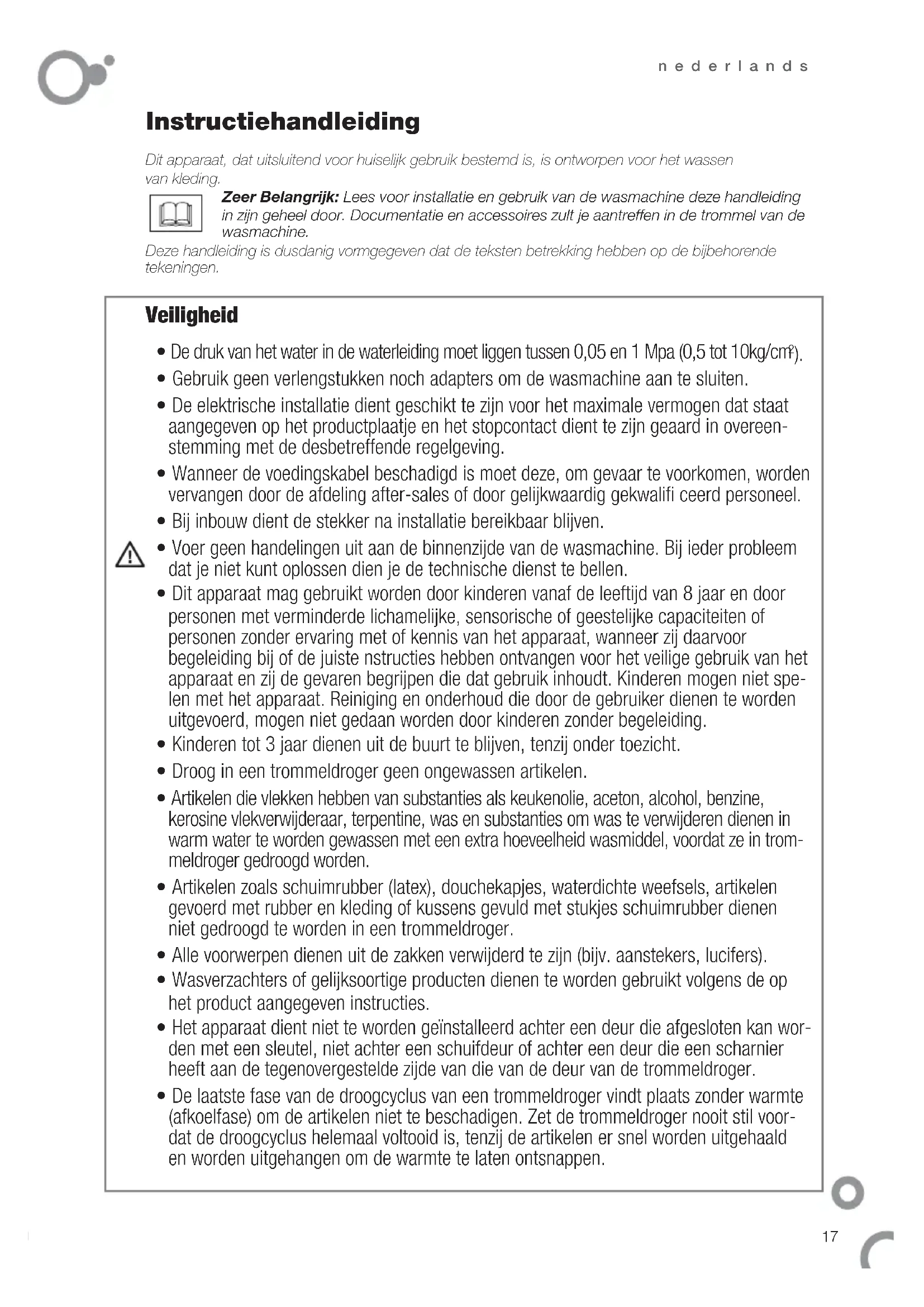 - De laatste fase van de droogcyclus van een trommeldroger vindt plaats zonder warmte (afkoelfase) om de artikelen niet te beschadigen. Zet de trommeldroger nooit stil voor- dat de droogcyclus helemaal voltooid is, tenzij de artikelen er snel worden uitgehaald en worden uitgehangen om de warmte te laten ontsnappen. Dit apparaat, dat uitsluitend voor huiselijk gebruik bestemd is, is ontworpen voor het wassen van kleding. Zeer Belangrijk: Lees voor installatie en gebruik van de wasmachine deze handleiding in zijn geheel door. Documentatie en accessoires zult je aantreffen in de trommel van de wasmachine. Deze handleiding is dusdanig vormgegeven dat de teksten betrekking hebben op de bijbehorende tekeningen. Veiligheid18 nederlands