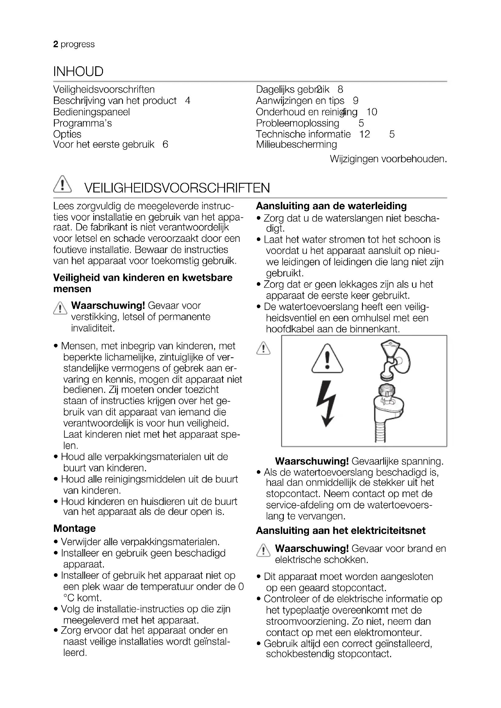 - Gebruik altijd een correct geïnstalleerd, schokbestendig stopcontact. 2 progress• Gebruik geen meerwegstekkers en ver- lengsnoeren.