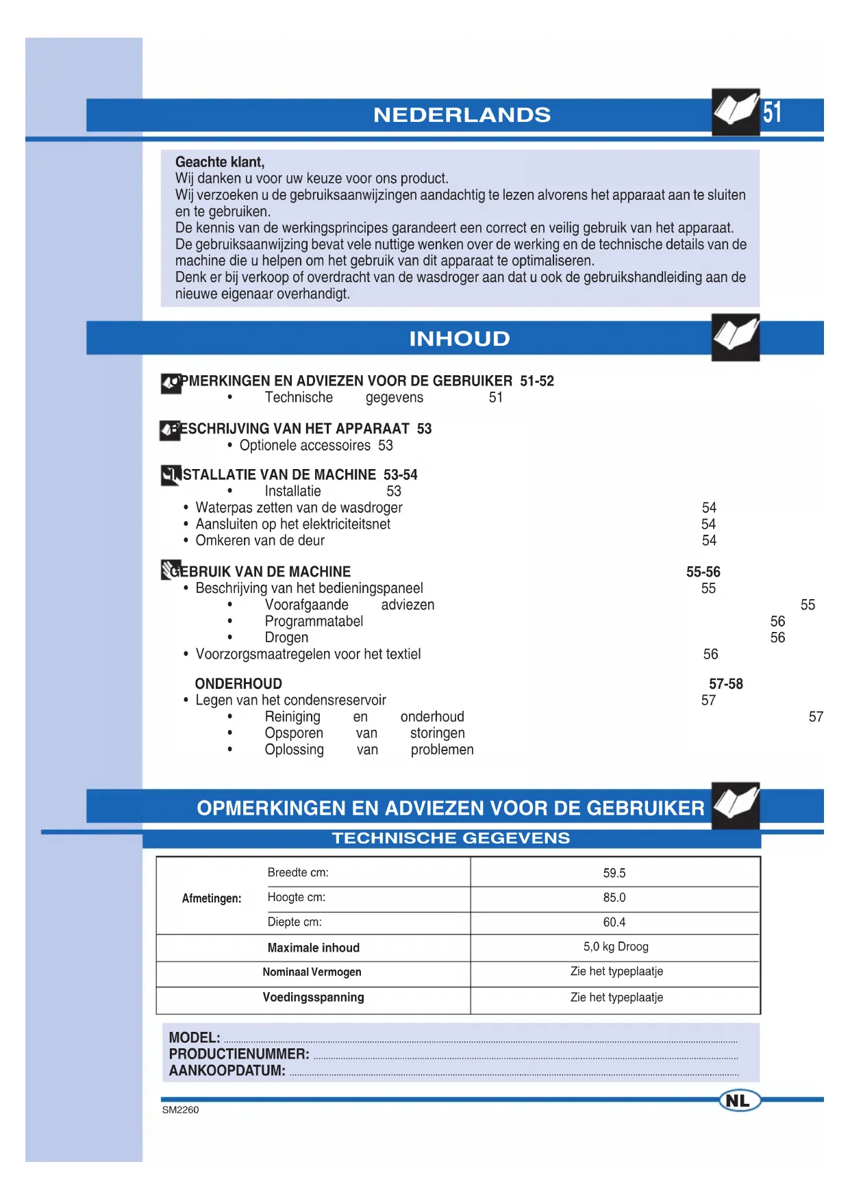 5,0 kg DroogZie het typeplaatjeZie het typeplaatjeMaximale inhoudVoedingsspanningNominaal Vermogen TECHNISCHE GEGEVENS OPMERKINGEN EN ADVIEZEN VOOR DE GEBRUIKER 51-52