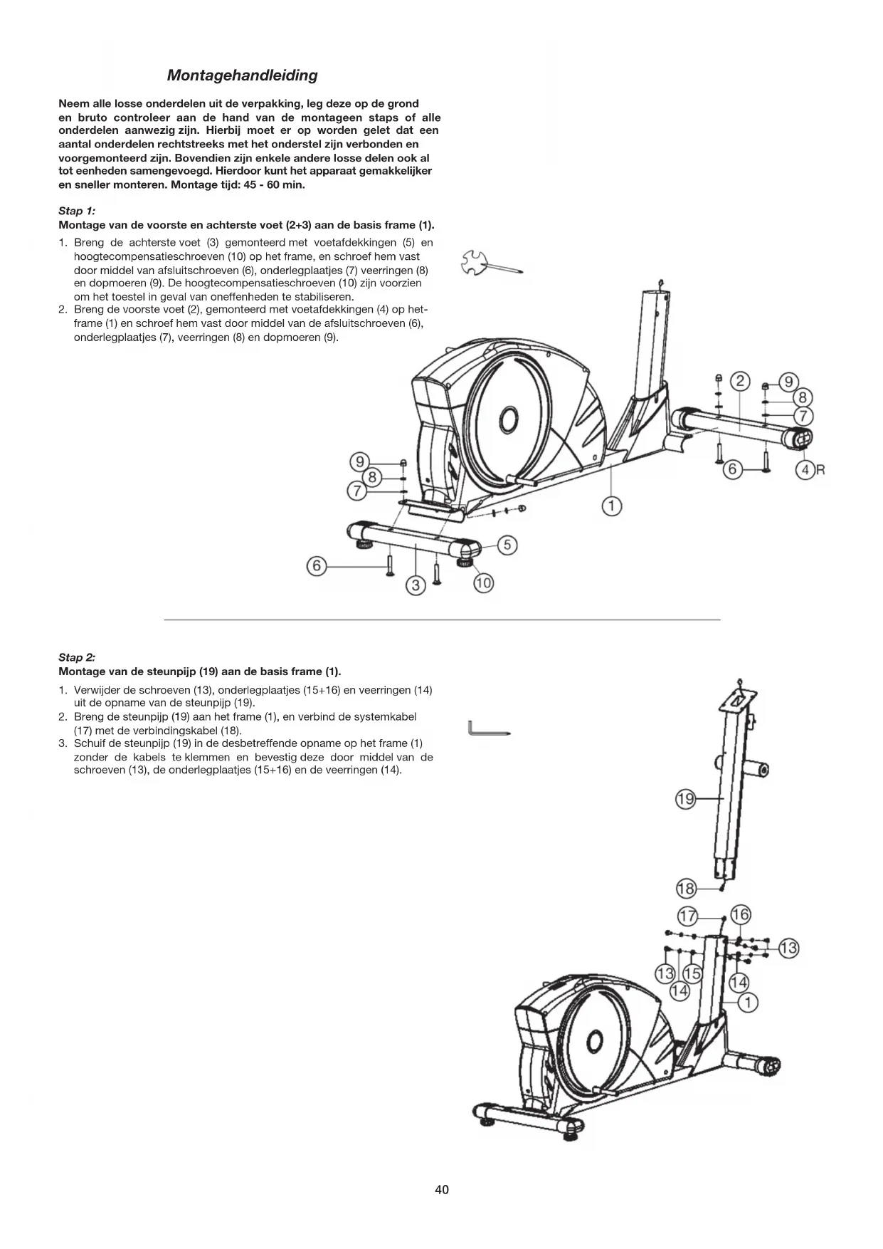 - Belastbaar met een lichaamsgewicht tot ca. 150 kg Afmeting: ca. L 150 x B 66 x H 157 cm Gewicht van het product: 54kg Training ruimte: minstens 3,5m² 0 5 10 15 20 25 30 35 40 50 60 70 80 90 100 mm39 Nederlands Afbeeldings- Beschrijving Afmetingen Aantal Gemonteerd aan ET-nummer nr. mm stuks afbeeldingsnr. 41L Linkse Handvatbuis 1 38 33-9128-18-SI 41R Rechtse handvatbuis 1 38 33-9128-19-SI 42 Kunststoflager voor steunpijp 4 41 36-9128-65-BT 43 Kunststoflager voor handvat 2 19 36-9128-66-BT 44 Greep as 1 19 33-9128-20-SI 45 Handvat overtrek 2 41 36-9128-67-BT 46 Handpulseenheid 2 50 36-9128-68-BT 47 Kabel dop 4 41+53 36-9821-13-BT 48 Handvatbeugel 1 19 33-9128-21-SI 49 Grep overtrek 1 48 36-9128-69-BT 50 Puls verbindingskabel 1 46+55 36-9128-54-BT 51 Klemstuk 1 19+48 33-9128-22-SI 52 Dop 2 48 36-9128-70-BT 53a Steunpijpafdekking a 1 19+53b 36-9128-71-BT 53b Steunpijpafdekking b 1 19+53a 36-9128-72-BT 54 Eindknob 1 41 36-9128-73-BT 55 Computer 1 19 36-9128-53-BT 56 Nettoestel 26V~/2.5A 1 63 36-9109-11-BT 57 Schroef 4 55 39-9903-SW 58L Linkse bekleding 1 1+58R 36-9128-51-BT 58R Rechtse bekleding 1 1+58L 36-9128-52-BT 59 Asmoer M10×1.25 2 79 39-9820-SI 60 Ronde bekleding 2 12 36-9128-50-BT 61 Schroef 4.2x25 6 58L+58R 39-9909-SW 62 Schroef 4.2x10 14 12+60 39-10188 63 AC Kabel 1 67 36-9109-71-BT 64 Vastzetschijf C 20 2 79 36-9925520-BT 65 Kogellager 6904Z 2 1+79 36-9217-32-BT 66 Remssystemkabel 1 67+70 36-9128-74-BT 67 Controleenheid 1 1+17 36-9128-75-BT 68 Vierkante dop 1 1 36-9128-76-BT 69 Ovale dop 1 1 36-9128-77-BT 70 Vliegwiel 1 1 33-9128-23-SI 71 Schroef M6x12 4 70 39-10078-SW 72 Onderlegplatje 6//12 4 71 39-9863 73 Voetvatopname 2 28 33-9128-24-SI 74 Afstandstuk 1 2 85 36-9128-12-BT 75 Schroef M6x16 4 76 39-9826 76 Spanbeugel 1 70 33-9128-25-SI 77 Schijf golfen 20//27 1 79 36-9217-31-BT 78 Aandrijfschijf 1 79 36-9128-78-BT 79 Krukarmas 1 78 33-9128-26-SI 80 Staalring 1 78 33-9128-27-SI 81 Zelfborgende moer M6 4 75 39-9861 82 Basis frame afdekking 1 1 36-9128-79-BT 83 Spanveer 1 76 36-9128-80-BT 84 Onderlegplatje 5//16 3 85 39-10130-CR 85 Schroef M5x15 3 76 39-9988 86 Kogellager 6203-RS 2 76 36-9805-31-BT 87 Onderlegplatje 1 88 39-9993 88 Schroef M6x15 1 76 39-10120-SW 89 Flakke riem PJ6 480 1 70+78 36-9128-81-BT 90 Asafdekking 2 60 36-9128-82-BT 91 Sensor 1 1+67 36-9128-83-BT 92 Moer M8 1 24 39-9818 93 Afstandstuk 2 1 85 36-9128-84-BT 94 Magneet 1 78 36-9128-85-BT 95 Werktuig Set 1 36-9128-86-BT 96 Montage- en bedieningshandleiding 1 36-9128-87-BT40 Montagehandleiding Neem alle losse onderdelen uit de verpakking, leg deze op de grond en bruto controleer aan de hand van de montageen staps of alle onderdelen aanwezig zijn. Hierbij moet er op worden gelet dat een aantal onderdelen rechtstreeks met het onderstel zijn verbonden en voorgemonteerd zijn. Bovendien zijn enkele andere losse delen ook al tot eenheden samengevoegd. Hierdoor kunt het apparaat gemakkelijker en sneller monteren. Montage tijd: 45 - 60 min. Stap 1: Montage van de voorste en achterste voet (2+3) aan de basis frame (1).