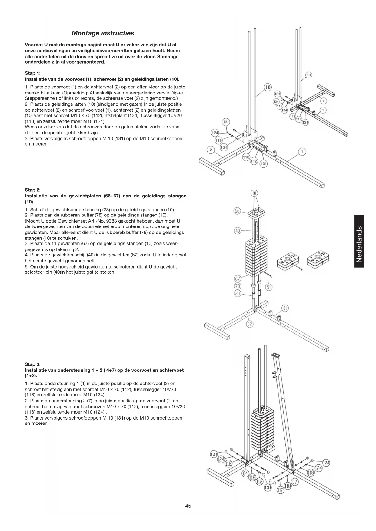 - Bij het gebruik van het apparaat, met name bij de dips-leggers, erop letten dat steeds een goede hoofdbedekking en kleding worden gedragen. De kleding moet goed aansluiten. Zodat haren of kledingstukken nergens achechter blijven haken c.q. de haren en de kleding in een bewegend onderdeel kan worden getrokken.