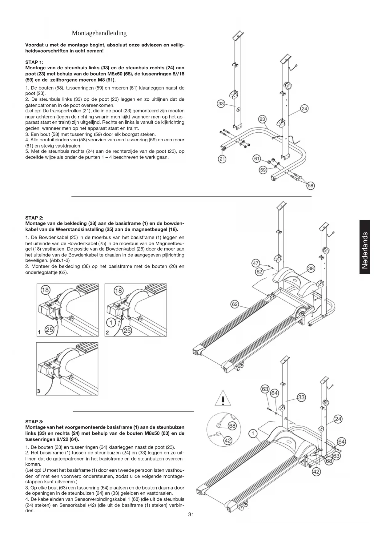 - Voor aanvang van de training moet hetbasis frame uitgeklap en het apparaat met de verilgheitsknob (54) worden geborgd.