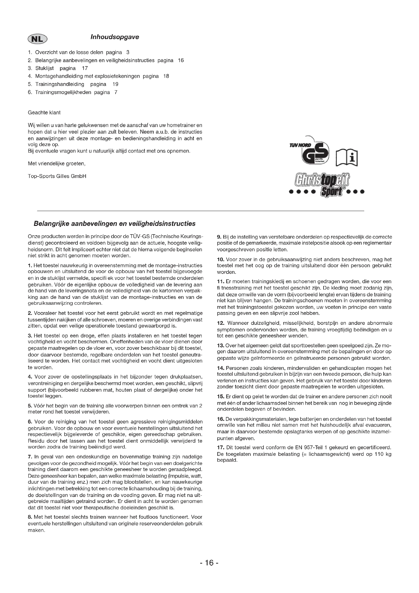 Wij wilnen u van harte gelukwensen met de aanschaf van uw hometrainer en hopen dat u hier veel plezier aan zult beleven. Neem a.u.b. de instructies en aanwijzingen uit deze montage- en bedieningshandleiding in ache en volg.Deze op.