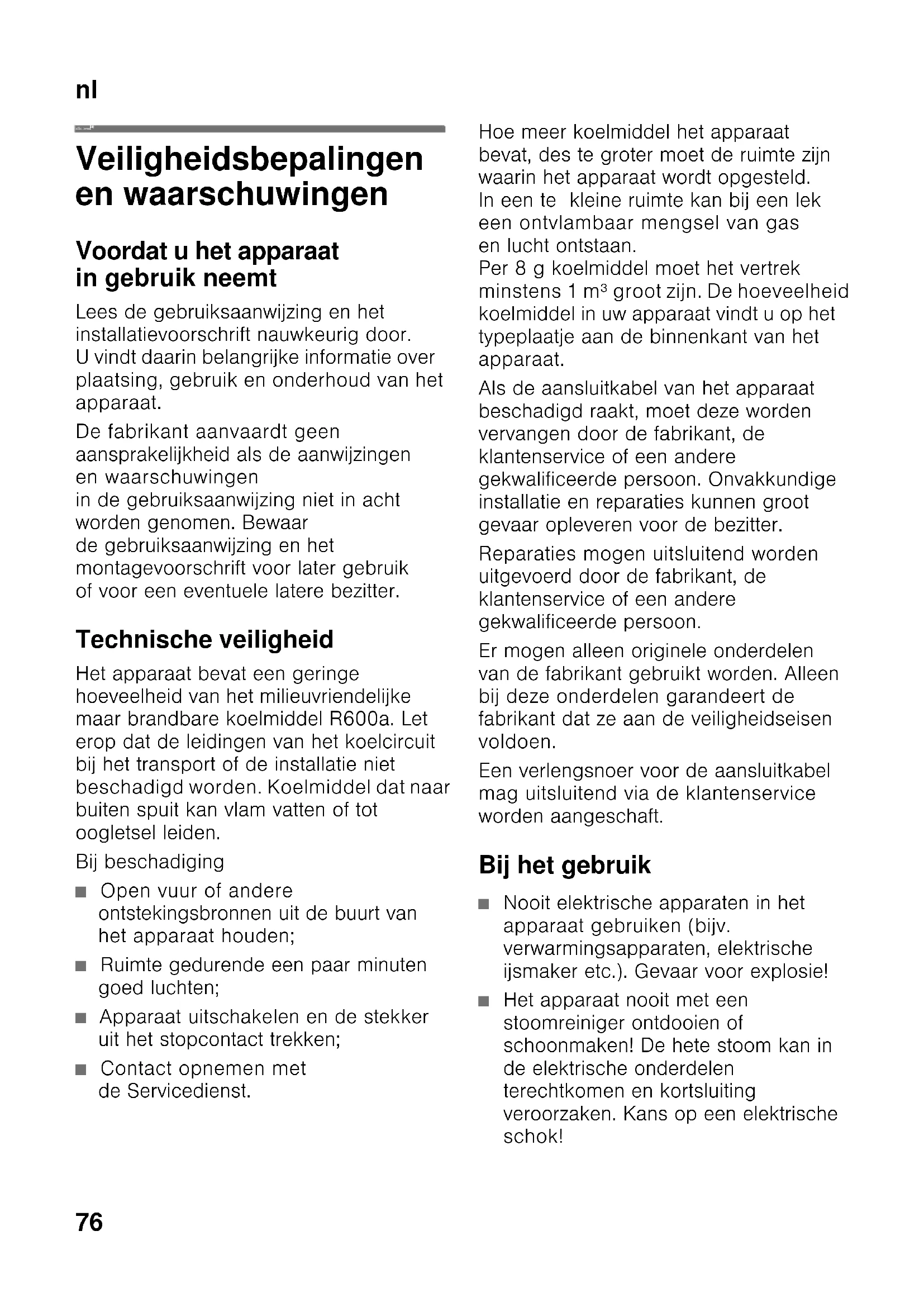 nlIn houd nlGebruiksaanwijzing Veiligheidsbepalingen en waarschuwingen Voordat u het apparaat in gebruik neemt Lees de gebruiksaanwijzing en het installatievoorschrift nauwkeurig door. U vindt daarin belangrijke informatie over plaatsing, gebruik en onderhoud van het apparaat. De fabrikant aanvaardt geen aansprakelijkheid als de aanwijzingen en waarschuwingen in de gebruiksaanwijzing niet in acht worden genomen. Bewaar de gebruiksaanwijzing en het montagevoorschrift voor later gebruik of voor een eventuele latere bezitter. Technische veiligheid Het apparaat bevat een geringe hoeveelheid van het milieuvriendelijke maar brandbare koelmiddel R600a. Let erop dat de leidingen van het koelcircuit bij het transport of de installatie niet beschadigd worden. Koelmiddel dat naar buiten spuit kan vlam vatten of tot oogletsel leiden. Bij beschadiging ■ Open vuur of andere ontstekingsbronnen uit de buurt van het apparaat houden; ■ Ruimte gedurende een paar minuten goed luchten; ■ Apparaat uitschakelen en de stekker uit het stopcontact trekken; ■ Contact opnemen met de Servicedienst. Hoe meer koelmiddel het apparaat bevat, des te groter moet de ruimte zijn waarin het apparaat wordt opgesteld. In een te kleine ruimte kan bij een lek een ontvlambaar mengsel van gas en lucht ontstaan. Per 8 g koelmiddel moet het vertrek minstens 1 m³ groot zijn. De hoeveelheid koelmiddel in uw apparaat vindt u op het typeplaatje aan de binnenkant van het apparaat. Als de aansluitkabel van het apparaat beschadigd raakt, moet deze worden vervangen door de fabrikant, de klantenservice of een andere gekwalificeerde persoon. Onvakkundige installatie en reparaties kunnen groot gevaar opleveren voor de bezitter. Reparaties mogen uitsluitend worden uitgevoerd door de fabrikant, de klantenservice of een andere gekwalificeerde persoon. Er mogen alleen originele onderdelen van de fabrikant gebruikt worden. Alleen bij deze onderdelen garandeert de fabrikant dat ze aan de veiligheidseisen voldoen. Een verlengsnoer voor de aansluitkabel mag uitsluitend via de klantenservice worden aangeschaft. Bij het gebruik ■ Nooit elektrische apparaten in het apparaat gebruiken (bijv. verwarmingsapparaten, elektrische ijsmaker etc.). Gevaar voor explosie! ■ Het apparaat nooit met een stoomreiniger ontdooien of schoonmaken! De hete stoom kan in de elektrische onderdelen terechtkomen en kortsluiting veroorzaken. Kans op een elektrische schok!nl