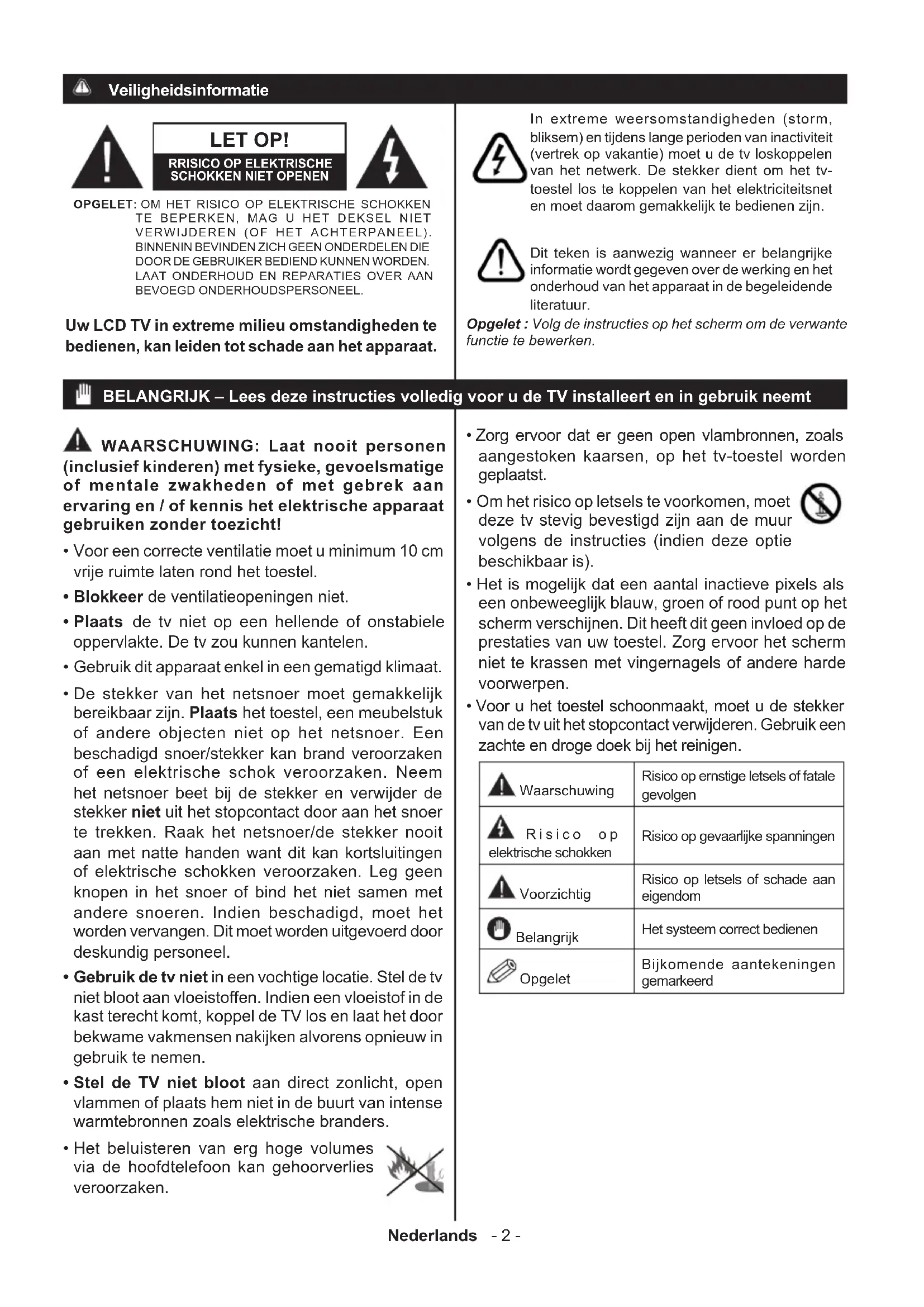 BELANGRIJK – Lees deze instructies volledig voor u de TV installeert en in gebruik neemt