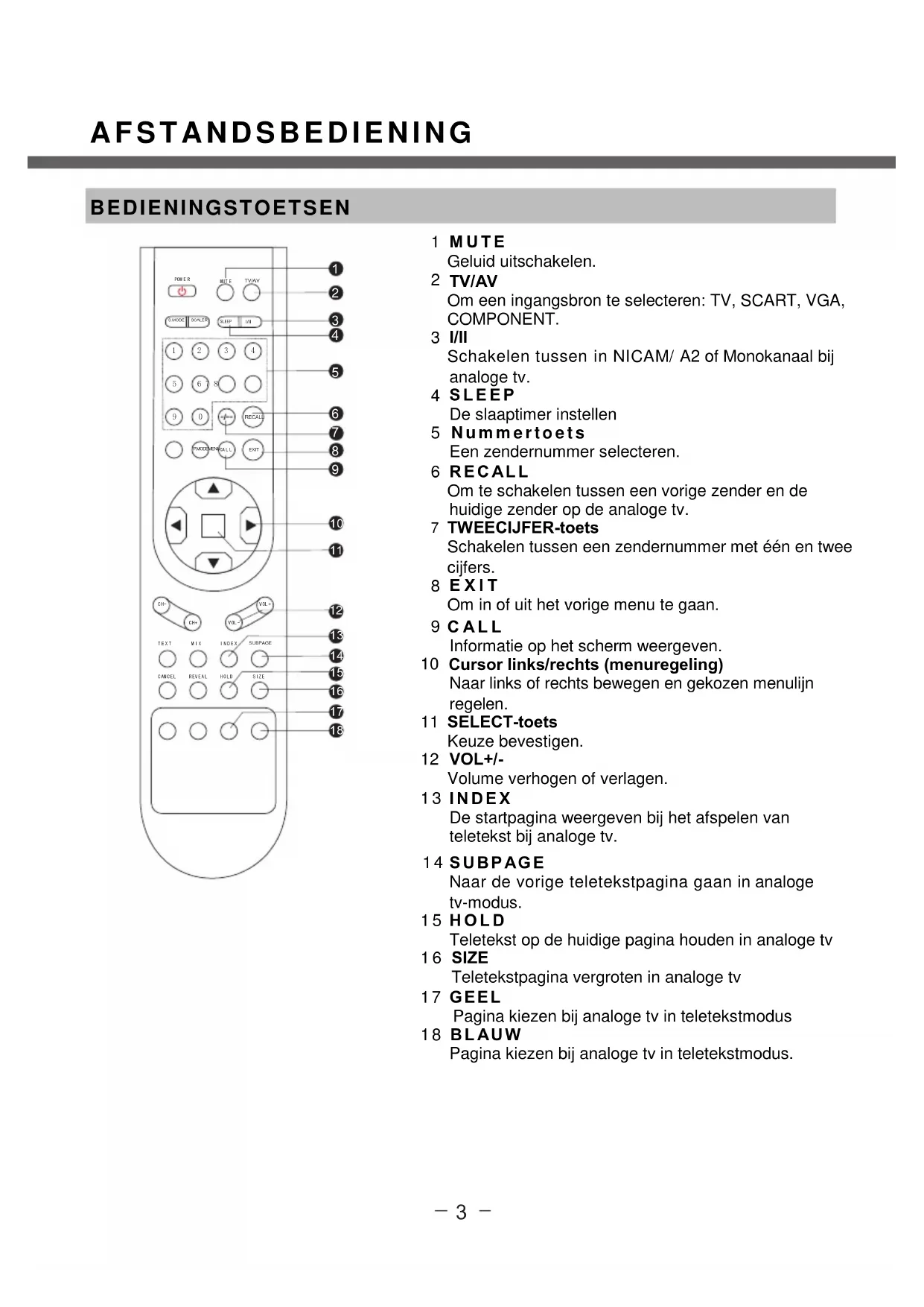 6 RECALL Om te schakelen:tussen een vorige zender en de huidige zender op de analoge tv.
