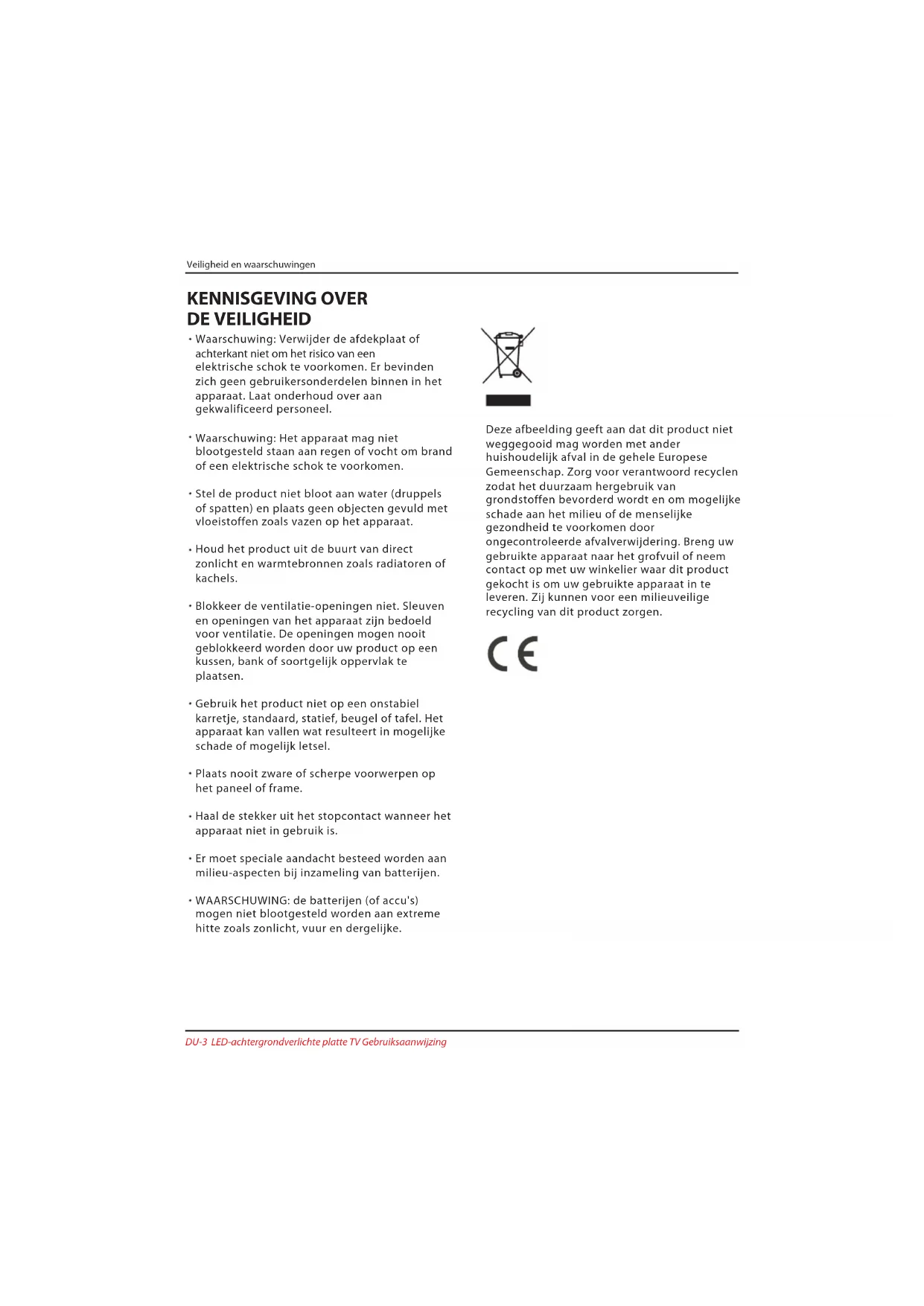 NIET OPENEN LET OP!MAAK DE AFDEKPLAAT (OF ACHTERKANT) NIET OPEN, DIT OM HET RISICO VAN EEN ELEKTRISCHE SCHOK TE VOORKOMEN. ER BEVINDEN ZICH GEEN GEBRUIKERSONDERDELEN IN DIT APPARAAT. NEEMT U CONTACT OP MET DE KLANTENDIENST VOOR EVENTUELE PROBLEMEN. ER BEVINDT ZICH EEN BLIKSEMSCHICHT/PIJLSYMBOOL IN DE DRIEHOEK. DIT SYMBOOL GEEFT AAN DAT ER ZICH EEN HOOG VOLTAGE BINNENIN BEVINDT. HET KAN GEVAARLIJK ZIJN OM ELKE VORM VAN CONTACT TE MAKEN MET DE ONDERDELEN BINNENIN DIT PRODUCT. ER BEVINDT ZICH EEN UITROEPTEKEN IN DE DRIEHOEK: DIT SYMBOOL ATTENDEERT U EROP DAT ER BELANGRIJKE LITERATUUR MEEGELEVERD IS BIJ DIT PRODUCT BETREFFENDE HET ONDERHOUD EN INBEDRIJFSTELLING. LET OP:PLAATS HET TV-TOESTEL NIET IN DE BUURT VAN VOCHTIGHEID, DIT OM HET RISICO VAN ELEKTRISCHE SCHOKKEN EN BRAND TE VERMIJDEN. GEBRUIK GEEN SCHURENDE SCHOONMAAKMIDDELEN DIE KRASSEN OF SCHADE AAN HET LCD-SCHERM KUNNEN AANBRENGEN. VOORKOM CONTACT MET VOORWERPEN DIE HET LCD-SCHERM KUNNEN BESCHADIGEN. OPMERKING:HET ONDERHOUDEN VAN HET APPARAAT DOOR UZELF IS NIET TOEGESTAAN EN KAN TOT LETSEL LEIDEN, OF TOT SCHADE AAN HET PRODUCT. NEEM CONTACT OP MET DE KLANTENDIENST VOOR AL HET ONDERHOUD. LED-achtergrondverlichte platte TV Gebruiksaanwijzing DU-2KENNISGEVING OVER DE VEILIGHEID Waarschuwing: Verwijder de afdekplaat of achterkant niet om het risico van een elektrische schok te voorkomen. Er bevinden zich geen gebruikersonderdelen binnen in het apparaat. Laat onderhoud over aan gekwalificeerd personeel. Waarschuwing: Het apparaat mag niet blootgesteld staan aan regen of vocht om brand of een elektrische schok te voorkomen. Stel de product niet bloot aan water (druppels of spatten) en plaats geen objecten gevuld met vloeistoffen zoals vazen op het apparaat. Houd het product uit de buurt van direct zonlicht en warmtebronnen zoals radiatoren of kachels. Blokkeer de ventilatie-openingen niet. Sleuven en openingen van het apparaat zijn bedoeld voor ventilatie. De openingen mogen nooit geblokkeerd worden door uw product op een kussen, bank of soortgelijk oppervlak te plaatsen. Gebruik het product niet op een onstabiel karretje, standaard, statief, beugel of tafel. Het apparaat kan vallen wat resulteert in mogelijke schade of mogelijk letsel. Plaats nooit zware of scherpe voorwerpen op het paneel of frame. Haal de stekker uit het stopcontact wanneer het apparaat niet in gebruik is. Er moet speciale aandacht besteed worden aan milieu-aspecten bij inzameling van batterijen. WAARSCHUWING: de batterijen (of accu's) mogen niet blootgesteld worden aan extreme hitte zoals zonlicht, vuur en dergelijke. Deze afbeelding geeft aan dat dit product niet weggegooid mag worden met ander huishoudelijk afval in de gehele Europese Gemeenschap. Zorg voor verantwoord recyclen zodat het duurzaam hergebruik van grondstoffen bevorderd wordt en om mogelijke schade aan het milieu of de menselijke gezondheid te voorkomen door ongecontroleerde afvalverwijdering. Breng uw gebruikte apparaat naar het grofvuil of neem contact op met uw winkelier waar dit product gekocht is om uw gebruikte apparaat in te leveren. Zij kunnen voor een milieuveilige recycling van dit product zorgen. Veiligheid en waarschuwingen DU-3 LED-achtergrondverlichte platte TV GebruiksaanwijzingDim:515*320mm(不包括底座) Waarschuwing Deze televisie-ontvanger gebruikt hoge spanningen tijdens de werking. Verwijder de afdekplaat of achterkant van dit apparaat niet. Laat onderhoud aan gekwalificeerd personeel over.