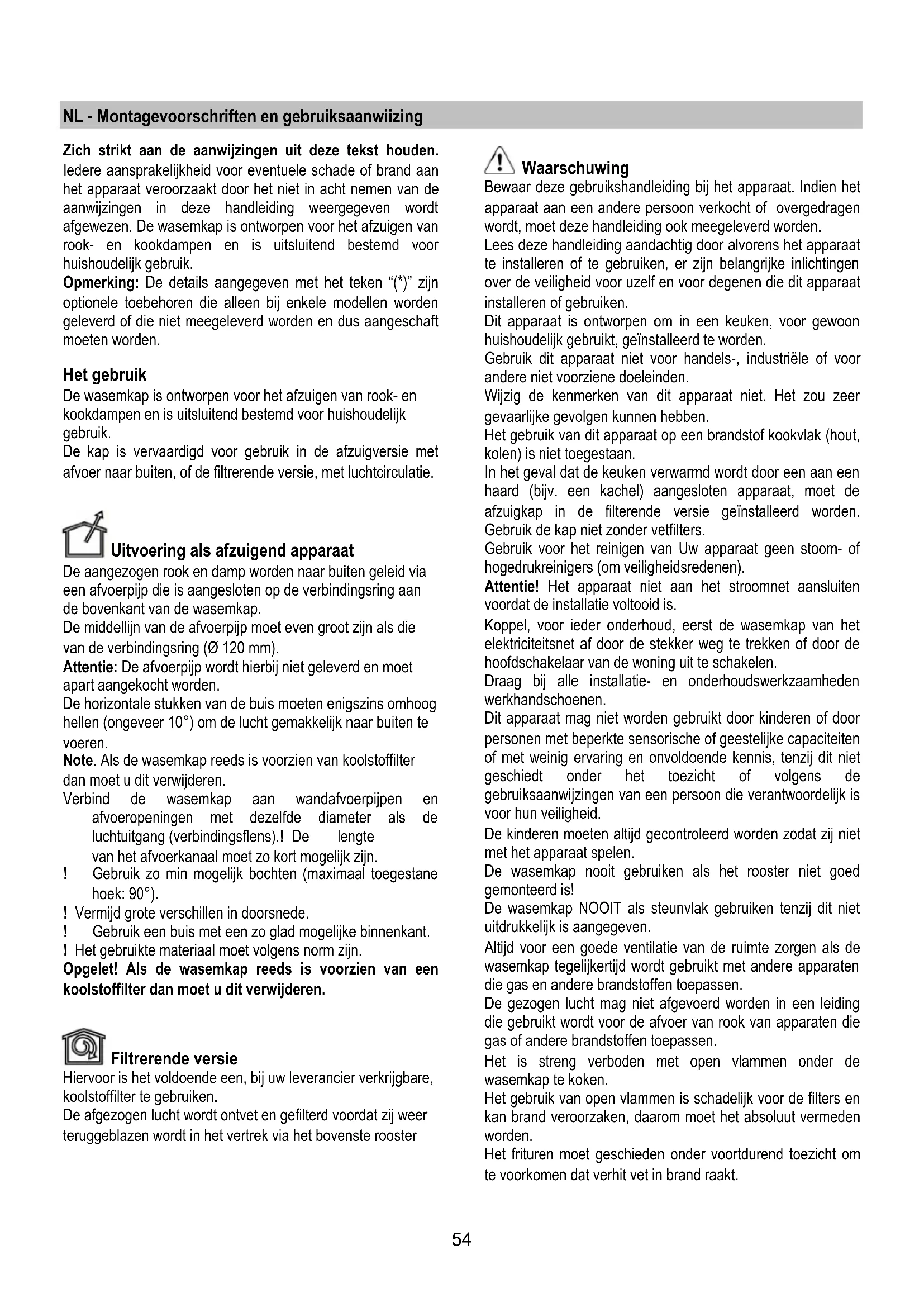 - Servicedienst NL - Montagevoorschriften en gebruiksaanwiizing Zich strikt aan de aanwijzingen uit deze tekst houden. Iedere aansprakelijkheid voor eventuele schade of brand aan het apparaat veroorzaakt door het niet in acht nemen van de aanwijzingen in deze handleiding weergegeven wordt afgewezen. De wasemkap is ontworpen voor het afzuigen van rook- en kookdampen en is uitsluitend bestemd voor huishoudelijk gebruik. Opmerking: De details aangegeven met het teken “(*)” zijn optionele toebehoren die alleen bij enkele modellen worden geleverd of die niet meegeleverd worden en dus aangeschaft moeten worden. Het gebruik De wasemkap is ontworpen voor het afzuigen van rook- en kookdampen en is uitsluitend bestemd voor huishoudelijk gebruik. De kap is vervaardigd voor gebruik in de afzuigversie met afvoer naar buiten, of de filtrerende versie, met luchtcirculatie. Uitvoering als afzuigend apparaat De aangezogen rook en damp worden naar buiten geleid via een afvoerpijp die is aangesloten op de verbindingsring aan de bovenkant van de wasemkap. De middellijn van de afvoerpijp moet even groot zijn als die van de verbindingsring (Ø 120 mm). Attentie: De afvoerpijp wordt hierbij niet geleverd en moet apart aangekocht worden. De horizontale stukken van de buis moeten enigszins omhoog hellen (ongeveer 10°) om de lucht gemakkelijk naar buiten te voeren. Note. Als de wasemkap reeds is voorzien van koolstoffilter dan moet u dit verwijderen. Verbind de wasemkap aan wandafvoerpijpen en afvoeropeningen met dezelfde diameter als de luchtuitgang (verbindingsflens).! De lengte van het afvoerkanaal moet zo kort mogelijk zijn. ! Gebruik zo min mogelijk bochten (maximaal toegestane hoek: 90°). ! Vermijd grote verschillen in doorsnede. ! Gebruik een buis met een zo glad mogelijke binnenkant. ! Het gebruikte materiaal moet volgens norm zijn. Opgelet! Als de wasemkap reeds is voorzien van een koolstoffilter dan moet u dit verwijderen. Filtrerende versie Hiervoor is het voldoende een, bij uw leverancier verkrijgbare, koolstoffilter te gebruiken. De afgezogen lucht wordt ontvet en gefilterd voordat zij weer teruggeblazen wordt in het vertrek via het bovenste rooster Waarschuwing Bewaar deze gebruikshandleiding bij het apparaat. Indien het apparaat aan een andere persoon verkocht of overgedragen wordt, moet deze handleiding ook meegeleverd worden. Lees deze handleiding aandachtig door alvorens het apparaat te installeren of te gebruiken, er zijn belangrijke inlichtingen over de veiligheid voor uzelf en voor degenen die dit apparaat installeren of gebruiken. Dit apparaat is ontworpen om in een keuken, voor gewoon huishoudelijk gebruikt, geïnstalleerd te worden. Gebruik dit apparaat niet voor handels-, industriële of voor andere niet voorziene doeleinden. Wijzig de kenmerken van dit apparaat niet. Het zou zeer gevaarlijke gevolgen kunnen hebben. Het gebruik van dit apparaat op een brandstof kookvlak (hout, kolen) is niet toegestaan. In het geval dat de keuken verwarmd wordt door een aan een haard (bijv. een kachel) aangesloten apparaat, moet de afzuigkap in de filterende versie geïnstalleerd worden. Gebruik de kap niet zonder vetfilters. Gebruik voor het reinigen van Uw apparaat geen stoom- of hogedrukreinigers (om veiligheidsredenen). Attentie! Het apparaat niet aan het stroomnet aansluiten voordat de installatie voltooid is. Koppel, voor ieder onderhoud, eerst de wasemkap van het elektriciteitsnet af door de stekker weg te trekken of door de hoofdschakelaar van de woning uit te schakelen. Draag bij alle installatie- en onderhoudswerkzaamheden werkhandschoenen. Dit apparaat mag niet worden gebruikt door kinderen of door personen met beperkte sensorische of geestelijke capaciteiten of met weinig ervaring en onvoldoende kennis, tenzij dit niet geschiedt onder het toezicht of volgens de gebruiksaanwijzingen van een persoon die verantwoordelijk is voor hun veiligheid. De kinderen moeten altijd gecontroleerd worden zodat zij niet met het apparaat spelen. De wasemkap nooit gebruiken als het rooster niet goed gemonteerd is! De wasemkap NOOIT als steunvlak gebruiken tenzij dit niet uitdrukkelijk is aangegeven. Altijd voor een goede ventilatie van de ruimte zorgen als de wasemkap tegelijkertijd wordt gebruikt met andere apparaten die gas en andere brandstoffen toepassen. De gezogen lucht mag niet afgevoerd worden in een leiding die gebruikt wordt voor de afvoer van rook van apparaten die gas of andere brandstoffen toepassen. Het is streng verboden met open vlammen onder de wasemkap te koken. Het gebruik van open vlammen is schadelijk voor de filters en kan brand veroorzaken, daarom moet het absoluut vermeden worden. Het frituren moet geschieden onder voortdurend toezicht om te voorkomen dat verhit vet in brand raakt.55 De bereikbare onderdelen kunnen bijzonder warm worden als deze tegelijkertijd met kookapparaten gebruikt worden. Wat betreft technische- en veiligheidsmaatregelen voor de rookafvoer zich strikt houden aan de regelingen voorzien door de plaatselijke bevoegde autoriteiten. De wasemkap moet regelmatig schoongemaakt worden, zowel binnen als buiten (MINSTENS EENMAAL PER MAAND, neem in ieder geval hetgeen in deze handleiding is aangegeven in acht). Het niet in acht nemen van de reinigingsnormen van de wasemkap en van de vervanging en reiniging van de filters kan brandgevaar veroorzaken. Zorg altijd dat de lampjes in de kap aanwezig en goed gemonteerd zijn om het gevaar voor elektrische schokken te voorkomen. Iedere aansprakelijkheid voor eventuele schade aan het apparaat of brand veroorzaakt door het niet in acht nemen van de aanwijzingen uit deze handleiding wordt afgewezen. Het installeren De minimum afstand tussen het kookvlak van het fornuis en het laagste deel van de afzuigkap mag niet onder de 50cm liggen, in geval van een elektrisch fornuis en 65cm, in geval van een gas- of gemengd fornuis. Indien in de installatie-aanwijzing van het gaskooktoestel een grotere afstand wordt aangegeven moet hiermee reken