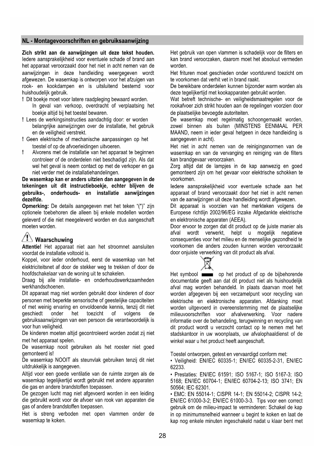 - EMC: EN 55014-1; CISPR 14-1; EN 55014-2; CISPR 14-2; EN/IEC 61000-3-2; EN/IEC 61000-3-3. Tips voor een correct gebruik om de milieu-impact te verminderen: Schakel de kap in op minimumsnelheid wanneer u begint te koken en laat de kap nog enkele minuten ingeschakeld nadat u klaar bent met29 koken. Verhoog de snelheid alleen wanneer er veel rook of damp is en gebruik de maximumsnelheid alleen in extreme situaties. Vervang de koolstoffilter(s) indien nodig om een goede efficiëntie voor het wegnemen van geurtjes te behouden. Maak de vetfilter(s) indien nodig schoon om een goede efficiëntie van de vetfilter te behouden. Gebruik de maximale diameter van het leidingsysteem zoals aangegeven in deze handleiding om de efficiëntie te optimaliseren en lawaai tot een minimum te beperken. Het gebruik De kap is vervaardigd voor gebruik in de afzuigversie met afvoer naar buiten, of de filtrerende versie, met luchtcirculatie. Uitvoering als afzuigend apparaat De wasemkap heeft een luchtuitgang aan de bovenkant B voor de afvoer van de dampen naar buiten (afvoerpijp en bevestigingsbandjes niet meegeleverd). Verbind de wasemkap aan wandafvoerpijpen en afvoeropeningen met dezelfde diameter als de luchtuitgang (verbindingsflens).Het gebruik van wandafvoerpijpen of afvoeropeningen met een kleinere diameter zal leiden tot een vermogensverlies en een sterke toename van het bedrijfsgeluid. Iedere aansprakelijkheid hiervoor wordt afgewezen. Opgelet! Als de wasemkap reeds is voorzien van een koolstoffilter dan moet u dit verwijderen. Filtrerende versie Als het niet mogelijk is de rook en kookdampen naar buiten af te voeren, kan de wasemkap worden gebruikt als filterend apparaat, door een koolstoffilter te monteren en het afbuigrooster F op de steun (beugel) G aan te brengen; de rook en dampen worden weer teruggebracht in het vertrek via de roosters aan de bovenzijde H, via een afvoerbuis die is aangesloten op de luchtuitgang aan de bovenzijde B en de aansluitring die gemonteerd is op het luchtafbuigrooster F (afvoerpijp en bevestigingsbandjes niet meegeleverd). Opgelet! Als de wasemkap is geleverd zonder koolstoffilter, dan moet u er een bestellen en aanbrengen voor de ingebruikname. Het installeren De minimum afstand tussen het kookvlak van het fornuis en het laagste deel van de afzuigkap mag niet onder de 50cm liggen, in geval van een elektrisch fornuis en 65cm, in geval van een gas- of gemengd fornuis. Indien in de installatie-aanwijzing van het gaskooktoestel een grotere afstand wordt aangegeven moet hiermee rekening worden gehouden. Elektrische aansluiting De netspanning moet corresponderen met de spanning die vermeld wordt op het etiket met eigenschappen, aan de binnenkant van de wasemkap. Als de wasemkap een stekker heeft, moet deze in een stopcontact worden gestoken dat voldoet aan de geldende voorschriften op een, ook na de installatie, goed bereikbare plaats. Heeft de kap geen stekker (rechtstreekse verbinding met het net) of is deze, ook na de installatie, niet goed te bereiken, dan moet er een tweepolige schakelaar worden geplaatst die de volledige ontkoppeling van het net garandeert in het geval van een overspanning van klasse III, in overeenstemming met de installatie normen. Attentie! Alvorens de wasemkap weer aan het voedingsnet aan te sluiten controleer of deze goed functioneert, controleer altijd of de voedingskabel goed gemonteerd is. Montage Voor de installatie: