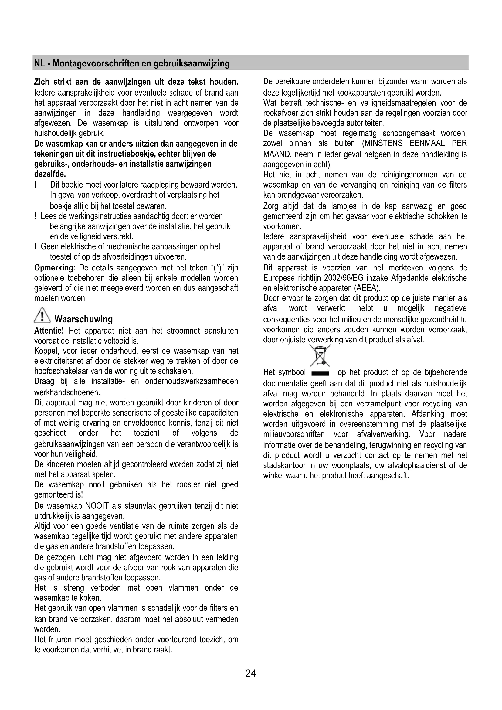 - Remonter alors la nouvelle ampoule en procédant dans le sens inverse du démontage. Dans l’éventualité où l’éclairage ne devait pas fonctionner, vérifier si les lampes ont été introduites correctement dans leur logement, avant de contacter le service après-vente.24 NL - Montagevoorschriften en gebruiksaanwijzing Zich strikt aan de aanwijzingen uit deze tekst houden. Iedere aansprakelijkheid voor eventuele schade of brand aan het apparaat veroorzaakt door het niet in acht nemen van de aanwijzingen in deze handleiding weergegeven wordt afgewezen. De wasemkap is uitsluitend ontworpen voor huishoudelijk gebruik. De wasemkap kan er anders uitzien dan aangegeven in de tekeningen uit dit instructieboekje, echter blijven de gebruiks-, onderhouds- en installatie aanwijzingen dezelfde. ! Dit boekje moet voor latere raadpleging bewaard worden. In geval van verkoop, overdracht of verplaatsing het boekje altijd bij het toestel bewaren. ! Lees de werkingsinstructies aandachtig door: er worden belangrijke aanwijzingen over de installatie, het gebruik en de veiligheid verstrekt. ! Geen elektrische of mechanische aanpassingen op het toestel of op de afvoerleidingen uitvoeren. Opmerking: De details aangegeven met het teken “(*)” zijn optionele toebehoren die alleen bij enkele modellen worden geleverd of die niet meegeleverd worden en dus aangeschaft moeten worden. Waarschuwing Attentie! Het apparaat niet aan het stroomnet aansluiten voordat de installatie voltooid is. Koppel, voor ieder onderhoud, eerst de wasemkap van het elektriciteitsnet af door de stekker weg te trekken of door de hoofdschakelaar van de woning uit te schakelen. Draag bij alle installatie- en onderhoudswerkzaamheden werkhandschoenen. Dit apparaat mag niet worden gebruikt door kinderen of door personen met beperkte sensorische of geestelijke capaciteiten of met weinig ervaring en onvoldoende kennis, tenzij dit niet geschiedt onder het toezicht of volgens de gebruiksaanwijzingen van een persoon die verantwoordelijk is voor hun veiligheid. De kinderen moeten altijd gecontroleerd worden zodat zij niet met het apparaat spelen. De wasemkap nooit gebruiken als het rooster niet goed gemonteerd is! De wasemkap NOOIT als steunvlak gebruiken tenzij dit niet uitdrukkelijk is aangegeven. Altijd voor een goede ventilatie van de ruimte zorgen als de wasemkap tegelijkertijd wordt gebruikt met andere apparaten die gas en andere brandstoffen toepassen. De gezogen lucht mag niet afgevoerd worden in een leiding die gebruikt wordt voor de afvoer van rook van apparaten die gas of andere brandstoffen toepassen. Het is streng verboden met open vlammen onder de wasemkap te koken. Het gebruik van open vlammen is schadelijk voor de filters en kan brand veroorzaken, daarom moet het absoluut vermeden worden. Het frituren moet geschieden onder voortdurend toezicht om te voorkomen dat verhit vet in brand raakt. De bereikbare onderdelen kunnen bijzonder warm worden als deze tegelijkertijd met kookapparaten gebruikt worden. Wat betreft technische- en veiligheidsmaatregelen voor de rookafvoer zich strikt houden aan de regelingen voorzien door de plaatselijke bevoegde autoriteiten. De wasemkap moet regelmatig schoongemaakt worden, zowel binnen als buiten (MINSTENS EENMAAL PER MAAND, neem in ieder geval hetgeen in deze handleiding is aangegeven in acht). Het niet in acht nemen van de reinigingsnormen van de wasemkap en van de vervanging en reiniging van de filters kan brandgevaar veroorzaken. Zorg altijd dat de lampjes in de kap aanwezig en goed gemonteerd zijn om het gevaar voor elektrische schokken te voorkomen. Iedere aansprakelijkheid voor eventuele schade aan het apparaat of brand veroorzaakt door het niet in acht nemen van de aanwijzingen uit deze handleiding wordt afgewezen. Dit apparaat is voorzien van het merkteken volgens de Europese richtlijn 2002/96/EG inzake Afgedankte elektrische en elektronische apparaten (AEEA). Door ervoor te zorgen dat dit product op de juiste manier als afval wordt verwerkt, helpt u mogelijk negatieve consequenties voor het milieu en de menselijke gezondheid te voorkomen die anders zouden kunnen worden veroorzaakt door onjuiste verwerking van dit product als afval. Het symbool op het product of op de bijbehorende documentatie geeft aan dat dit product niet als huishoudelijk afval mag worden behandeld. In plaats daarvan moet het worden afgegeven bij een verzamelpunt voor recycling van elektrische en elektronische apparaten. Afdanking moet worden uitgevoerd in overeenstemming met de plaatselijke milieuvoorschriften voor afvalverwerking. Voor nadere informatie over de behandeling, terugwinning en recycling van dit product wordt u verzocht contact op te nemen met het stadskantoor in uw woonplaats, uw afvalophaaldienst of de winkel waar u het product heeft aangeschaft.25 Het gebruik De kap is vervaardigd voor gebruik in de afzuigversie met afvoer naar buiten, of de filtrerende versie, met luchtcirculatie. Uitvoering als afzuigend apparaat De aangezogen rook en damp worden naar buiten geleid via een afvoerpijp die is aangesloten op de verbindingsring aan de bovenkant van de wasemkap. Attentie: De afvoerpijp wordt hierbij niet geleverd en moet apart aangekocht worden. De middellijn van de afvoerpijp moet even groot zijn als die van de verbindingsring. De horizontale stukken van de buis moeten enigszins omhoog hellen (ongeveer 10°) om de lucht gemakkelijk naar buiten te voeren. Note. Als de wasemkap reeds is voorzien van koolstoffilter dan moet u dit verwijderen. Verbind de wasemkap aan wandafvoerpijpen en afvoeropeningen met dezelfde diameter als de luchtuitgang (verbindingsflens).Het gebruik van wandafvoerpijpen of afvoeropeningen met een kleinere diameter zal leiden tot een vermogensverlies en een sterke toename van het bedrijfsgeluid. Iedere aansprakelijkheid hiervoor wordt afgewezen. ! De lengte van het afvoerkanaal moet zo kort mogelijk zijn. ! Gebruik zo min mogelijk bochten (maximaal toegestane hoek: 90°). ! Vermij