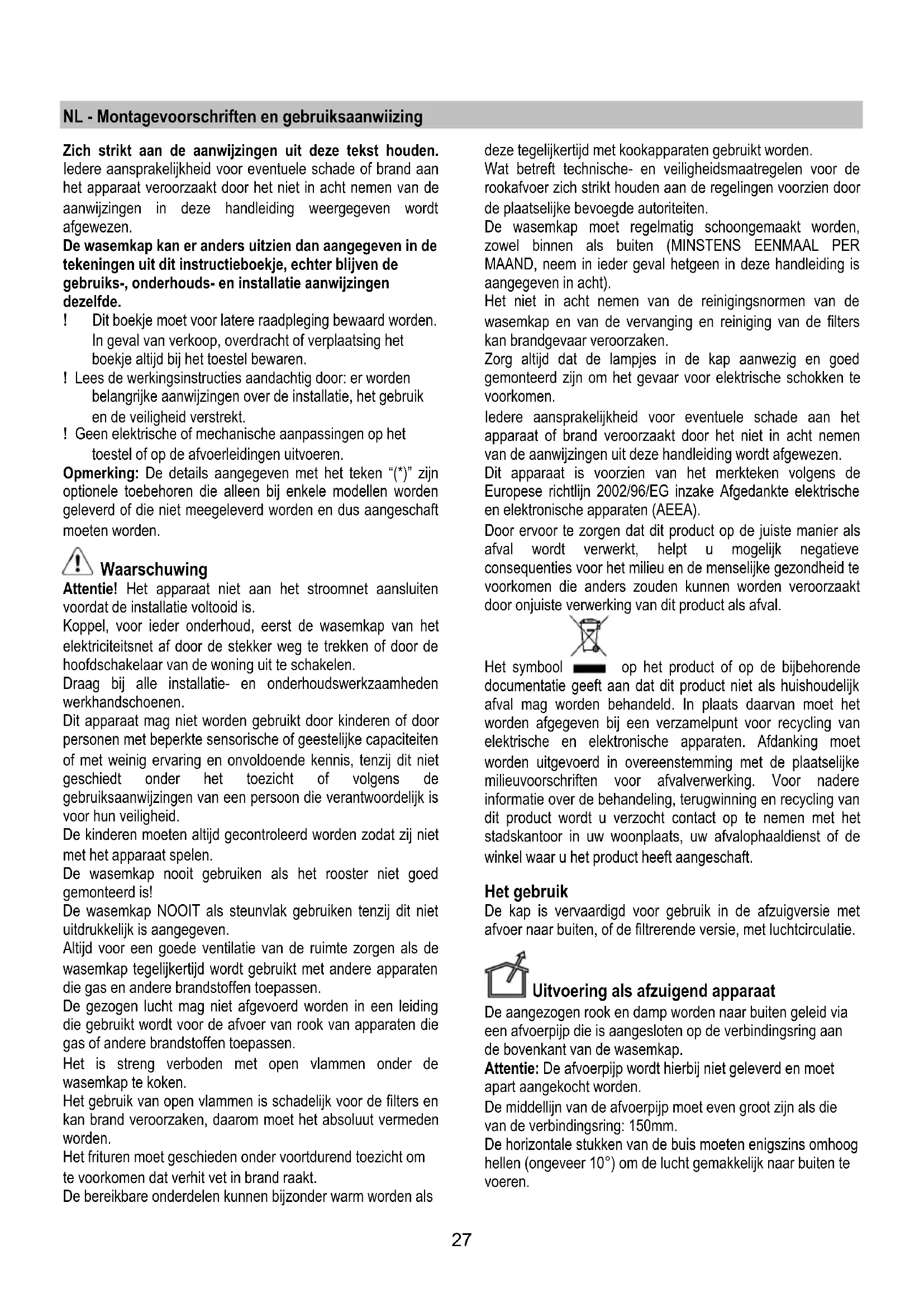 Dans l’éventualité où l’éclairage ne devait pas fonctionner, vérifier si les lampes ont été introduites correctement dans leur logement, avant de contacter le service après-vente.27 NL - Montagevoorschriften en gebruiksaanwiizing Zich strikt aan de aanwijzingen uit deze tekst houden. Iedere aansprakelijkheid voor eventuele schade of brand aan het apparaat veroorzaakt door het niet in acht nemen van de aanwijzingen in deze handleiding weergegeven wordt afgewezen. De wasemkap kan er anders uitzien dan aangegeven in de tekeningen uit dit instructieboekje, echter blijven de gebruiks-, onderhouds- en installatie aanwijzingen dezelfde. ! Dit boekje moet voor latere raadpleging bewaard worden. In geval van verkoop, overdracht of verplaatsing het boekje altijd bij het toestel bewaren. ! Lees de werkingsinstructies aandachtig door: er worden belangrijke aanwijzingen over de installatie, het gebruik en de veiligheid verstrekt. ! Geen elektrische of mechanische aanpassingen op het toestel of op de afvoerleidingen uitvoeren. Opmerking: De details aangegeven met het teken “(*)” zijn optionele toebehoren die alleen bij enkele modellen worden geleverd of die niet meegeleverd worden en dus aangeschaft moeten worden. Waarschuwing Attentie! Het apparaat niet aan het stroomnet aansluiten voordat de installatie voltooid is. Koppel, voor ieder onderhoud, eerst de wasemkap van het elektriciteitsnet af door de stekker weg te trekken of door de hoofdschakelaar van de woning uit te schakelen. Draag bij alle installatie- en onderhoudswerkzaamheden werkhandschoenen. Dit apparaat mag niet worden gebruikt door kinderen of door personen met beperkte sensorische of geestelijke capaciteiten of met weinig ervaring en onvoldoende kennis, tenzij dit niet geschiedt onder het toezicht of volgens de gebruiksaanwijzingen van een persoon die verantwoordelijk is voor hun veiligheid. De kinderen moeten altijd gecontroleerd worden zodat zij niet met het apparaat spelen. De wasemkap nooit gebruiken als het rooster niet goed gemonteerd is! De wasemkap NOOIT als steunvlak gebruiken tenzij dit niet uitdrukkelijk is aangegeven. Altijd voor een goede ventilatie van de ruimte zorgen als de wasemkap tegelijkertijd wordt gebruikt met andere apparaten die gas en andere brandstoffen toepassen. De gezogen lucht mag niet afgevoerd worden in een leiding die gebruikt wordt voor de afvoer van rook van apparaten die gas of andere brandstoffen toepassen. Het is streng verboden met open vlammen onder de wasemkap te koken. Het gebruik van open vlammen is schadelijk voor de filters en kan brand veroorzaken, daarom moet het absoluut vermeden worden. Het frituren moet geschieden onder voortdurend toezicht om te voorkomen dat verhit vet in brand raakt. De bereikbare onderdelen kunnen bijzonder warm worden als deze tegelijkertijd met kookapparaten gebruikt worden. Wat betreft technische- en veiligheidsmaatregelen voor de rookafvoer zich strikt houden aan de regelingen voorzien door de plaatselijke bevoegde autoriteiten. De wasemkap moet regelmatig schoongemaakt worden, zowel binnen als buiten (MINSTENS EENMAAL PER MAAND, neem in ieder geval hetgeen in deze handleiding is aangegeven in acht). Het niet in acht nemen van de reinigingsnormen van de wasemkap en van de vervanging en reiniging van de filters kan brandgevaar veroorzaken. Zorg altijd dat de lampjes in de kap aanwezig en goed gemonteerd zijn om het gevaar voor elektrische schokken te voorkomen. Iedere aansprakelijkheid voor eventuele schade aan het apparaat of brand veroorzaakt door het niet in acht nemen van de aanwijzingen uit deze handleiding wordt afgewezen. Dit apparaat is voorzien van het merkteken volgens de Europese richtlijn 2002/96/EG inzake Afgedankte elektrische en elektronische apparaten (AEEA). Door ervoor te zorgen dat dit product op de juiste manier als afval wordt verwerkt, helpt u mogelijk negatieve consequenties voor het milieu en de menselijke gezondheid te voorkomen die anders zouden kunnen worden veroorzaakt door onjuiste verwerking van dit product als afval. Het symbool op het product of op de bijbehorende documentatie geeft aan dat dit product niet als huishoudelijk afval mag worden behandeld. In plaats daarvan moet het worden afgegeven bij een verzamelpunt voor recycling van elektrische en elektronische apparaten. Afdanking moet worden uitgevoerd in overeenstemming met de plaatselijke milieuvoorschriften voor afvalverwerking. Voor nadere informatie over de behandeling, terugwinning en recycling van dit product wordt u verzocht contact op te nemen met het stadskantoor in uw woonplaats, uw afvalophaaldienst of de winkel waar u het product heeft aangeschaft. Het gebruik De kap is vervaardigd voor gebruik in de afzuigversie met afvoer naar buiten, of de filtrerende versie, met luchtcirculatie. Uitvoering als afzuigend apparaat De aangezogen rook en damp worden naar buiten geleid via een afvoerpijp die is aangesloten op de verbindingsring aan de bovenkant van de wasemkap. Attentie: De afvoerpijp wordt hierbij niet geleverd en moet apart aangekocht worden. De middellijn van de afvoerpijp moet even groot zijn als die van de verbindingsring: 150mm. De horizontale stukken van de buis moeten enigszins omhoog hellen (ongeveer 10°) om de lucht gemakkelijk naar buiten te voeren.28 Note. Als de wasemkap reeds is voorzien van koolstoffilter dan moet u dit verwijderen. Verbind de wasemkap aan wandafvoerpijpen en afvoeropeningen met dezelfde diameter als de luchtuitgang (verbindingsflens).Het gebruik van wandafvoerpijpen of afvoeropeningen met een kleinere diameter zal leiden tot een vermogensverlies en een sterke toename van het bedrijfsgeluid. Iedere aansprakelijkheid hiervoor wordt afgewezen. ! De lengte van het afvoerkanaal moet zo kort mogelijk zijn. ! Gebruik zo min mogelijk bochten (maximaal toegestane hoek: 90°). ! Vermijd grote verschillen in doorsnede. ! Gebruik een buis met een zo glad mogelijke binnenkant. ! Het gebruikte materiaal moet volgens norm zijn. Filt