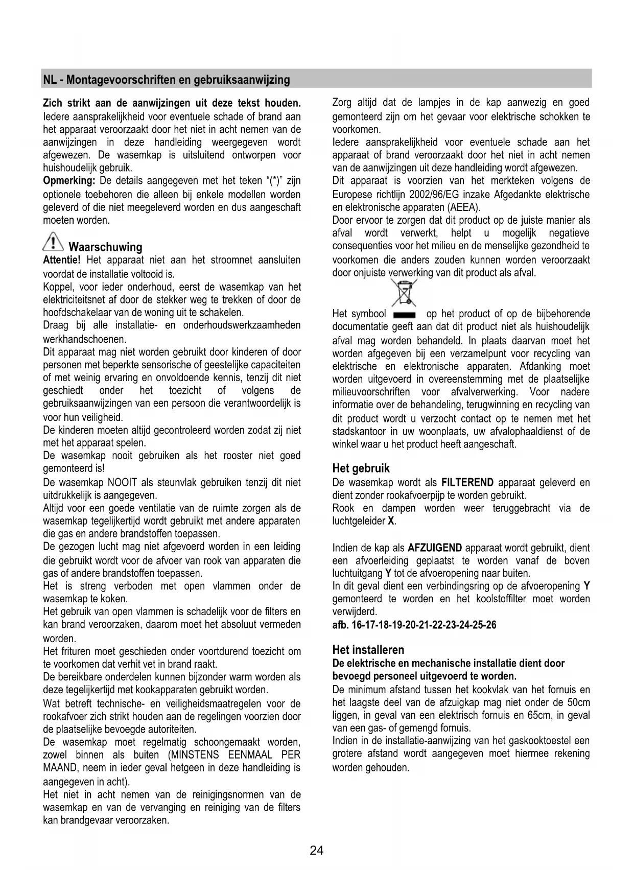 Certains modèles prévoient des lampes latérales: Les remplacer par des ampoules de forme identique et de max 40W (E14). Pour accéder aux ampoules, enlever le couvercle A. Dans l’éventualité où l’éclairage ne devait pas fonctionner, vérifier si les lampes ont été introduites correctement dans leur logement, avant de contacter le service après-vente.24 NL - Montagevoorschriften en gebruiksaanwijzing Zich strikt aan de aanwijzingen uit deze tekst houden. Iedere aansprakelijkheid voor eventuele schade of brand aan het apparaat veroorzaakt door het niet in acht nemen van de aanwijzingen in deze handleiding weergegeven wordt afgewezen. De wasemkap is uitsluitend ontworpen voor huishoudelijk gebruik. Opmerking: De details aangegeven met het teken “(*)” zijn optionele toebehoren die alleen bij enkele modellen worden geleverd of die niet meegeleverd worden en dus aangeschaft moeten worden. Waarschuwing Attentie! Het apparaat niet aan het stroomnet aansluiten voordat de installatie voltooid is. Koppel, voor ieder onderhoud, eerst de wasemkap van het elektriciteitsnet af door de stekker weg te trekken of door de hoofdschakelaar van de woning uit te schakelen. Draag bij alle installatie- en onderhoudswerkzaamheden werkhandschoenen. Dit apparaat mag niet worden gebruikt door kinderen of door personen met beperkte sensorische of geestelijke capaciteiten of met weinig ervaring en onvoldoende kennis, tenzij dit niet geschiedt onder het toezicht of volgens de gebruiksaanwijzingen van een persoon die verantwoordelijk is voor hun veiligheid. De kinderen moeten altijd gecontroleerd worden zodat zij niet met het apparaat spelen. De wasemkap nooit gebruiken als het rooster niet goed gemonteerd is! De wasemkap NOOIT als steunvlak gebruiken tenzij dit niet uitdrukkelijk is aangegeven. Altijd voor een goede ventilatie van de ruimte zorgen als de wasemkap tegelijkertijd wordt gebruikt met andere apparaten die gas en andere brandstoffen toepassen. De gezogen lucht mag niet afgevoerd worden in een leiding die gebruikt wordt voor de afvoer van rook van apparaten die gas of andere brandstoffen toepassen. Het is streng verboden met open vlammen onder de wasemkap te koken. Het gebruik van open vlammen is schadelijk voor de filters en kan brand veroorzaken, daarom moet het absoluut vermeden worden. Het frituren moet geschieden onder voortdurend toezicht om te voorkomen dat verhit vet in brand raakt. De bereikbare onderdelen kunnen bijzonder warm worden als deze tegelijkertijd met kookapparaten gebruikt worden. Wat betreft technische- en veiligheidsmaatregelen voor de rookafvoer zich strikt houden aan de regelingen voorzien door de plaatselijke bevoegde autoriteiten. De wasemkap moet regelmatig schoongemaakt worden, zowel binnen als buiten (MINSTENS EENMAAL PER MAAND, neem in ieder geval hetgeen in deze handleiding is aangegeven in acht). Het niet in acht nemen van de reinigingsnormen van de wasemkap en van de vervanging en reiniging van de filters kan brandgevaar veroorzaken. Zorg altijd dat de lampjes in de kap aanwezig en goed gemonteerd zijn om het gevaar voor elektrische schokken te voorkomen. Iedere aansprakelijkheid voor eventuele schade aan het apparaat of brand veroorzaakt door het niet in acht nemen van de aanwijzingen uit deze handleiding wordt afgewezen. Dit apparaat is voorzien van het merkteken volgens de Europese richtlijn 2002/96/EG inzake Afgedankte elektrische en elektronische apparaten (AEEA). Door ervoor te zorgen dat dit product op de juiste manier als afval wordt verwerkt, helpt u mogelijk negatieve consequenties voor het milieu en de menselijke gezondheid te voorkomen die anders zouden kunnen worden veroorzaakt door onjuiste verwerking van dit product als afval. Het symbool op het product of op de bijbehorende documentatie geeft aan dat dit product niet als huishoudelijk afval mag worden behandeld. In plaats daarvan moet het worden afgegeven bij een verzamelpunt voor recycling van elektrische en elektronische apparaten. Afdanking moet worden uitgevoerd in overeenstemming met de plaatselijke milieuvoorschriften voor afvalverwerking. Voor nadere informatie over de behandeling, terugwinning en recycling van dit product wordt u verzocht contact op te nemen met het stadskantoor in uw woonplaats, uw afvalophaaldienst of de winkel waar u het product heeft aangeschaft. Het gebruik De wasemkap wordt als FILTEREND apparaat geleverd en dient zonder rookafvoerpijp te worden gebruikt. Rook en dampen worden weer teruggebracht via de luchtgeleider X. Indien de kap als AFZUIGEND apparaat wordt gebruikt, dient een afvoerleiding geplaatst te worden vanaf de boven luchtuitgang Y tot de afvoeropening naar buiten. In dit geval dient een verbindingsring op de afvoeropening Y gemonteerd te worden en het koolstoffilter moet worden verwijderd. afb. 16-17-18-19-20-21-22-23-24-25-26 Het installeren De elektrische en mechanische installatie dient door bevoegd personeel uitgevoerd te worden. De minimum afstand tussen het kookvlak van het fornuis en het laagste deel van de afzuigkap mag niet onder de 50cm liggen, in geval van een elektrisch fornuis en 65cm, in geval van een gas- of gemengd fornuis. Indien in de installatie-aanwijzing van het gaskooktoestel een grotere afstand wordt aangegeven moet hiermee rekening worden gehouden.25 Elektrische aansluiting De netspanning moet corresponderen met de spanning die vermeld wordt op het etiket met eigenschappen, aan de binnenkant van de wasemkap. Het toestel dient rechtstreeks op de voedingslijn te worden aangesloten, plaats daarom een tweepolige schakelaar, die voldoet aan de geldende normen en die, in geval van overspanning III, volledig van het net ontkoppeld wordt, in overeenstemming met de installatie voorschriften. ATTENTIE! De detail B (beugel voor de bevestiging aan het plafond - afb. 1), is voorzien van een geleider (geel- groen) die aan een geaard stopcontact van de woning aangesloten moet worden. afb. 4 ATTENTIE! Let bijzonder goed op de positionering v