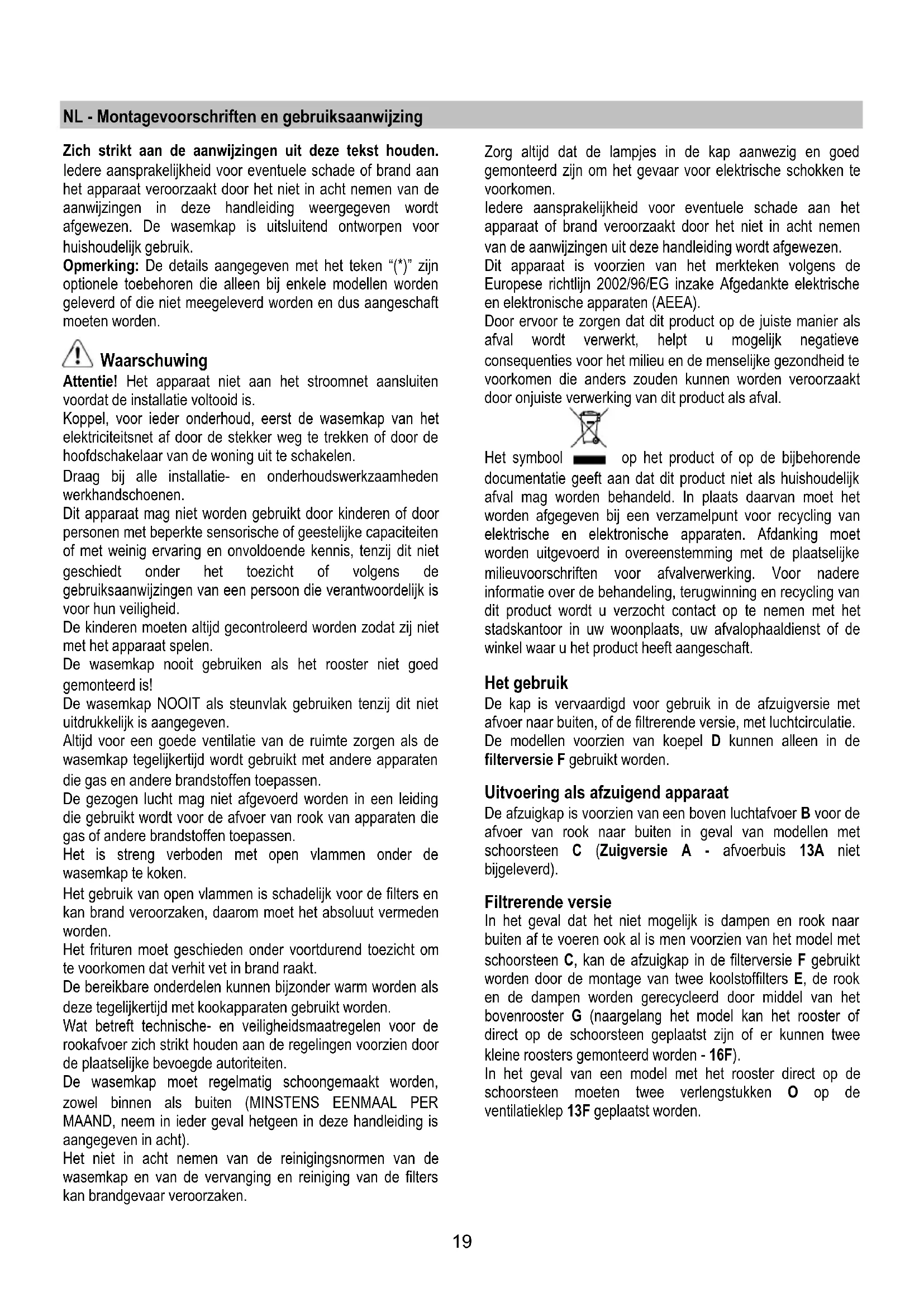 Filtre anti-gras Il retient les particules de graisse issues de la cuisson. S’il est situé à l’intérieur d’une grille support, il peut s’agir d’un des modèles suivants: Le filtre en papier doit etre chengé une fois par mois ou s’il se colore sur sa partie supérieure, lorsque la coloration transparait au travers de la grille. Il filtro metallique doit etre nettoyé une fois par mois avec un detergent non agressif, à la main ou dans le lave vaisselle à basse température et pendant un cycle court. Le lavage du filtre anti-graisse métallique au lave-vaisselle peut en provoquer la décoloration. Toutefois, les caractéristiques de filtrage ne seront en aucun cas modifiées. Pour accéder au filtre a graisse J ouvrir la grille d’aspiration H grace aux taquets L en les libérants des fixations K. Certains modèles sont fournis avec un filtre metallique M sans grille support, ceux-ci doivent etre lavés comme décrit ci-dessus et retirés de leur support en poussant les poignées N vers le bas. Filtre à charbon actif (uniquement pour version recyclage) Retient les odeurs désagréables de cuisson. La saturation du charbon actif se constate aprés un emploi plus ou mois long, selon le type de cuisiniére et de régularité du nettoyage du filtre à graisses. En tout cas, il est nécessaire de changer le filtre aprés, au maximum, quatre mois (ou lorsque le système d’indication de saturation des filtres – si prévu sur le modèle possédé – indique cette nécessité). IL NE PEUT PAS être nettoyé ou régénéré. Filtre au charbon avec poignée centrale En appliquer un par côté en couverture des deux grilles de protection des bras du moteur, ensuite tourner la poignée centrale P des filtres dans le sens des aiguilles d’une montre. Pour le démontage, tourner la poignée centrale P de chaque filtre dans le sens inverse des aiguilles d’une montre. Remplacement des lampes Débrancher l’appareil du réseau électrique Attention! Avant de toucher les lampes, assurez-vous qu’elles soient froides. Changement de l’ampoule 40W - Accéder au logement de la lampe – Enlever la vis du plafonnier.- Dévisser l’ampoule grillée et la remplacer par une ampoule ovale a incandescence max 40W E14. Remplacement des lampes halogène - Accéder au logement de la lampe – sortir la protection en utilisant un petit tournevis à lame plate ou tout autre outil similaire. Remplacer la lampe endommagée. Utiliser uniquement des lampes halogènes 20W maximum (G4), en ayant soin de ne pas les toucher avec les mains. Refermer le plafonnier (fixation par encliquetage). (Z1 - Z2) Dans l’éventualité où l’éclairage ne devait pas fonctionner, vérifier si les lampes ont été introduites correctement dans leur logement, avant de contacter le service après-vente.19 NL - Montagevoorschriften en gebruiksaanwijzing Zich strikt aan de aanwijzingen uit deze tekst houden. Iedere aansprakelijkheid voor eventuele schade of brand aan het apparaat veroorzaakt door het niet in acht nemen van de aanwijzingen in deze handleiding weergegeven wordt afgewezen. De wasemkap is uitsluitend ontworpen voor huishoudelijk gebruik. Opmerking: De details aangegeven met het teken “(*)” zijn optionele toebehoren die alleen bij enkele modellen worden geleverd of die niet meegeleverd worden en dus aangeschaft moeten worden. Waarschuwing Attentie! Het apparaat niet aan het stroomnet aansluiten voordat de installatie voltooid is. Koppel, voor ieder onderhoud, eerst de wasemkap van het elektriciteitsnet af door de stekker weg te trekken of door de hoofdschakelaar van de woning uit te schakelen. Draag bij alle installatie- en onderhoudswerkzaamheden werkhandschoenen. Dit apparaat mag niet worden gebruikt door kinderen of door personen met beperkte sensorische of geestelijke capaciteiten of met weinig ervaring en onvoldoende kennis, tenzij dit niet geschiedt onder het toezicht of volgens de gebruiksaanwijzingen van een persoon die verantwoordelijk is voor hun veiligheid. De kinderen moeten altijd gecontroleerd worden zodat zij niet met het apparaat spelen. De wasemkap nooit gebruiken als het rooster niet goed gemonteerd is! De wasemkap NOOIT als steunvlak gebruiken tenzij dit niet uitdrukkelijk is aangegeven. Altijd voor een goede ventilatie van de ruimte zorgen als de wasemkap tegelijkertijd wordt gebruikt met andere apparaten die gas en andere brandstoffen toepassen. De gezogen lucht mag niet afgevoerd worden in een leiding die gebruikt wordt voor de afvoer van rook van apparaten die gas of andere brandstoffen toepassen. Het is streng verboden met open vlammen onder de wasemkap te koken. Het gebruik van open vlammen is schadelijk voor de filters en kan brand veroorzaken, daarom moet het absoluut vermeden worden. Het frituren moet geschieden onder voortdurend toezicht om te voorkomen dat verhit vet in brand raakt. De bereikbare onderdelen kunnen bijzonder warm worden als deze tegelijkertijd met kookapparaten gebruikt worden. Wat betreft technische- en veiligheidsmaatregelen voor de rookafvoer zich strikt houden aan de regelingen voorzien door de plaatselijke bevoegde autoriteiten. De wasemkap moet regelmatig schoongemaakt worden, zowel binnen als buiten (MINSTENS EENMAAL PER MAAND, neem in ieder geval hetgeen in deze handleiding is aangegeven in acht). Het niet in acht nemen van de reinigingsnormen van de wasemkap en van de vervanging en reiniging van de filters kan brandgevaar veroorzaken. Zorg altijd dat de lampjes in de kap aanwezig en goed gemonteerd zijn om het gevaar voor elektrische schokken te voorkomen. Iedere aansprakelijkheid voor eventuele schade aan het apparaat of brand veroorzaakt door het niet in acht nemen van de aanwijzingen uit deze handleiding wordt afgewezen. Dit apparaat is voorzien van het merkteken volgens de Europese richtlijn 2002/96/EG inzake Afgedankte elektrische en elektronische apparaten (AEEA). Door ervoor te zorgen dat dit product op de juiste manier als afval wordt ver