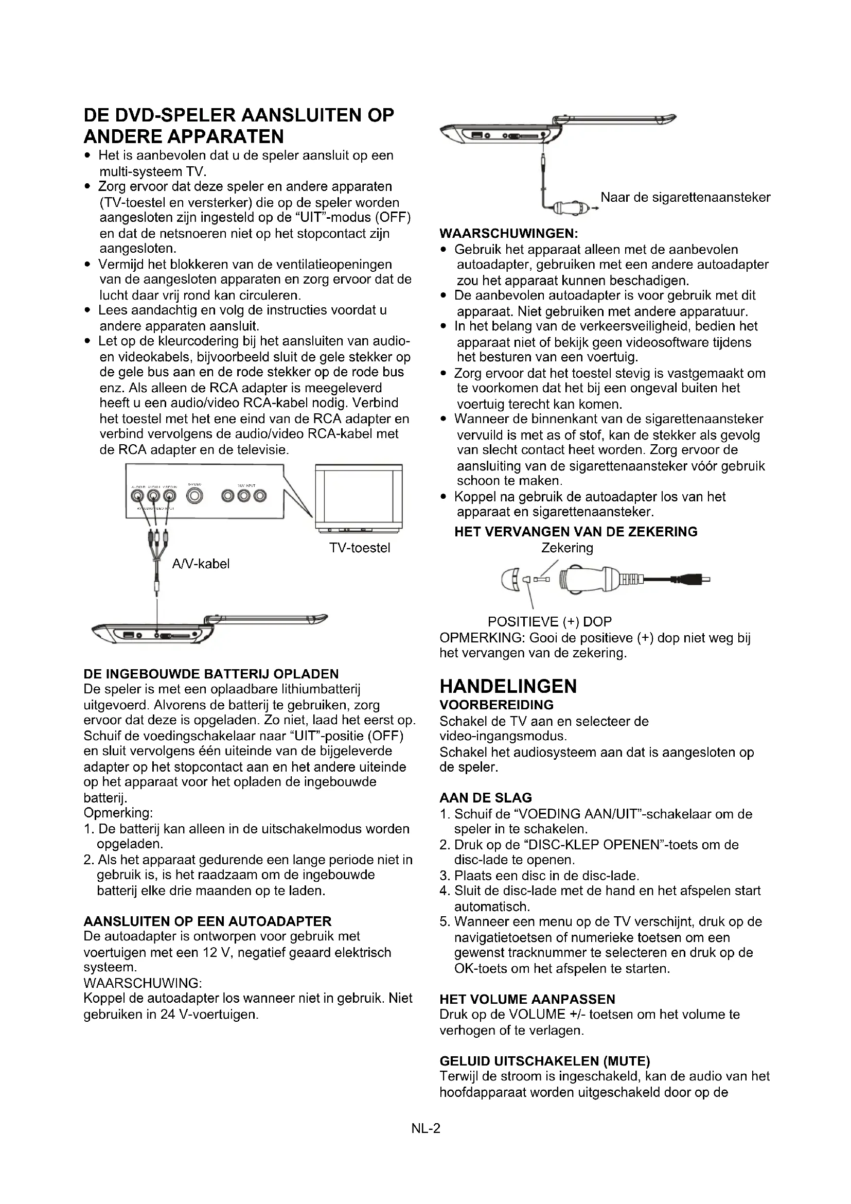 Druk op de VOLUME +/- toetsen om het volume te verhogen of te verlagen. GELUID UITSCHAKELEN (MUTE) Terwijl de stroom is ingeschakeld, kan de audio van het hoofdapparaat worden uitgeschakeld door op de A/V-kabel TV-toestel Naar de sigarettenaanstekerNL-3 “GELUID UITSCHAKELEN”-toets (MUTE) te drukken. Druk nogmaals erop om het geluid te hervatten.