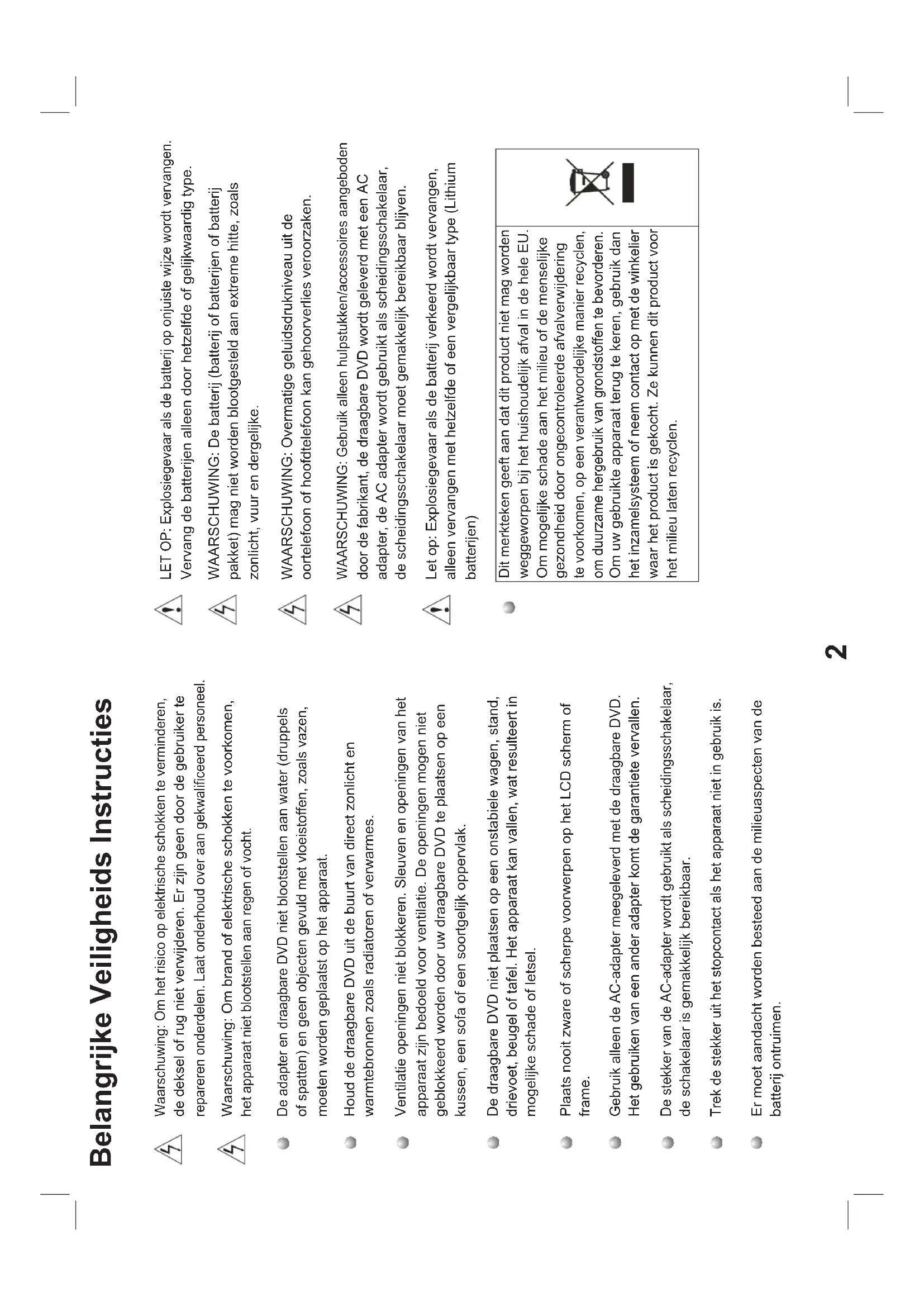 Inhoud Inhoudsopgave ..............................................................................................P1 Veiligheidsmaatregelen............................................................................ P2-3 Identificatie van besturingselementen .......................................................P4 Hoofd Eenheid...............................................................................................P4 Afstandsbediening ........................................................................................P5 Setup Menu instellingen...............................................................................P6 Algemene setuppagina.................................................................................P7 Audio instellingen..........................................................................................P8 Video instellingen..........................................................................................P8 Voorkeurspagina .....................................................................................P8-P9 Wachtwoord instellingspagina.....................................................................P9 Parameters en specificaties ......................................................................P102 Belangrijke Veiligheids Instructies Waarschuwing: Om het risico op elektrische schokken te verminderen, de deksel of rug niet verwijderen. Er zijn geen door de gebruiker te repareren onderdelen. Laat onderhoud over aan gekwalificeerd personeel. Waarschuwing: Om brand of elektrische schokken te voorkomen, het apparaat niet blootstellen aan regen of vocht. De adapter en draagbare DVD niet blootstellen aan water (druppels of spatten) en geen objecten gevuld met vloeistoffen, zoals vazen, moeten worden geplaatst op het apparaat. Houd de draagbare DVD uit de buurt van direct zonlicht en warmtebronnen zoals radiatoren of verwarmes. Ventilatie openingen niet blokkeren. Sleuven en openingen van het apparaat zijn bedoeld voor ventilatie. De openingen mogen niet geblokkeerd worden door uw draagbare DVD te plaatsen op een kussen, een sofa of een soortgelijk oppervlak. De draagbare DVD niet plaatsen op een onstabiele wagen, stand, drievoet, beugel of tafel. Het apparaat kan vallen, wat resulteert in mogelijke schade of letsel. Plaats nooit zware of scherpe voorwerpen op het LCD scherm of frame. Gebruik alleen de AC-adapter meegeleverd met de draagbare DVD. Het gebruiken van een ander adapter komt de garantiete vervallen. De stekker van de AC-adapter wordt gebruikt als scheidingsschakelaar, de schakelaar is gemakkelijk bereikbaar. Trek de stekker uit het stopcontact als het apparaat niet in gebruik is. Er moet aandacht worden besteed aan de milieuaspecten van de batterij ontruimen. LET OP: Explosiegevaar als de batterij op onjuiste wijze wordt vervangen. Vervang de batterijen alleen door hetzelfde of gelijkwaardig type. WAARSCHUWING: De batterij (batterij of batterijen of batterij pakket) mag niet worden blootgesteld aan extreme hitte, zoals zonlicht, vuur en dergelijke. WAARSCHUWING: Overmatige geluidsdrukniveau uit de oortelefoon of hoofdtelefoon kan gehoorverlies veroorzaken. WAARSCHUWING: Gebruik alleen hulpstukken/accessoires aangeboden door de fabrikant, de draagbare DVD wordt geleverd met een AC adapter, de AC adapter wordt gebruikt als scheidingsschakelaar, de scheidingsschakelaar moet gemakkelijk bereikbaar blijven. Let op: Explosiegevaar als de batterij verkeerd wordt vervangen, alleen vervangen met hetzelfde of een vergelijkbaar type (Lithium batterijen) Dit merkteken geeft aan dat dit product niet mag worden weggeworpen bij het huishoudelijk afval in de hele EU. Om mogelijke schade aan het milieu of de menselijke gezondheid door ongecontroleerde afvalverwijdering te voorkomen, op een verantwoordelijke manier recyclen, om duurzame hergebruik van grondstoffen te bevorderen. Om uw gebruikte apparaat terug te keren, gebruik dan het inzamelsysteem of neem contact op met de winkelier waar het product is gekocht. Ze kunnen dit product voor het milieu laten recyclen.N Opmerkingen van de Auteurswet: