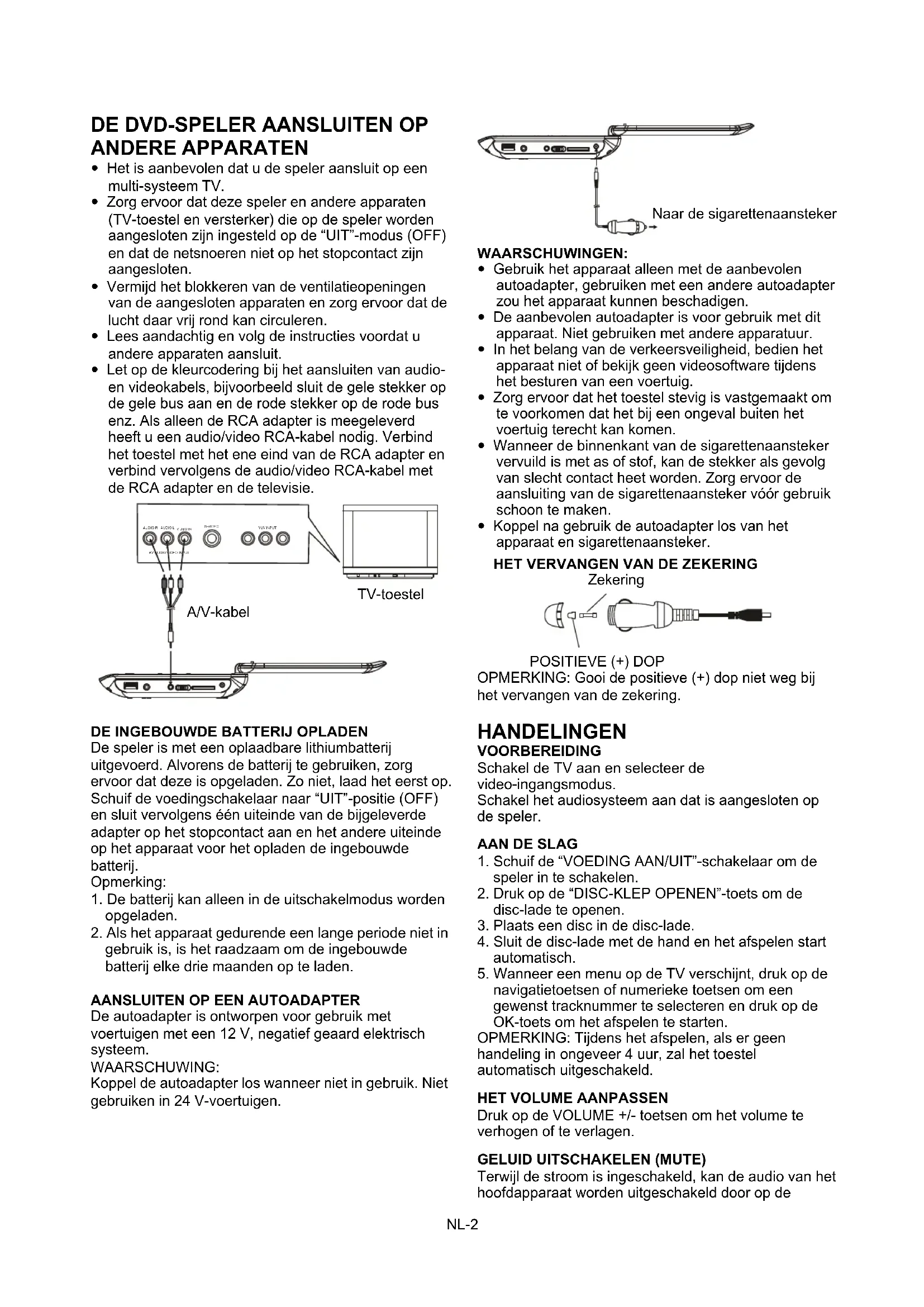 WAARSCHUWINGEN: Gebruik het apparaat alleen met de aanbevolen autoadapter, gebruiken met een andere autoadapter zou het apparaat kunnen beschadigen. De aanbevolen autoadapter is voor gebruik met dit apparaat. Niet gebruiken met andere apparatuur. In het belang van de verkeersveiligheid, bedien het apparaat niet of bekijk geen videosoftware tijdens het besturen van een voertuig. Zorg ervoor dat het toestel stevig is vastgemaakt om te voorkomen dat het bij een ongeval buiten het voertuig terecht kan komen. Wanneer de binnenkant van de sigarettenaansteker vervuild is met as of stof, kan de stekker als gevolg van slecht contact heet worden. Zorg ervoor de aansluiting van de sigarettenaansteker vóór gebruik schoon te maken. Koppel na gebruik de autoadapter los van het apparaat en sigarettenaansteker.