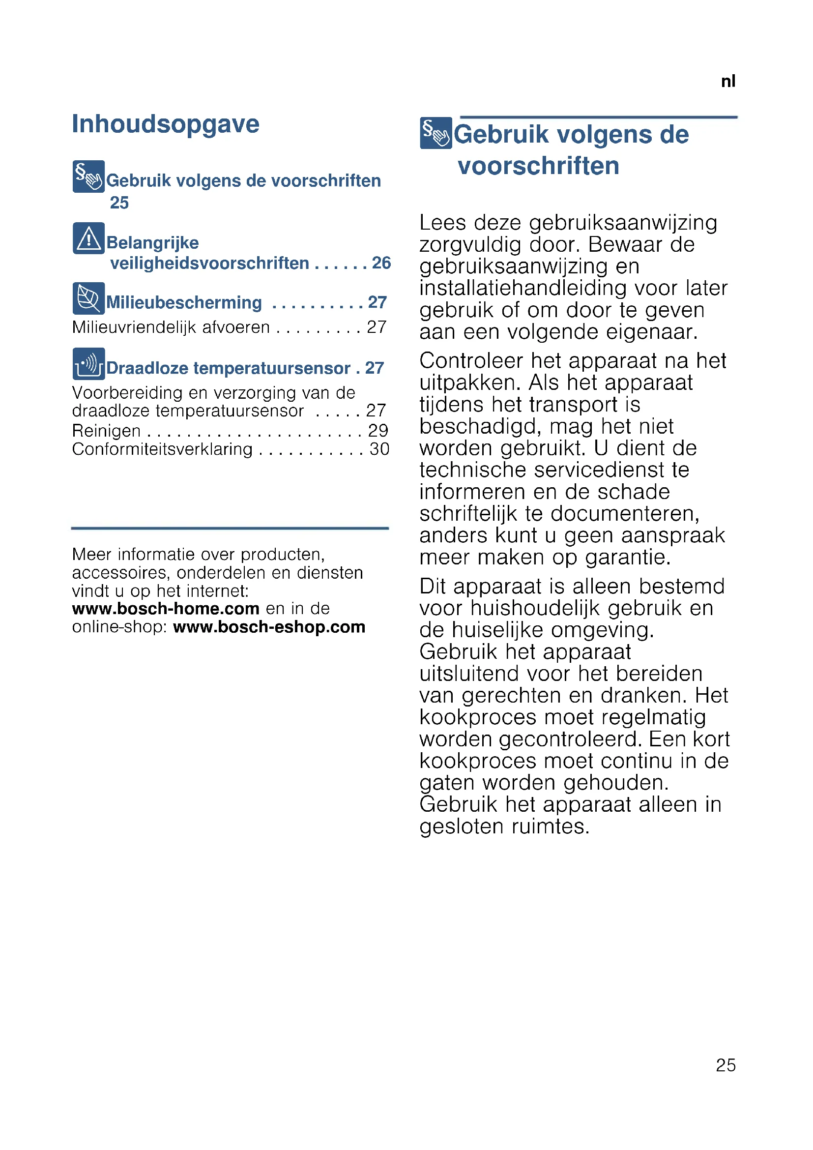 - Conformiteitsverklaring Produktinfo Meer informatie over producten, accessoires, onderdelen en diensten vindt u op het internet: www.bosch-home.com en in de online-shop: www.bosch-eshop.com 8 Gebruik volgens de voorschriften Gebr ui k vol gens de voorschriften Lees deze gebruiksaanwijzing zorgvuldig door. Bewaar de gebruiksaanwijzing en installatiehandleiding voor later gebruik of om door te geven aan een volgende eigenaar. Controleer het apparaat na het uitpakken. Als het apparaat tijdens het transport is beschadigd, mag het niet worden gebruikt. U dient de technische servicedienst te informeren en de schade schriftelijk te documenteren, anders kunt u geen aanspraak meer maken op garantie. Dit apparaat is alleen bestemd voor huishoudelijk gebruik en de huiselijke omgeving. Gebruik het apparaat uitsluitend voor het bereiden van gerechten en dranken. Het kookproces moet regelmatig worden gecontroleerd. Een kort kookproces moet continu in de gaten worden gehouden. Gebruik het apparaat alleen in gesloten ruimtes.nl p. 30