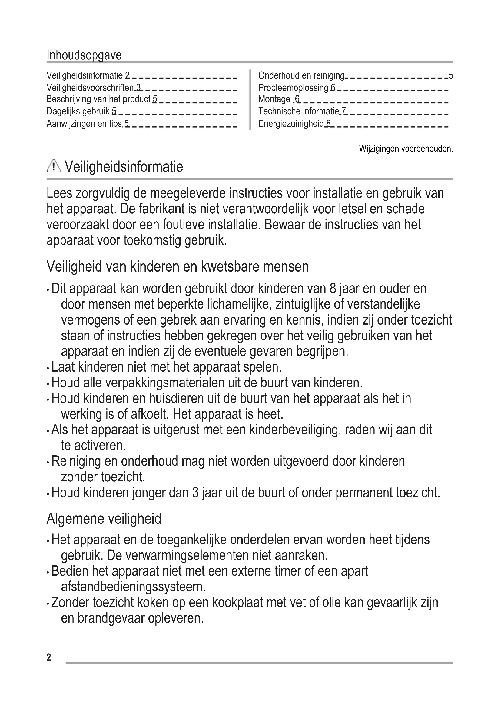 Probleemoplossing 6 Montage 6 Technische informatie 7 Energiezuinigheid 8 Wijzigingen voorbehouden. Veiligheidsinformatie Lees zorgvuldig de meegeleverde instructies voor installatie en gebruik van het apparaat. De fabrikant is niet verantwoordelijk voor letsel en schade veroorzaakt door een foutieve installatie. Bewaar de instructies van het apparaat voor toekomstig gebruik. Veiligheid van kinderen en kwetsbare mensen