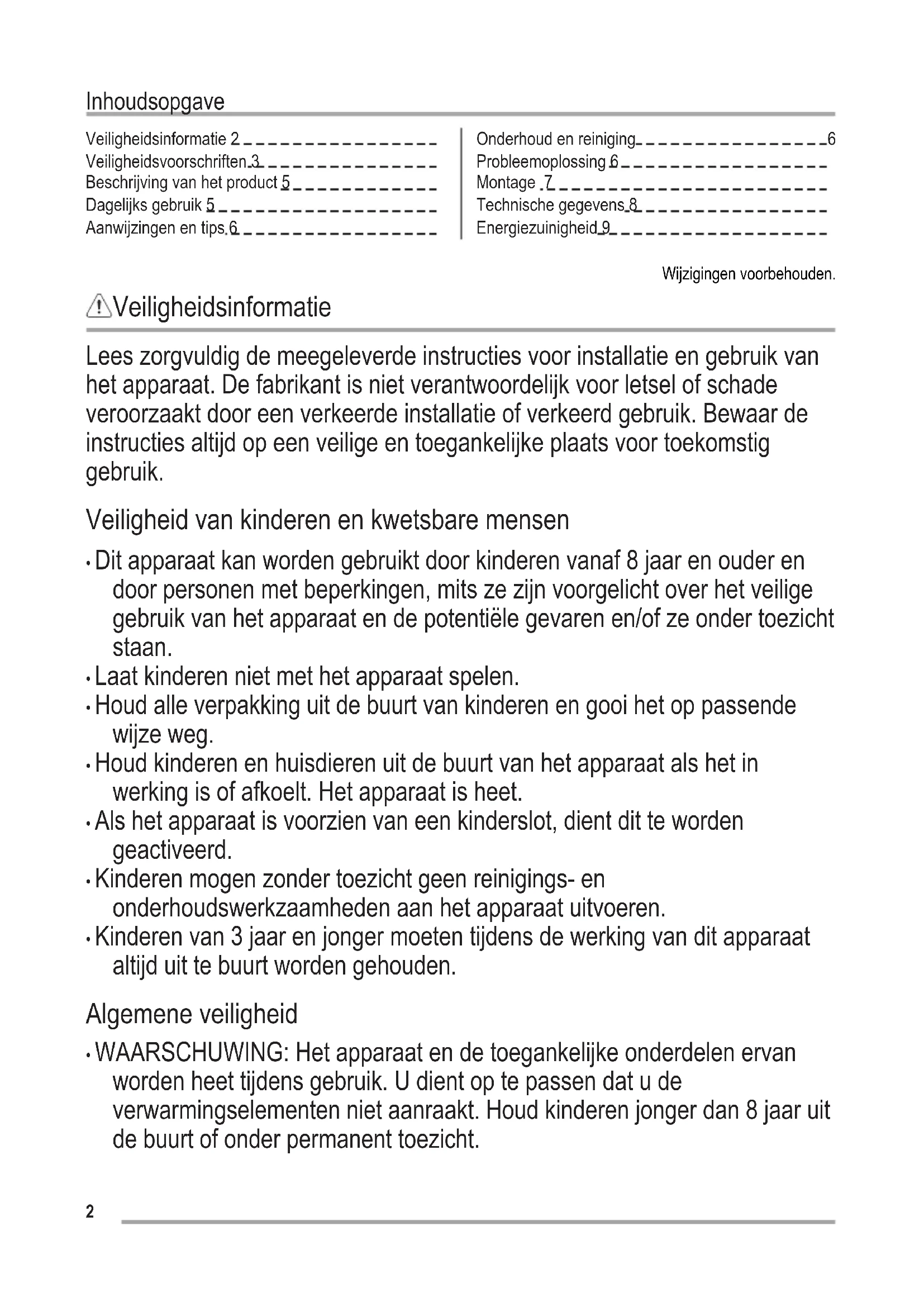 Probleemoplossing 6 Montage 7 Technische gegevens 8 Energiezuinigheid 9 Wijzigingen voorbehouden. Veiligheidsinformatie Lees zorgvuldig de meegeleverde instructies voor installatie en gebruik van het apparaat. De fabrikant is niet verantwoordelijk voor letsel of schade veroorzaakt door een verkeerde installatie of verkeerd gebruik. Bewaar de instructies altijd op een veilige en toegankelijke plaats voor toekomstig gebruik. Veiligheid van kinderen en kwetsbare mensen
