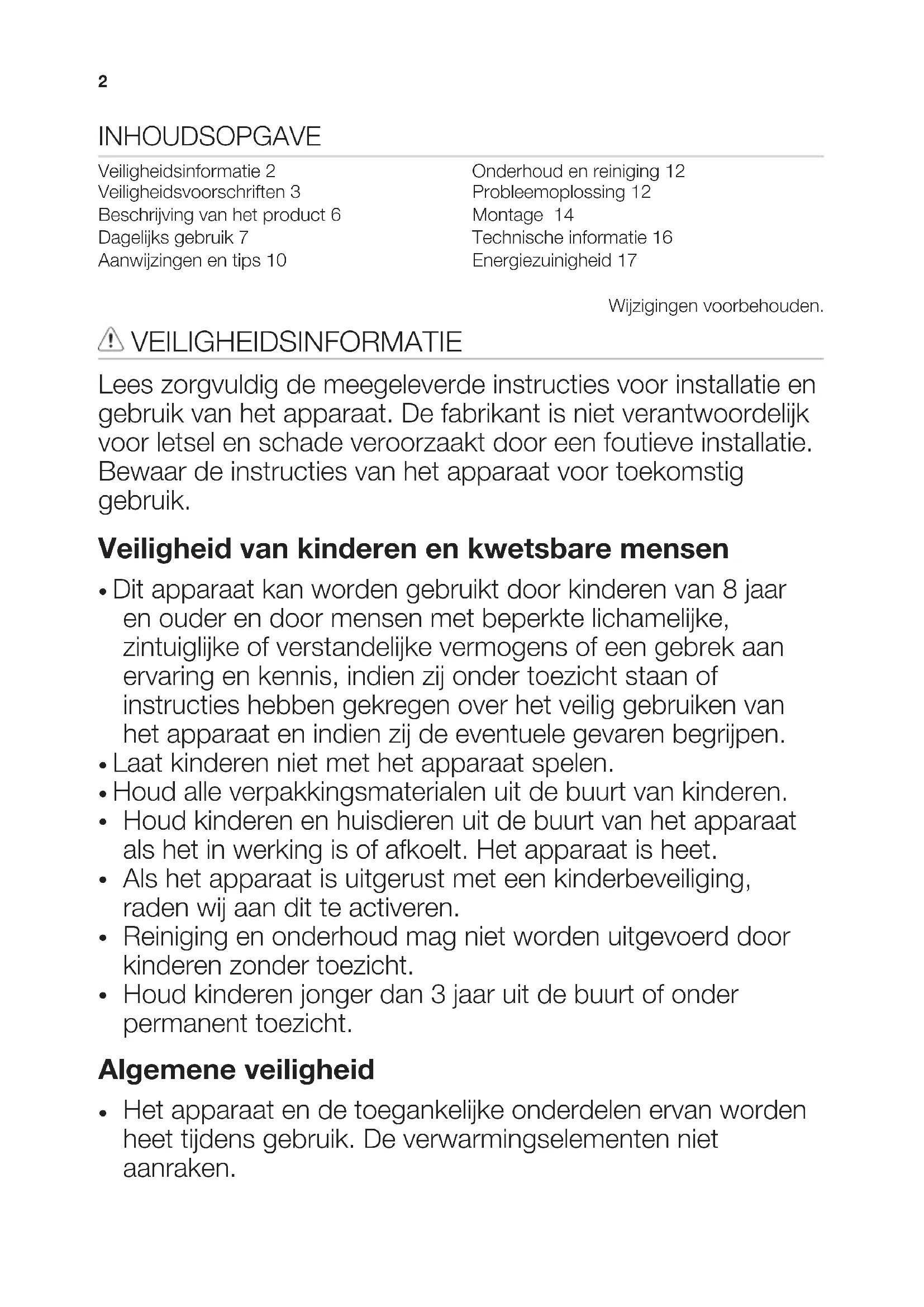 - Gebruik de restwarmte om het eten warm te houden of te smelten. MILIEUBESCHERMING Recycle de materialen met het symbool . Gooi de verpakking in een geschikte verzamelcontainer om het te recyclen. Help om het milieu en de volksgezondheid te beschermen en recycle het afval van elektrische en elektronische apparaten. Gooi apparaten gemarkeerd met het symbool niet weg met het huishoudelijk afval. Breng het product naar het milieustation bij u in de buurt of neem contact op met de gemeente. 18CONTENTS Safety information 19 Safety instructions 20 Product description 22 Daily use 24 Hints and tips 26 Care and cleaning 28 Troubleshooting 28 Installation 30 Technical information 33 Energy efficiency 33 Subject to change without notice. SAFETY INFORMATION Before the installation and use of the appliance, carefully read the supplied instructions. The manufacturer is not responsible if an incorrect installation and use causes injuries and damages. Always keep the instructions with the appliance for future reference. Children and vulnerable people safety