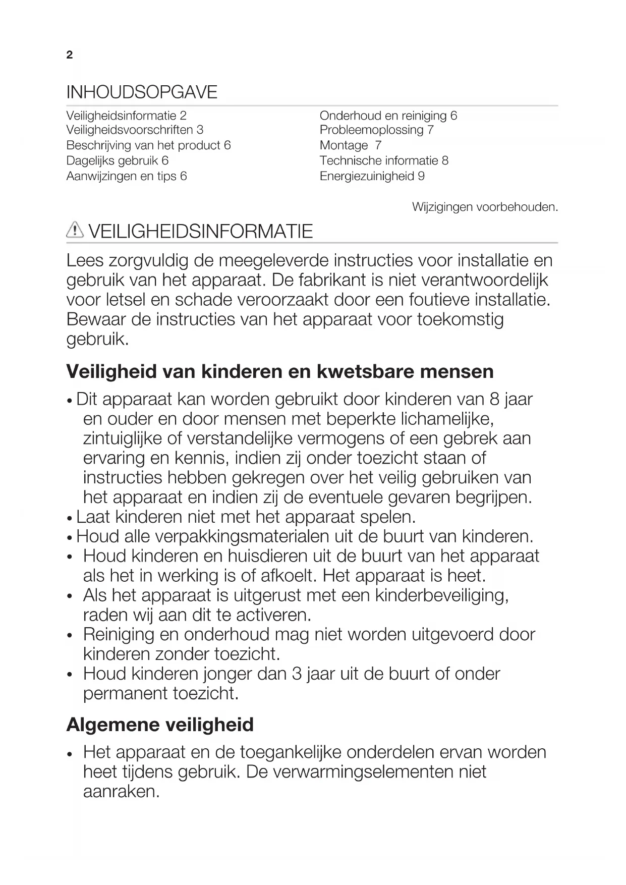 - Doe indien mogelijk altijd een deksel op de pan. 9• Gebruik de restwarmte om het eten warm te houden of te smelten. MILIEUBESCHERMING Recycle de materialen met het symbool . Gooi de verpakking in een geschikte verzamelcontainer om het te recyclen. Help om het milieu en de volksgezondheid te beschermen en recycle het afval van elektrische en elektronische apparaten. Gooi apparaten gemarkeerd met het symbool niet weg met het huishoudelijk afval. Breng het product naar het milieustation bij u in de buurt of neem contact op met de gemeente. 10CONTENTS Safety information 11 Safety instructions 12 Product description 14 Daily use 15 Hints and tips 15 Care and cleaning 15 Troubleshooting 15 Installation 16 Technical information 17 Energy efficiency 18 Subject to change without notice. SAFETY INFORMATION Before the installation and use of the appliance, carefully read the supplied instructions. The manufacturer is not responsible if an incorrect installation and use causes injuries and damages. Always keep the instructions with the appliance for future reference. Children and vulnerable people safety