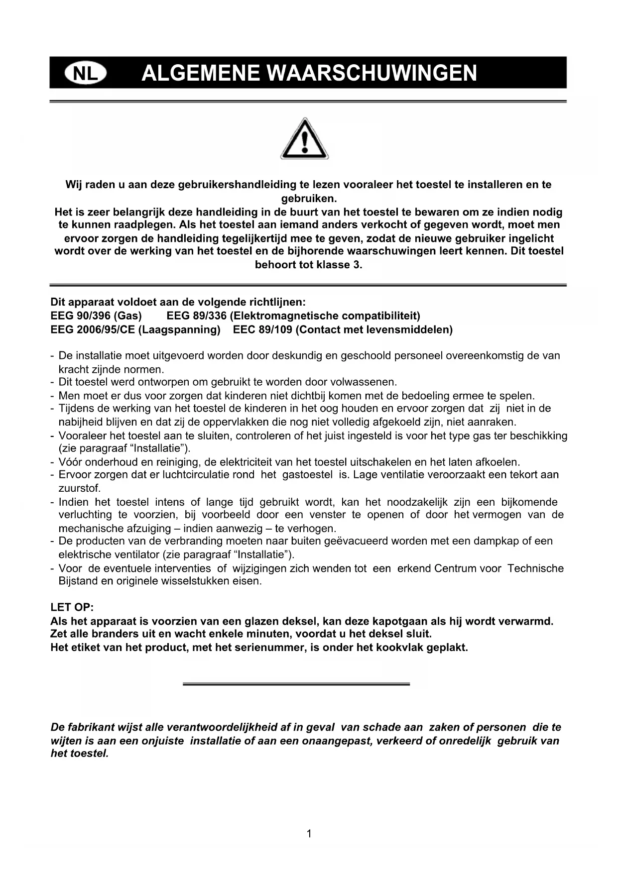 ALGEMENE WAARSCHUWINGEN Wij raden u aan deze gebruikershandleiding te lezen vooraleer het toestel te installeren en te gebruiken. Het is zeer belangrijk deze handleiding in de buurt van het toestel te bewaren om ze indien nodig te kunnen raadplegen. Als het toestel aan iemand anders verkocht of gegeven wordt, moet men ervoor zorgen de handleiding tegelijkertijd mee te geven, zodat de nieuwe gebruiker ingelicht wordt over de werking van het toestel en de bijhorende waarschuwingen leert kennen. Dit toestel behoort tot klasse 3. Dit apparaat voldoet aan de volgende richtlijnen: EEG 90/396 (Gas) EEG 89/336 (Elektromagnetische compatibiliteit) EEG 2006/95/CE (Laagspanning) EEC 89/109 (Contact met levensmiddelen) De installatie moet uitgevoerd worden door deskundig en geschoold personeel overeenkomstig de van kracht zijnde normen. Dit toestel werd ontworpen om gebruikt te worden door volwassenen. Men moet er dus voor zorgen dat kinderen niet dichtbij komen met de bedoeling ermee te spelen. Tijdens de werking van het toestel de kinderen in het oog houden en ervoor zorgen dat zij niet in de nabijheid blijven en dat zij de oppervlakken die nog niet volledig afgekoeld zijn, niet aanraken. Vooraleer het toestel aan te sluiten, controleren of het juist ingesteld is voor het type gas ter beschikking (zie paragraaf “Installatie”). Vóór onderhoud en reiniging, de elektriciteit van het toestel uitschakelen en het laten afkoelen. Ervoor zorgen dat er luchtcirculatie rond het gastoestel is. Lage ventilatie veroorzaakt een tekort aan zuurstof. Indien het toestel intens of lange tijd gebruikt wordt, kan het noodzakelijk zijn een bijkomende verluchting te voorzien, bij voorbeeld door een venster te openen of door het vermogen van de mechanische afzuiging – indien aanwezig – te verhogen. De producten van de verbranding moeten naar buiten geëvacueerd worden met een dampkap of een elektrische ventilator (zie paragraaf “Installatie”). Voor de eventuele interventies of wijzigingen zich wenden tot een erkend Centrum voor Technische Bijstand en originele wisselstukken eisen. LET OP: Als het apparaat is voorzien van een glazen deksel, kan deze kapotgaan als hij wordt verwarmd. Zet alle branders uit en wacht enkele minuten, voordat u het deksel sluit. Het etiket van het product, met het serienummer, is onder het kookvlak geplakt. De fabrikant wijst alle verantwoordelijkheid af in geval van schade aan zaken of personen die te wijten is aan een onjuiste installatie of aan een onaangepast, verkeerd of onredelijk gebruik van het toestel.