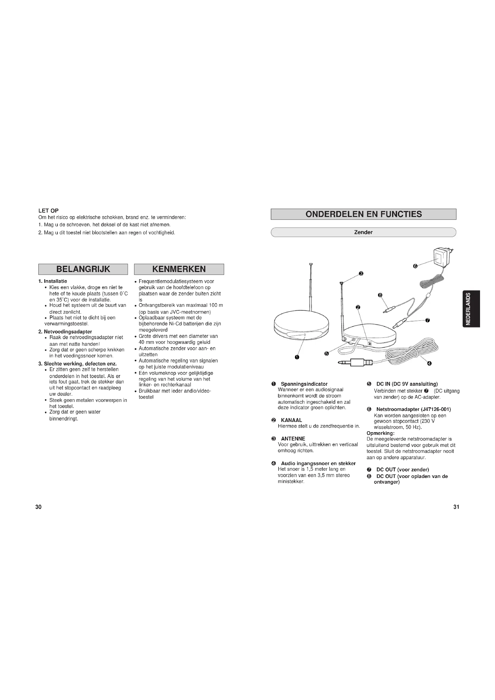 Zender 1 Spanningsindicator Wanneer er een audiosignaal binnenkomt wordt de stroom automatisch ingeschakeld en zal deze indicator groen oplichten. 2 KANAAL Hiermee stelt u de zendfrequentie in. 3 ANTENNE Voor gebruik, uittrekken en verticaal omhoog richten. 4 Audio ingangssnoer en stekker Het snoer is 1,5 meter lang en voorzien van een 3,5 mm stereo ministekker. 5 DC IN (DC 9V aansluiting) Verbinden met stekker 7 (DC uitgang van zender) op de AC-adapter. 6 Netstroomadapter (J47126-001) Kan worden aangesloten op een gewoon stopcontact (230 V wisselstroom, 50 Hz). Opmerking: De meegeleverde netstroomadapter is uitsluitend bestemd voor gebruik met dit toestel. Sluit de netstroomadapter nooit aan op andere apparatuur. 7 DC OUT (voor zender) 8 DC OUT (voor opladen van de ontvanger) NEDERLANDS