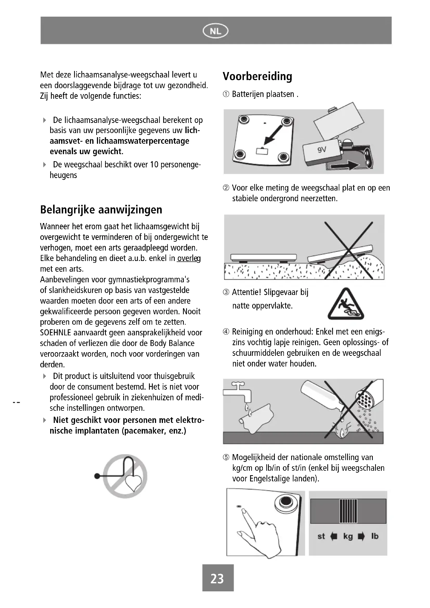 Aanbevelingen voor gymnastiekprogramma's of slankheidskuren op basis van vastgestelde waarden要去en door een arts of een andere gekwalificeerde persoon gegeven worden. Nooit proberen om de gegevens zich om te zetten. SOEHNLE aanvaardt geen aansprakelijkheid voor schaden of verliezen die door de Body Balanceveroorzaakt worden, noch voor vorderingen van derden.