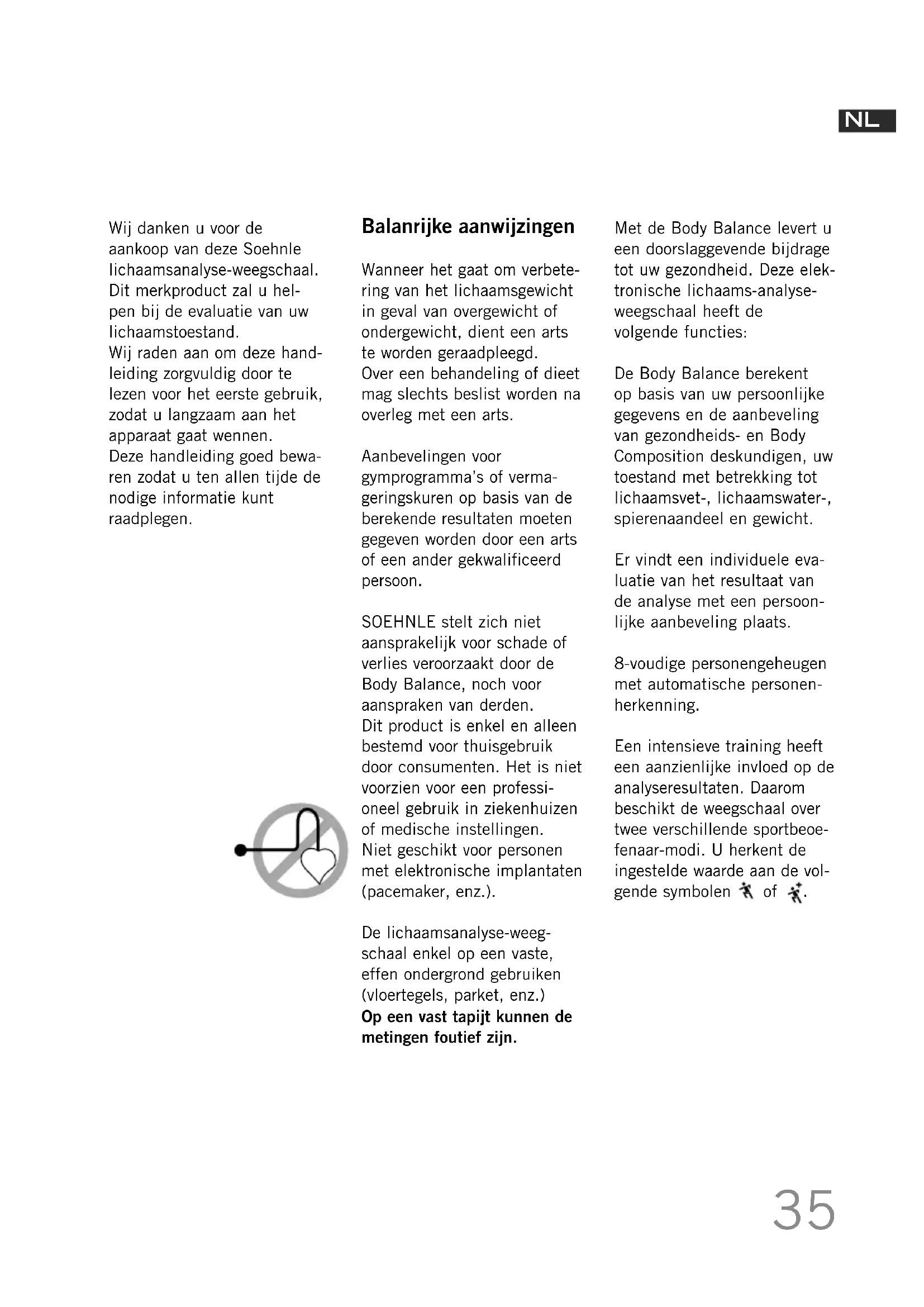 SOEHNLE stelt zich nicht aansprakelijk voor schade of verliesveroorzaakt door de Body Balance,noch voor aanspraken van derden. Dit product is enkel en alleen bestemd voor thuisgebruik door consumenten.Het is Niet voorzien voor een professionel gebruik in ziekenhuizen of medische instellenen. Niet geschikt voor personen met elektronische implantaten (pacemaker,enz.).