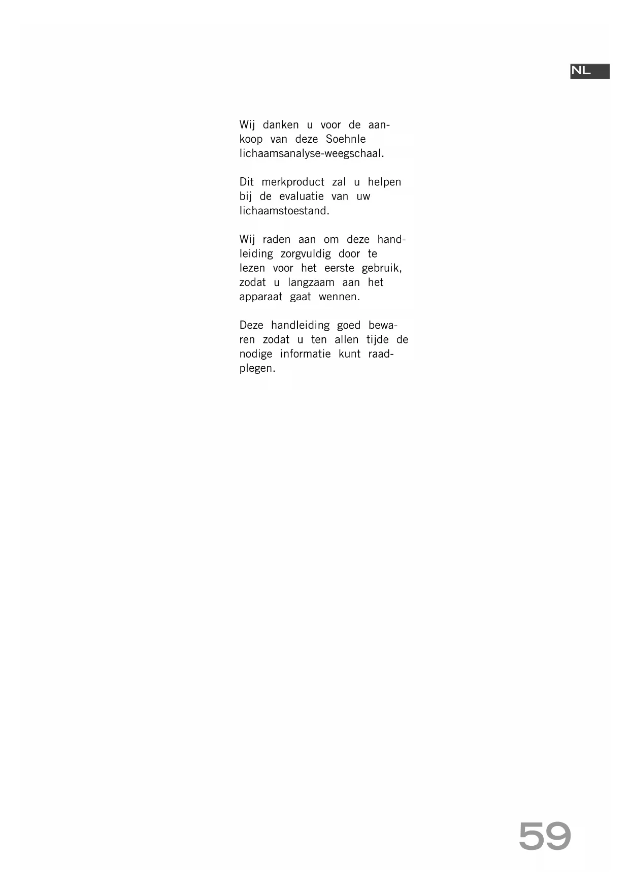BA63721slimF5_120863_V10.qxd:BA63721slimF5_120863_V9.qxd 05.01.2010 13:21 Uhr Seite 5859 Wij danken u voor de aan- koop van deze Soehnle lichaamsanalyse-weegschaal. Dit merkproduct zal u helpen bij de evaluatie van uw lichaamstoestand. Wij raden aan om deze hand- leiding zorgvuldig door te lezen voor het eerste gebruik, zodat u langzaam aan het apparaat gaat wennen. Deze handleiding goed bewa- ren zodat u ten allen tijde de nodige informatie kunt raad- plegen.