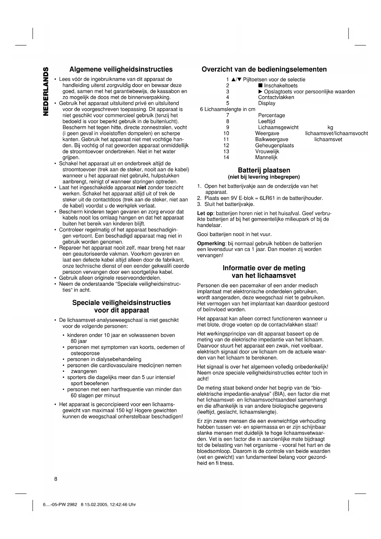 Let op: batterijen horen niet in het huisafval. Geef verbru- ikte batterijen af bij het gemeentelijke milieupark of bij de handelaar. Gooi batterijen nooit in het vuur. Opmerking: bij normaal gebruik hebben de batterijen een levensduur van ca 1 jaar. Dan moeten zij worden vervangen! Informatie over de meting van het lichaamsvet Personen die een pacemaker of een ander medisch implantaat met elektronische onderdelen gebruiken, wordt aangeraden, deze weegschaal niet te gebruiken. Het vermogen van het implantaat kan daardoor gestoord of beïnvloed worden. Het apparaat kan alleen correct functioneren wanneer u met blote, droge voeten op de contactvlakken staat! Het werkingsprincipe van dit apparaat baseert op de meting van de elektrische impedantie van het lichaam. Daarvoor stuurt het apparaat een zwak, niet voelbaar, elektrisch signaal door uw lichaam om de actuele waar- den van het lichaam te berekenen. Het signaal is over het algemeen volledig onbedenkelijk! Neem onze speciale veiligheidsinstructies echter toch in acht! De meting staat bekend onder het begrip van de “bio- elektrische impedantie-analyse” (BIA), een factor die met het lichaamsvet- en lichaamsvochtaandeel samenhangt en die afhankelijk is van andere biologische gegevens (leeftijd, geslacht, lichaamslengte). Er zijn zware mensen die een evenwichtige verhouding hebben tussen vet- en spiermassa en er zijn schijnbaar slanke mensen met duidelijk te hoge lichaamsvetwaar- den. Vet is een factor die in aanzienlijke mate bijdraagt tot de belasting van het organisme - vooral het hart en de bloedsomloop. Daarom is de controle van beide waarden (vet en gewicht) van fundamenteel belang voor gezond- heid en fi tness. 6....-05-PW 2982 8 15.02.2005, 12:42:46 Uhr9 NEDERLANDS Lichaamsvet Lichaamsvet is een belangrijk bestanddeel van het orga- nisme. Van de bescherming van de gewrichten tot en met vitamineopslag en de regeling van de lichaamstempe- ratuur vervult vet een belangrijke rol in ons lichaam. Het doel is dus niet om het lichaamsvet radicaal te vermin- deren, maar om een evenwichtige verhouding te vinden tussen vet- en spiermassa en deze te handhaven. De betekenis van water voor onze gezondheid Het menselijke organisme bestaat voor ongeveer 55-60% uit water, al naargelang de leeftijd en het geslacht in verschillende hoeveelheid. Water heeft een reeks van taken in het lichaam te vervullen.