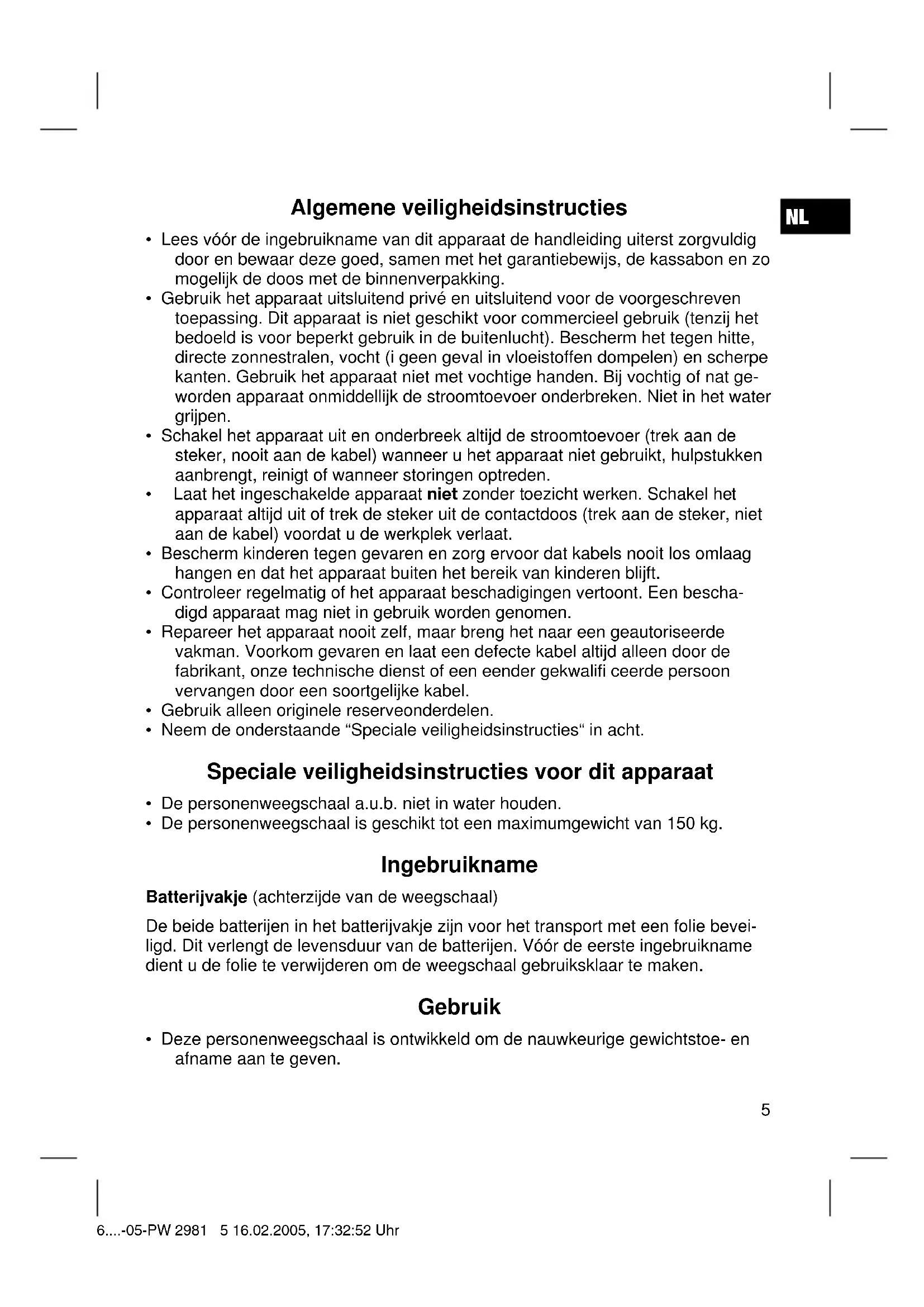 - Deze personenweegschaal is ontwikkeld om de nauwkeurige gewichtstoe- en afname aan te geven. 6....-05-PW 2981 5 16.02.2005, 17:32:52 UhrNL