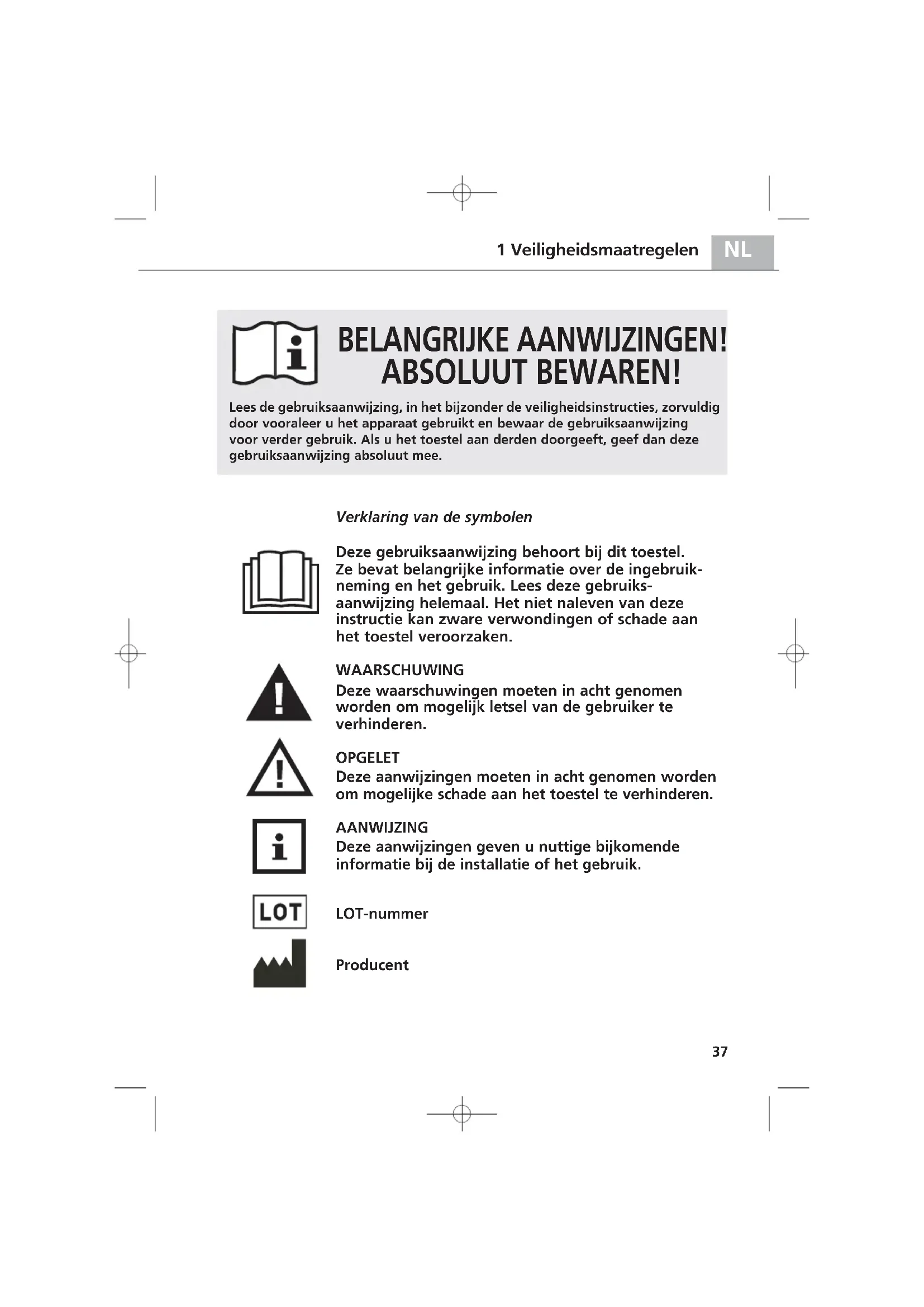 1 Veiligheidsmaatregelen BELANGRIJKE AANWIJZINGEN! ABSOLUUT BEWAREN! Deze gebruiksaanwijzing behoort bij dit toestel. Ze bevat belangrijke informatie over de ingebruik- neming en het gebruik. Lees deze gebruiks- aanwijzing helemaal. Het niet naleven van deze instructie kan zware verwondingen of schade aan het toestel veroorzaken. WAARSCHUWING Deze waarschuwingen moeten in acht genomen worden om mogelijk letsel van de gebruiker te verhinderen. OPGELET Deze aanwijzingen moeten in acht genomen worden om mogelijke schade aan het toestel te verhinderen. AANWIJZING Deze aanwijzingen geven u nuttige bijkomende informatie bij de installatie of het gebruik. LOT-nummer Producent Lees de gebruiksaanwijzing, in het bijzonder de veiligheidsinstructies, zorvuldigdoor vooraleer u het apparaat gebruikt en bewaar de gebruiksaanwijzing voor verder gebruik. Als u het toestel aan derden doorgeeft, geef dan dezegebruiksaanwijzing absoluut mee. Verklaring van de symbolen38 1 Veiligheidsmaatregelen