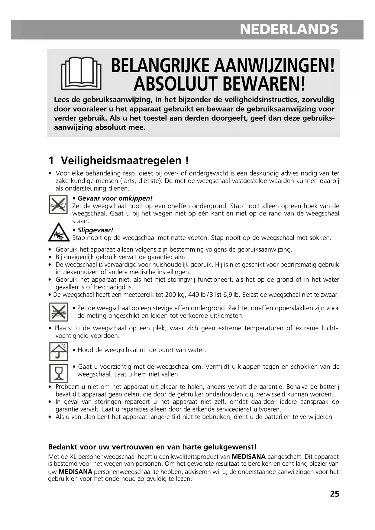 - Zet de weegschaal op een stevige effen ondergrond. Zachte, oneffen oppervlakken zijn voorde meting ongeschikt en leiden tot verkeerde uitkomsten.• Plaatst u de weegschaal op een plek, waar zich geen extreme temperaturen of extreme lucht-vochtigheid voordoen.• Houd de weegschaal uit de buurt van water.• Gaat u voorzichtig met de weegschaal om. Vermijdt u klappen tegen en schokken van deweegschaal. Laat u hem niet vallen. Probeert u niet om het apparaat uit elkaar te halen, anders vervalt die garantie. Behalve de batterijbevat dit apparaat geen delen, die door de gebruiker onderhouden c.q. verwisseld kunnen worden. In geval van storingen repareert u het apparaat niet zelf, omdat daardoor iedere aanspraak opgarantie vervalt. Laat u reparaties alleen door de erkende servicedienst uitvoeren. Als u van plan bent het apparaat langere tijd niet te gebruiken, dient u de batterijen te verwijderen. Bedankt voor uw vertrouwen en van harte gelukgewenst! Met de XL personenweegschaal heeft u een kwaliteitsproduct van MEDISANA aangeschaft. Dit apparaat is bestemd voor het wegen van personen. Om het gewenste resultaat te bereiken en echt lang plezier van uw MEDISANA personenweegschaal te hebben, adviseren wij u, de onderstaande aanwijzingen voor het gebruik en voor het onderhoud zorgvuldig te lezen.40433_XL_Personenwaage_PS_460_29.07.qxd:Kompakt-GA 29.07.2013 21:23 Uhr Seite 2526 NEDERLANDS