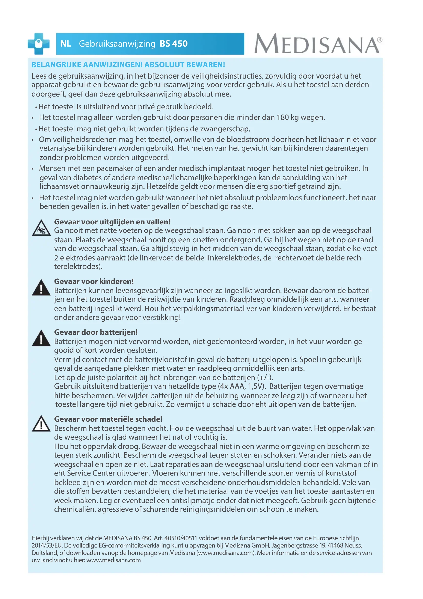 - Het toestel mag niet worden gebruikt wanneer het niet absoluut probleemloos functioneert, het naar beneden gevallen is, in het water gevallen of beschadigd raakte. Gevaar voor uitglijden en vallen! Ga nooit met natte voeten op de weegschaal staan. Ga nooit met sokken aan op de weegschaal staan. Plaats de weegschaal nooit op een oneen ondergrond. Ga bij het wegen niet op de rand van de weegschaal staan. Ga altijd stevig in het midden van de weegschaal staan, zodat elke voet 2 elektrodes aanraakt (de linkervoet de beide linkerelektrodes, de rechtervoet de beide rech- terelektrodes). Gevaar voor kinderen! Batterijen kunnen levensgevaarlijk zijn wanneer ze ingeslikt worden. Bewaar daarom de batteri- jen en het toestel buiten de reikwijdte van kinderen. Raadpleeg onmiddellijk een arts, wanneer een batterij ingeslikt werd. Hou het verpakkingsmateriaal ver van kinderen verwijderd. Er bestaat onder andere gevaar voor verstikking! Gevaar door batterijen! Batterijen mogen niet vervormd worden, niet gedemonteerd worden, in het vuur worden ge- gooid of kort worden gesloten. Vermijd contact met de batterijvloeistof in geval de batterij uitgelopen is. Spoel in gebeurlijk geval de aangedane plekken met water en raadpleeg onmiddellijk een arts. Let op de juiste polariteit bij het inbrengen van de batterijen (+/-). Gebruik uitsluitend batterijen van hetzelfde type (4x AAA, 1,5V). Batterijen tegen overmatige hitte beschermen. Verwijder batterijen uit de behuizing wanneer ze leeg zijn of wanneer u het toestel langere tijd niet gebruikt. Zo vermijdt u schade door eht uitlopen van de batterijen. Gevaar voor materiële schade! Bescherm het toestel tegen vocht. Hou de weegschaal uit de buurt van water. Het oppervlak van de weegschaal is glad wanneer het nat of vochtig is. Hou het oppervlak droog. Bewaar de weegschaal niet in een warme omgeving en bescherm ze tegen sterk zonlicht. Bescherm de weegschaal tegen stoten en schokken. Verander niets aan de weegschaal en open ze niet. Laat reparaties aan de weegschaal uitsluitend door een vakman of in eht Service Center uitvoeren. Vloeren kunnen met verschillende soorten vernis of kunststof bekleed zijn en worden met de meest verscheidene onderhoudsmiddelen behandeld. Vele van die stoen bevatten bestanddelen, die het materiaal van de voetjes van het toestel aantasten en week maken. Leg er eventueel een antislipmatje onder dat niet meegeeft. Gebruik geen bijtende chemicaliën, agressieve of schurende reinigingsmiddelen om schoon te maken. Hierbij verklaren wij dat de MEDISANA BS 450, Art. 40510/40511 voldoet aan de fundamentele eisen van de Europese richtlijn 2014/53/EU. De volledige EG-conformiteitsverklaring kunt u opvragen bij Medisana GmbH, Jagenbergstrasse 19, 41468 Neuss, Duitsland, of downloaden vanop de homepage van Medisana (www.medisana.com). Meer informatie en de service-adressen van uw land vindt u hier: www.medisana.com27 BS 450 Gebruiksaanwijzing NL B) Instellen van de persoonlijke gegevens op de weegschaal / Wegen met de analysefunctie De weegschaal kan de gegevens (geslacht, atleetmodus, lengte, leeftijd) van 8 personen opslaan. Druk met de voet kort op het midden van het weegschaaloppervlak . Druk kort op de OK-sensortoets . Kies met de toetsen " ▲ " en " ▼