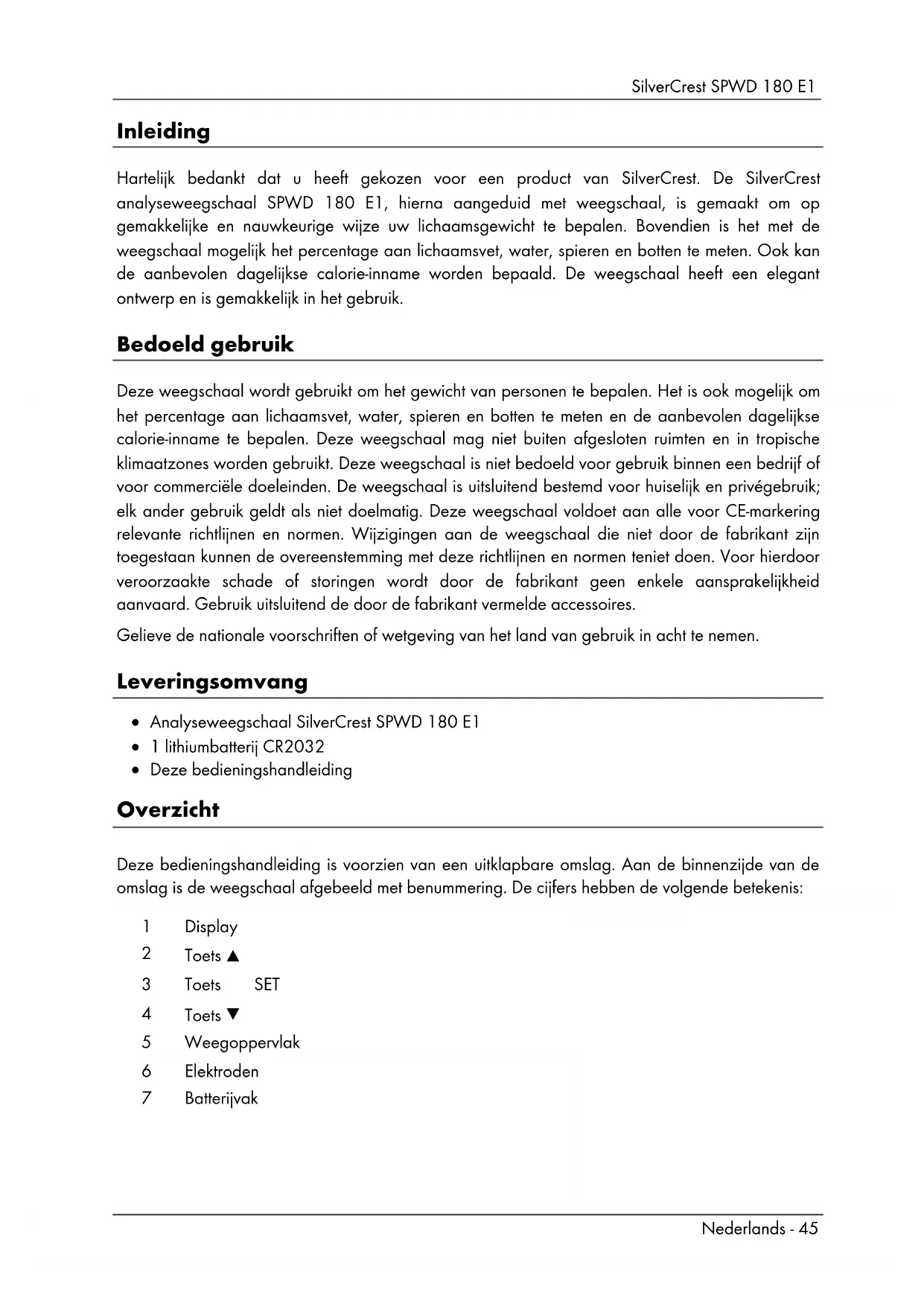 - Service en garantie SilverCrest SPWD 180 E1 Nederlands - 45 Inleiding Hartelijk bedankt dat u heeft gekozen voor een product van SilverCrest. De SilverCrest analyseweegschaal SPWD 180 E1, hierna aangeduid met weegschaal, is gemaakt om op gemakkelijke en nauwkeurige wijze uw lichaamsgewicht te bepalen. Bovendien is het met de weegschaal mogelijk het percentage aan lichaamsvet, water, spieren en botten te meten. Ook kan de aanbevolen dagelijkse calorie-inname worden bepaald. De weegschaal heeft een elegant ontwerp en is gemakkelijk in het gebruik. Bedoeld gebruik Deze weegschaal wordt gebruikt om het gewicht van personen te bepalen. Het is ook mogelijk om het percentage aan lichaamsvet, water, spieren en botten te meten en de aanbevolen dagelijkse calorie-inname te bepalen. Deze weegschaal mag niet buiten afgesloten ruimten en in tropische klimaatzones worden gebruikt. Deze weegschaal is niet bedoeld voor gebruik binnen een bedrijf of voor commerciële doeleinden. De weegschaal is uitsluitend bestemd voor huiselijk en privégebruik; elk ander gebruik geldt als niet doelmatig. Deze weegschaal voldoet aan alle voor CE-markering relevante richtlijnen en normen. Wijzigingen aan de weegschaal die niet door de fabrikant zijn toegestaan kunnen de overeenstemming met deze richtlijnen en normen teniet doen. Voor hierdoor veroorzaakte schade of storingen wordt door de fabrikant geen enkele aansprakelijkheid aanvaard. Gebruik uitsluitend de door de fabrikant vermelde accessoires. Gelieve de nationale voorschriften of wetgeving van het land van gebruik in acht te nemen. Leveringsomvang Analyseweegschaal SilverCrest SPWD 180 E1 1 lithiumbatterij CR2032 Deze bedieningshandleiding Overzicht Deze bedieningshandleiding is voorzien van een uitklapbare omslag. Aan de binnenzijde van de omslag is de weegschaal afgebeeld met benummering. De cijfers hebben de volgende betekenis: 1 Display p. 56