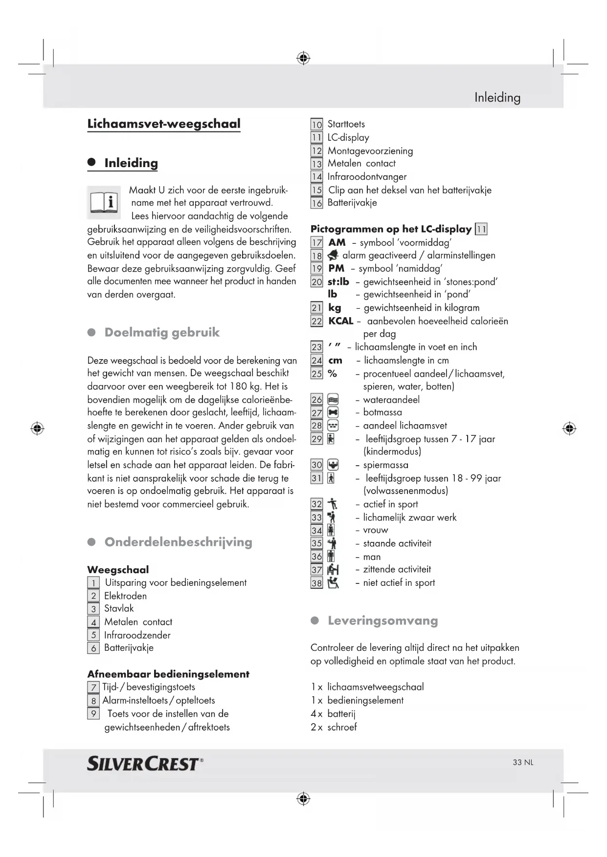 Leveringsomvang Controleer de levering altijd direct na het uitpakken op volledigheid en optimale staat van het product. 1 x lichaamsvetweegschaal 1 x bedieningselement 4 x batterij 2 x schroef34 NL Inleiding / Veiligheid 2 x plug 1 x gebruiksaanwijzing