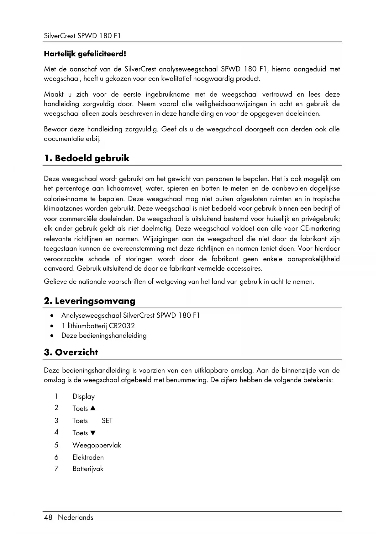 Hartelijk gefeliciteerd! Met de aanschaf van de SilverCrest analyseweegschaal SPWD 180 F1, hierna aangeduid met weegschaal, heeft u gekozen voor een kwalitatief hoogwaardig product. Maakt u zich voor de eerste ingebruikname met de weegschaal vertrouwd en lees deze handleiding zorgvuldig door. Neem vooral alle veiligheidsaanwijzingen in acht en gebruik de weegschaal alleen zoals beschreven in deze handleiding en voor de opgegeven doeleinden. Bewaar deze handleiding zorgvuldig. Geef als u de weegschaal doorgeeft aan derden ook alle documentatie erbij.