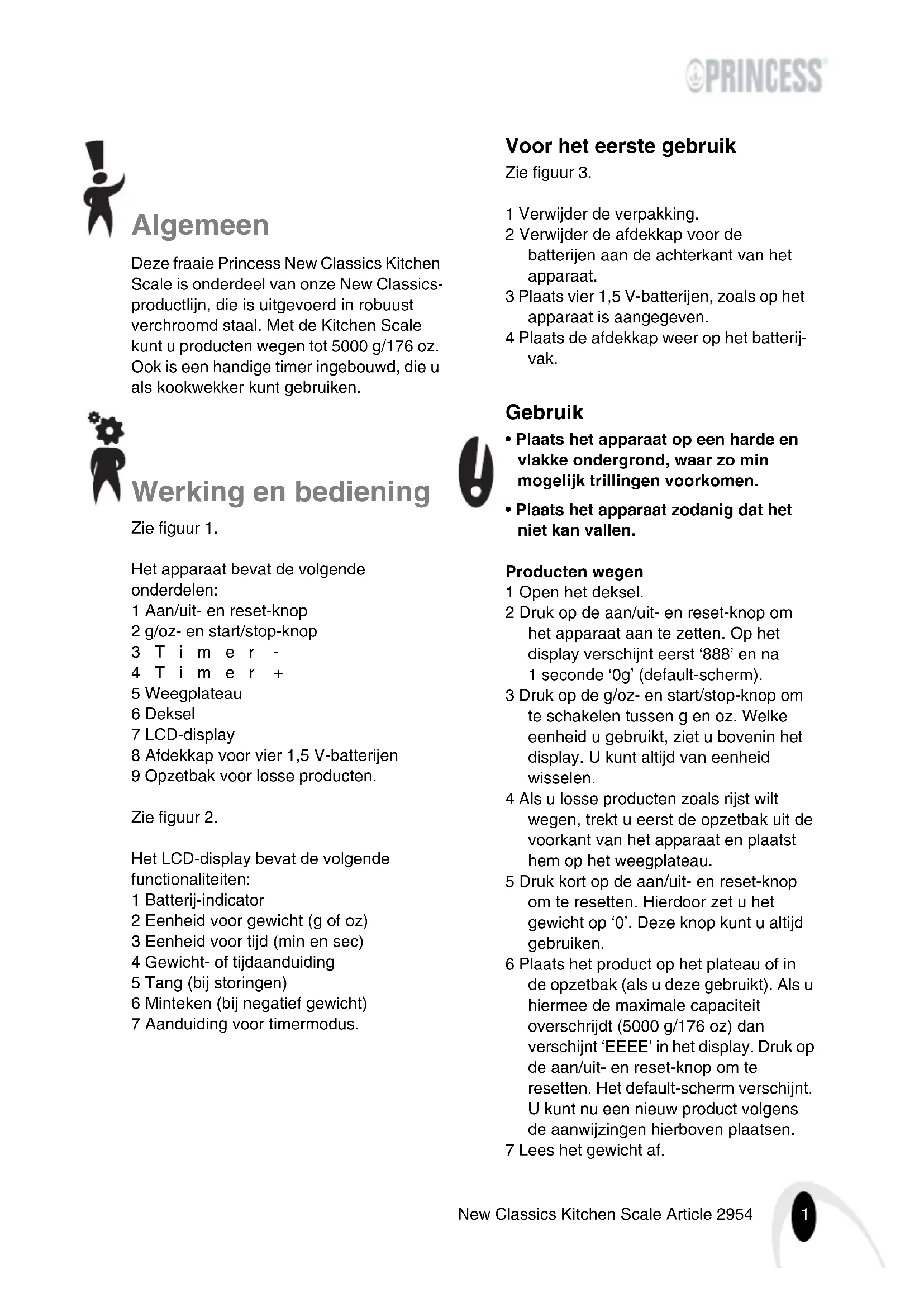 - Plaats het apparaat zodanig dat het niet kan vallen. Producten wegen 1 Open het deksel. 2 Druk op de aan/uit- en reset-knop om het apparaat aan te zetten. Op het display verschijnt eerst ‘888’ en na 1 seconde ‘0g’ (default-scherm). 3 Druk op de g/oz- en start/stop-knop om te schakelen tussen g en oz. Welke eenheid u gebruikt, ziet u bovenin het display. U kunt altijd van eenheid wisselen. 4 Als u losse producten zoals rijst wilt wegen, trekt u eerst de opzetbak uit de voorkant van het apparaat en plaatst hem op het weegplateau. 5 Druk kort op de aan/uit- en reset-knop om te resetten. Hierdoor zet u het gewicht op ‘0’. Deze knop kunt u altijd gebruiken. 6 Plaats het product op het plateau of in de opzetbak (als u deze gebruikt). Als u hiermee de maximale capaciteit overschrijdt (5000 g/176 oz) dan verschijnt ‘EEEE’ in het display. Druk op de aan/uit- en reset-knop om te resetten. Het default-scherm verschijnt. U kunt nu een nieuw product volgens de aanwijzingen hierboven plaatsen. 7 Lees het gewicht af.2 New Classics Kitchen Scale Article 2954 8 Pak het product (eventueel met de opzetbak) van het apparaat af. Het apparaat kan een negatief gewicht aan- geven. Er verschijnt dan een ‘-’-teken links in het display. 9 Druk gedurende 1 seconde de aan/uit- en reset-knop in om het apparaat uit te schakelen. Het apparaat schakelt ook vanzelf uit als u het gedurende 1 minuut niet gebruikt. Timer instellen U kunt altijd de timer inschakelen. 1 Open het deksel. 2 Druk op de aan/uit- en reset-knop om het apparaat aan te zetten. Op het display verschijnt eerst ‘888’ en na 1 seconde ‘0g’ (default-scherm). 3 Druk op ‘timer -’ of ‘timer +’ om de timer in te schakelen. Er verschijnt een klokje