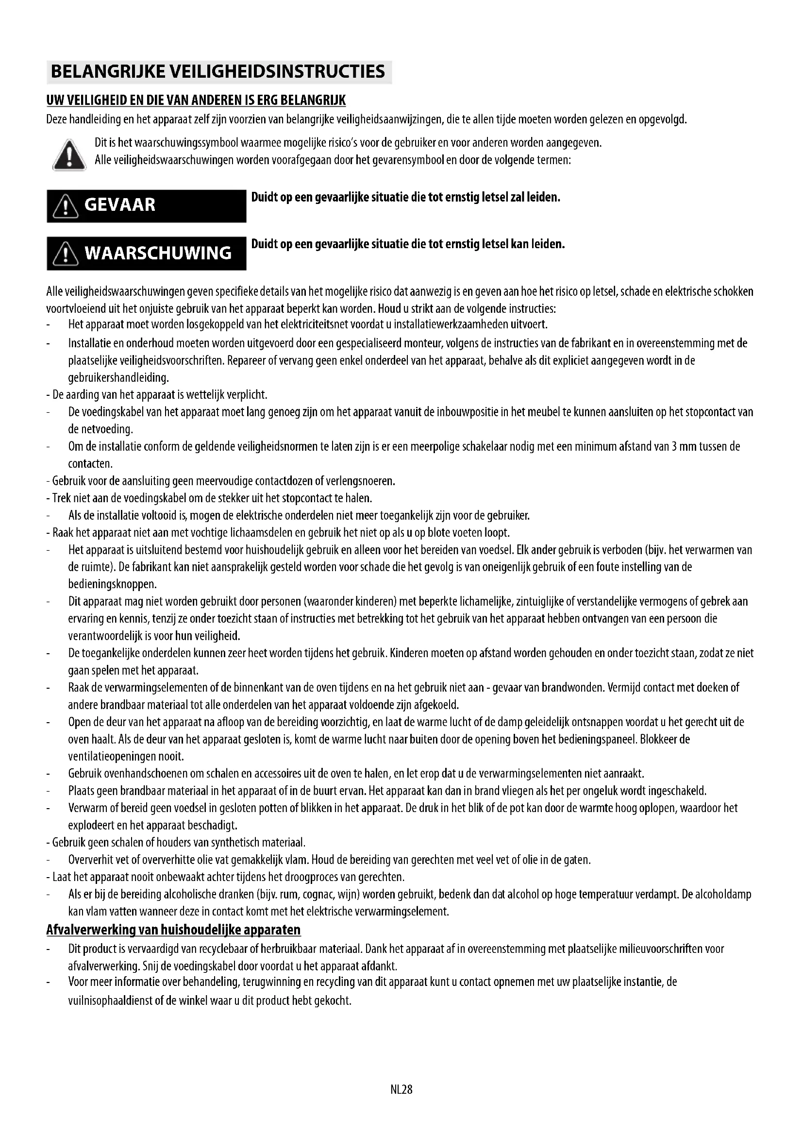 UW VEILIGHEID EN DIE VAN ANDEREN IS ERG BELANGRIJK Deze handleiding en het apparaat zelf zijn voorzien van belangrijke veiligheidsaanwijzingen, die te allen tijde moeten worden gelezen en opgevolgd. Alle veiligheidswaarschuwingen geven specifieke details van het mogelijke risico dat aanwezig is en geven aan hoe het risico op letsel, schade en elektrische schokken voortvloeiend uit het onjuiste gebruik van het apparaat beperkt kan worden. Houd u strikt aan de volgende instructies: - Het apparaat moet worden losgekoppeld van het elektriciteitsnet voordat u installatiewerkzaamheden uitvoert. - Installatie en onderhoud moeten worden uitgevoerd door een gespecialiseerd monteur, volgens de instructies van de fabrikant en in overeenstemming met de plaatselijke veiligheidsvoorschriften. Repareer of vervang geen enkel onderdeel van het apparaat, behalve als dit expliciet aangegeven wordt in de gebruikershandleiding. - De aarding van het apparaat is wettelijk verplicht. - De voedingskabel van het apparaat moet lang genoeg zijn om het apparaat vanuit de inbouwpositie in het meubel te kunnen aansluiten op het stopcontact van de netvoeding. - Om de installatie conform de geldende veiligheidsnormen te laten zijn is er een meerpolige schakelaar nodig met een minimum afstand van 3 mm tussen de contacten. - Gebruik voor de aansluiting geen meervoudige contactdozen of verlengsnoeren. - Trek niet aan de voedingskabel om de stekker uit het stopcontact te halen. - Als de installatie voltooid is, mogen de elektrische onderdelen niet meer toegankelijk zijn voor de gebruiker. - Raak het apparaat niet aan met vochtige lichaamsdelen en gebruik het niet op als u op blote voeten loopt. - Het apparaat is uitsluitend bestemd voor huishoudelijk gebruik en alleen voor het bereiden van voedsel. Elk ander gebruik is verboden (bijv. het verwarmen van de ruimte). De fabrikant kan niet aansprakelijk gesteld worden voor schade die het gevolg is van oneigenlijk gebruik of een foute instelling van de bedieningsknoppen. - Dit apparaat mag niet worden gebruikt door personen (waaronder kinderen) met beperkte lichamelijke, zintuiglijke of verstandelijke vermogens of gebrek aan ervaring en kennis, tenzij ze onder toezicht staan of instructies met betrekking tot het gebruik van het apparaat hebben ontvangen van een persoon die verantwoordelijk is voor hun veiligheid. - De toegankelijke onderdelen kunnen zeer heet worden tijdens het gebruik. Kinderen moeten op afstand worden gehouden en onder toezicht staan, zodat ze niet gaan spelen met het apparaat. - Raak de verwarmingselementen of de binnenkant van de oven tijdens en na het gebruik niet aan - gevaar van brandwonden. Vermijd contact met doeken of andere brandbaar materiaal tot alle onderdelen van het apparaat voldoende zijn afgekoeld. - Open de deur van het apparaat na afloop van de bereiding voorzichtig, en laat de warme lucht of de damp geleidelijk ontsnappen voordat u het gerecht uit de oven haalt. Als de deur van het apparaat gesloten is, komt de warme lucht naar buiten door de opening boven het bedieningspaneel. Blokkeer de ventilatieopeningen nooit. - Gebruik ovenhandschoenen om schalen en accessoires uit de oven te halen, en let erop dat u de verwarmingselementen niet aanraakt. - Plaats geen brandbaar materiaal in het apparaat of in de buurt ervan. Het apparaat kan dan in brand vliegen als het per ongeluk wordt ingeschakeld. - Verwarm of bereid geen voedsel in gesloten potten of blikken in het apparaat. De druk in het blik of de pot kan door de warmte hoog oplopen, waardoor het explodeert en het apparaat beschadigt. - Gebruik geen schalen of houders van synthetisch materiaal. - Oververhit vet of oververhitte olie vat gemakkelijk vlam. Houd de bereiding van gerechten met veel vet of olie in de gaten. - Laat het apparaat nooit onbewaakt achter tijdens het droogproces van gerechten. - Als er bij de bereiding alcoholische dranken (bijv. rum, cognac, wijn) worden gebruikt, bedenk dan dat alcohol op hoge temperatuur verdampt. De alcoholdamp kan vlam vatten wanneer deze in contact komt met het elektrische verwarmingselement. Afvalverwerking van huishoudelijke apparaten - Dit product is vervaardigd van recyclebaar of herbruikbaar materiaal. Dank het apparaat af in overeenstemming met plaatselijke milieuvoorschriften voor afvalverwerking. Snij de voedingskabel door voordat u het apparaat afdankt. - Voor meer informatie over behandeling, terugwinning en recycling van dit apparaat kunt u contact opnemen met uw plaatselijke instantie, de vuilnisophaaldienst of de winkel waar u dit product hebt gekocht. BELANGRIJKE VEILIGHEIDSINSTRUCTIES Dit is het waarschuwingssymbool waarmee mogelijke risico’s voor de gebruiker en voor anderen worden aangegeven. Alle veiligheidswaarschuwingen worden voorafgegaan door het gevarensymbool en door de volgende termen: GEVAAR Duidt op een gevaarlijke situatie die tot ernstig letsel zal leiden. WAARSCHUWING Duidt op een gevaarlijke situatie die tot ernstig letsel kan leiden.NL29 Controleer na het uitpakken van de oven of het apparaat tijdens het transport geen beschadigingen heeft opgelopen en of de ovendeur goed sluit. Neem in geval van twijfel contact op met uw leverancier of de klantenservice. Om eventuele schade te voorkomen wordt geadviseerd om de oven pas voor de installatie van de piepschuim bodem te halen. GEREEDMAKING VAN HET MEUBEL VOOR INBOUW VAN DE OVEN