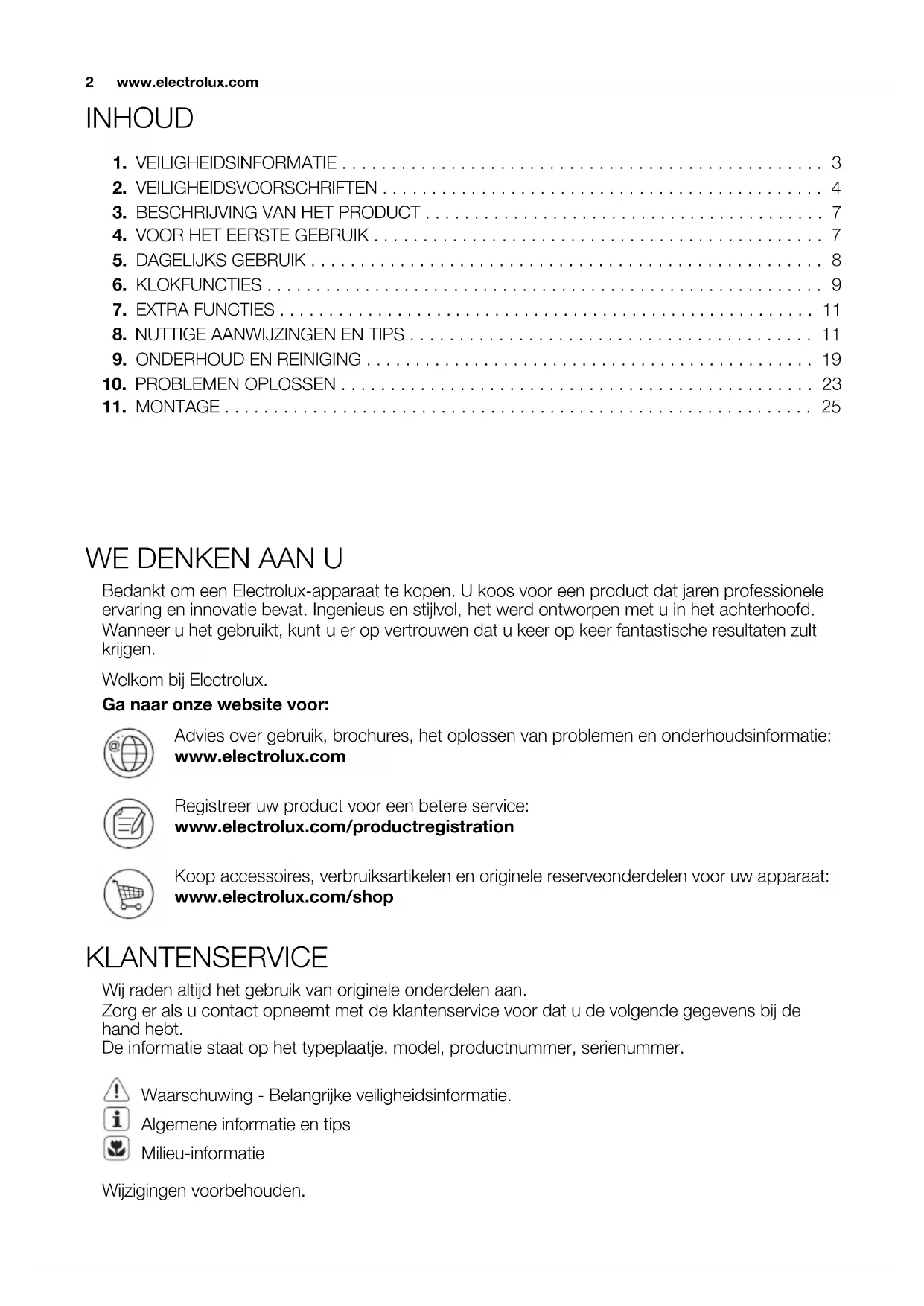 Bedankt om een Electrolux-apparaat te kopen. U koos voor een product dat jaren professionele ervaring en innovatie bevat. Ingenieus en stijlvol, het werd ontworpen met u in het achterhoofd. Wanneer u het gebruikt, kunt u er op vertrouwen dat u keer op keer fantastische resultaten zult krijgen. Welkom bij Electrolux. Ga naar onze website voor: Advies over gebruik, brochures, het oplossen van problemen en onderhoudsinformatie: www.electrolux.com Registreer uw product voor een betere service: www.electrolux.com/productregistration Koop accessoires, verbruiksartikelen en originele reserveonderdelen voor uw apparaat: www.electrolux.com/shop KLANTENSERVICE Wij raden altijd het gebruik van originele onderdelen aan. Zorg er als u contact opneemt met de klantenservice voor dat u de volgende gegevens bij de hand hebt. De informatie staat op het typeplaatje. model, productnummer, serienummer. Waarschuwing - Belangrijke veiligheidsinformatie. Algemene informatie en tips Milieu-informatie Wijzigingen voorbehouden.