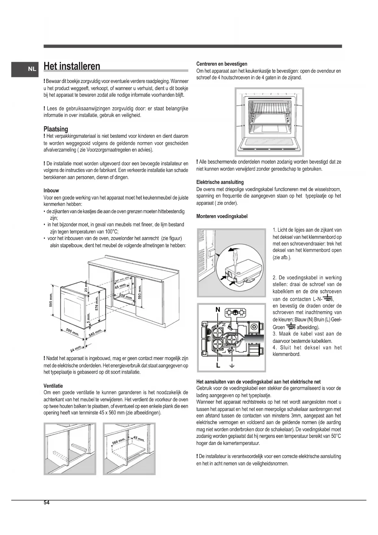- voor het inbouwen van de oven, zowelonder het aanrecht (zie guur) alsin stapelbouw, dient het meubel de volgende afmetingen te hebben: 595 mm. 595 mm. 24 mm. 545 mm.5 mm.576 mm.23 mm.593 mm.45 mm.558 mm. 547 mm. min. ! Nadat het apparaat is ingebouwd, mag er geen contact meer mogelijk zijn met de elektrische onderdelen. Het energieverbruik dat staat aangegeven op het typeplaatje is gebaseerd op dit soort installatie. Ventilatie Om een goede ventilatie te kunnen garanderen is het noodzakelijk de achterkant van het meubel te verwijderen. Het verdient de voorkeur de oven op twee houten balken te plaatsen, of eventueel op een enkele plank die een opening heeft van tenminste 45 x 560 mm (zie afbeeldingen). 560 mm. 45 mm. Centreren en bevestigen Om het apparaat aan het keukenkastje te bevestigen: open de ovendeur en schroef de 4 houtschroeven in de 4 gaten in de zijrand. ! Alle beschermende onderdelen moeten zodanig worden bevestigd dat ze niet kunnen worden verwijderd zonder gereedschap te gebruiken. Elektrische aansluiting De ovens met driepolige voedingskabel functioneren met de wisselstroom, spanning en frequentie die aangegeven staan op het typeplaatje op het apparaat ( zie onder). Monteren voedingskabel