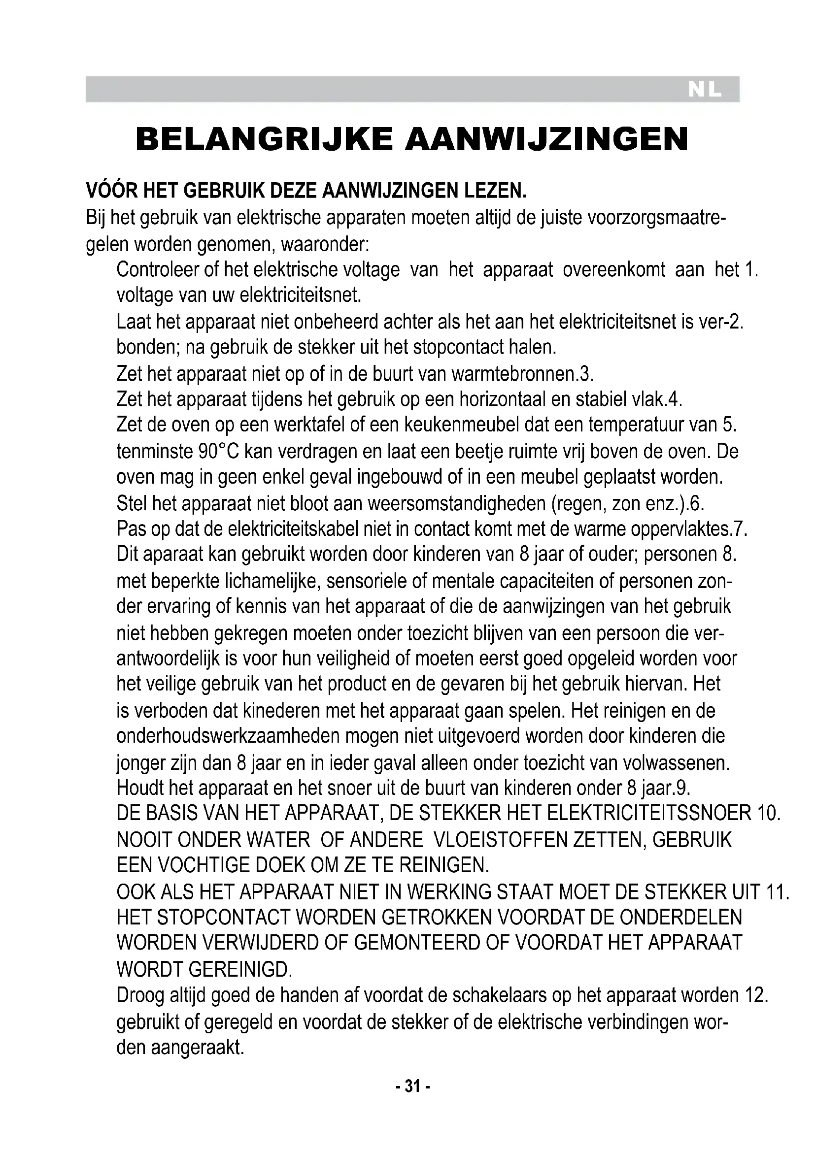 BELANGRIJKE AANWIJZINGEN VÓÓR hET GEBRUIK DEZE AANWIJZINGEN LEZEN. Bij het gebruik van elektrische apparaten moeten altijd de juiste voorzorgsmaatre- gelen worden genomen, waaronder: Controleer of het elektrische voltage van het apparaat overeenkomt aan het 1. voltage van uw elektriciteitsnet. Laat het apparaat niet onbeheerd achter als het aan het elektriciteitsnet is ver-2. bonden; na gebruik de stekker uit het stopcontact halen. Zet het apparaat niet op of in de buurt van warmtebronnen.3. Zet het apparaat tijdens het gebruik op een horizontaal en stabiel vlak.4. Zet de oven op een werktafel of een keukenmeubel dat een temperatuur van 5. tenminste 90°C kan verdragen en laat een beetje ruimte vrij boven de oven. De oven mag in geen enkel geval ingebouwd of in een meubel geplaatst worden. Stel het apparaat niet bloot aan weersomstandigheden (regen, zon enz.).6. Pas op dat de elektriciteitskabel niet in contact komt met de warme oppervlaktes.7. Dit aparaat kan gebruikt worden door kinderen van 8 jaar of ouder; personen 8. met beperkte lichamelijke, sensoriele of mentale capaciteiten of personen zon- der ervaring of kennis van het apparaat of die de aanwijzingen van het gebruik niet hebben gekregen moeten onder toezicht blijven van een persoon die ver- antwoordelijk is voor hun veiligheid of moeten eerst goed opgeleid worden voor het veilige gebruik van het product en de gevaren bij het gebruik hiervan. Het is verboden dat kinederen met het apparaat gaan spelen. Het reinigen en de onderhoudswerkzaamheden mogen niet uitgevoerd worden door kinderen die jonger zijn dan 8 jaar en in ieder gaval alleen onder toezicht van volwassenen. Houdt het apparaat en het snoer uit de buurt van kinderen onder 8 jaar.9. DE BASIS VAN HET APPARAAT, DE STEKKER HET ELEKTRICITEITSSNOER 10. NOOIT ONDER WATER OF ANDERE VLOEISTOFFEN ZETTEN, GEBRUIK EEN VOCHTIGE DOEK OM ZE TE REINIGEN. OOK ALS HET APPARAAT NIET IN WERKING STAAT MOET DE STEKKER UIT 11. HET STOPCONTACT WORDEN GETROKKEN VOORDAT DE ONDERDELEN WORDEN VERWIJDERD OF GEMONTEERD OF VOORDAT HET APPARAAT WORDT GEREINIGD. Droog altijd goed de handen af voordat de schakelaars op het apparaat worden 12. gebruikt of geregeld en voordat de stekker of de elektrische verbindingen wor- den aangeraakt.NL