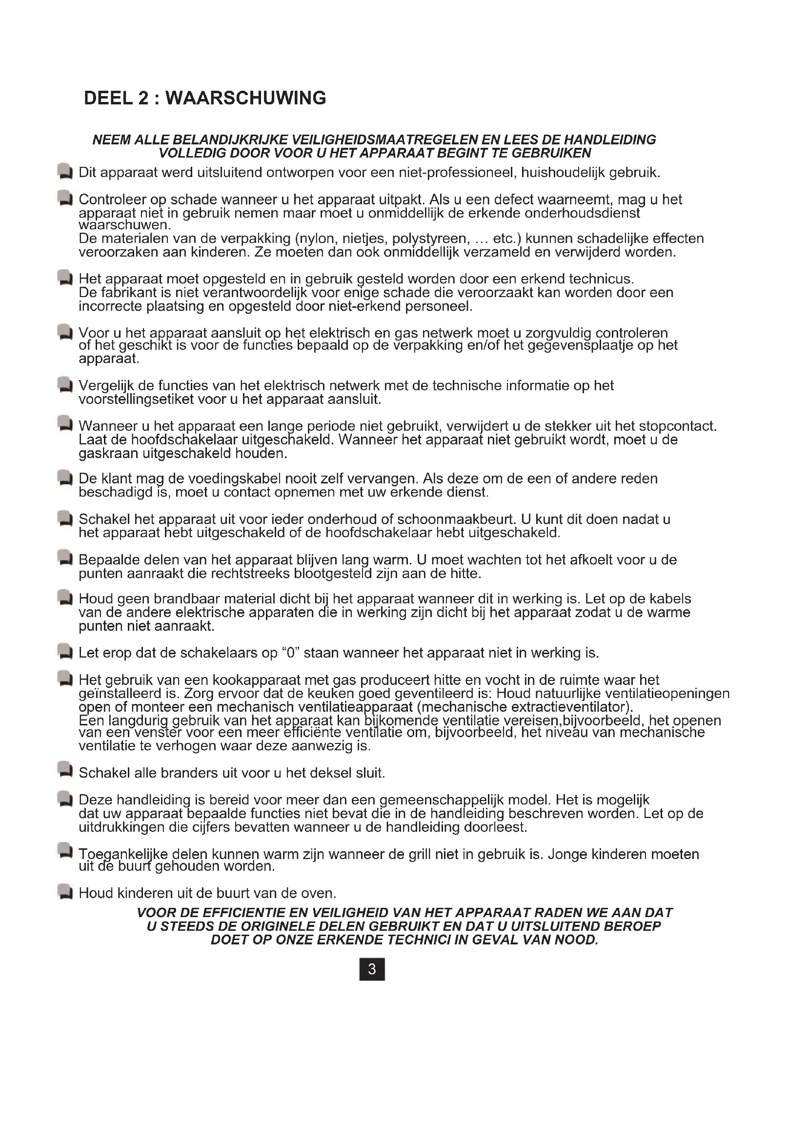 Uw apparaat is geproduceerd conform met de betrokken veiligheidsinstructies verbonden aan elektrische apparaten. Het onderhoud en de reparaties moeten uitgevoerd worden door een erkende technicus die door de producent is opgeleid. Installaties en reparaties zonder de onderstaande regels te volgen kan gevaren inhouden. Wanneer uw apparaat in werking is, warmt de buitenzijde op. De binnenzijde van de oven bevat componenten die ervoor zorgen dat de hitte en stoom verwijderd worden. Deze kunnen opwarmen. Zelfs als het apparaat uitgeschakeld is, kunnen deze onderdelen lang warm blijven. Raak de hete oppervlakten niet aan. Houd kinderen uit de buurt. Verlaat het fornuis niet wanneer u vaste of vloeibare olie opwarmt. Dit kan vlammen of extreme hitte veroorzaken. Giet nooit water op de vlammen van brandende olie. Denk de pan af met het deksel om de vlammen te verstikken. Schakel het fornuis uit. De oven en de warmte schakelaars moeten aangepast zijn voor het koken in uw oven. Zoniet kan de oven niet werken. Als de deur of de lade van de oven geopend is, mag u er niets op plaatsen. Dit kan het apparaat uit evenwicht brengen of het deksel breken. Plaats geen zware zaken of brandbare goederen (nylon, plastic zakken, papier, stof, etc.) in de onderste lade. Verwijder het apparaat van het elektrisch net wanneer u het apparaat niet gebruikt wordt en houd de gaskraan uitgeschakeld. Bescherm het apparaat tegen atmosferische invloeden. Stel het bloot niet aan de zon, regen, sneeuw, poeder, etc.