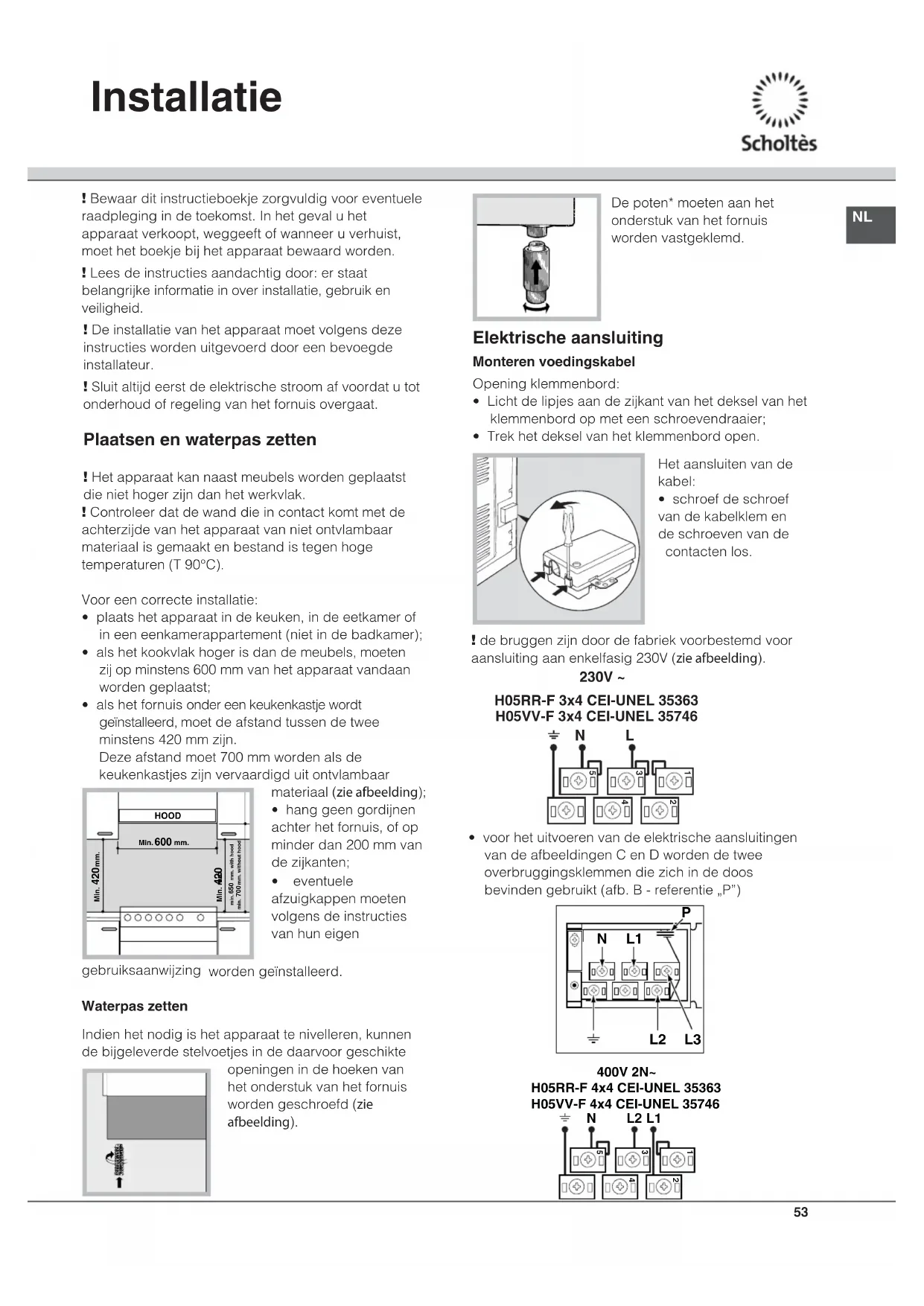 ! Bewaar dit instructieboekje zorgvuldig voor eventuele raadpleging in de toekomst. In het geval u het apparaat verkoopt, weggeeft of wanneer u verhuist, moet het boekje bij het apparaat bewaard worden. ! Lees de instructies aandachtig door: er staat belangrijke informatie in over installatie, gebruik en veiligheid. ! De installatie van het apparaat moet volgens deze instructies worden uitgevoerd door een bevoegde installateur. ! Sluit altijd eerst de elektrische stroom af voordat u tot onderhoud of regeling van het fornuis overgaat. Plaatsen en waterpas zetten ! Het apparaat kan naast meubels worden geplaatst die niet hoger zijn dan het werkvlak. ! Controleer dat de wand die in contact komt met de achterzijde van het apparaat van niet ontvlambaar materiaal is gemaakt en bestand is tegen hoge temperaturen (T 90°C). Voor een correcte installatie: