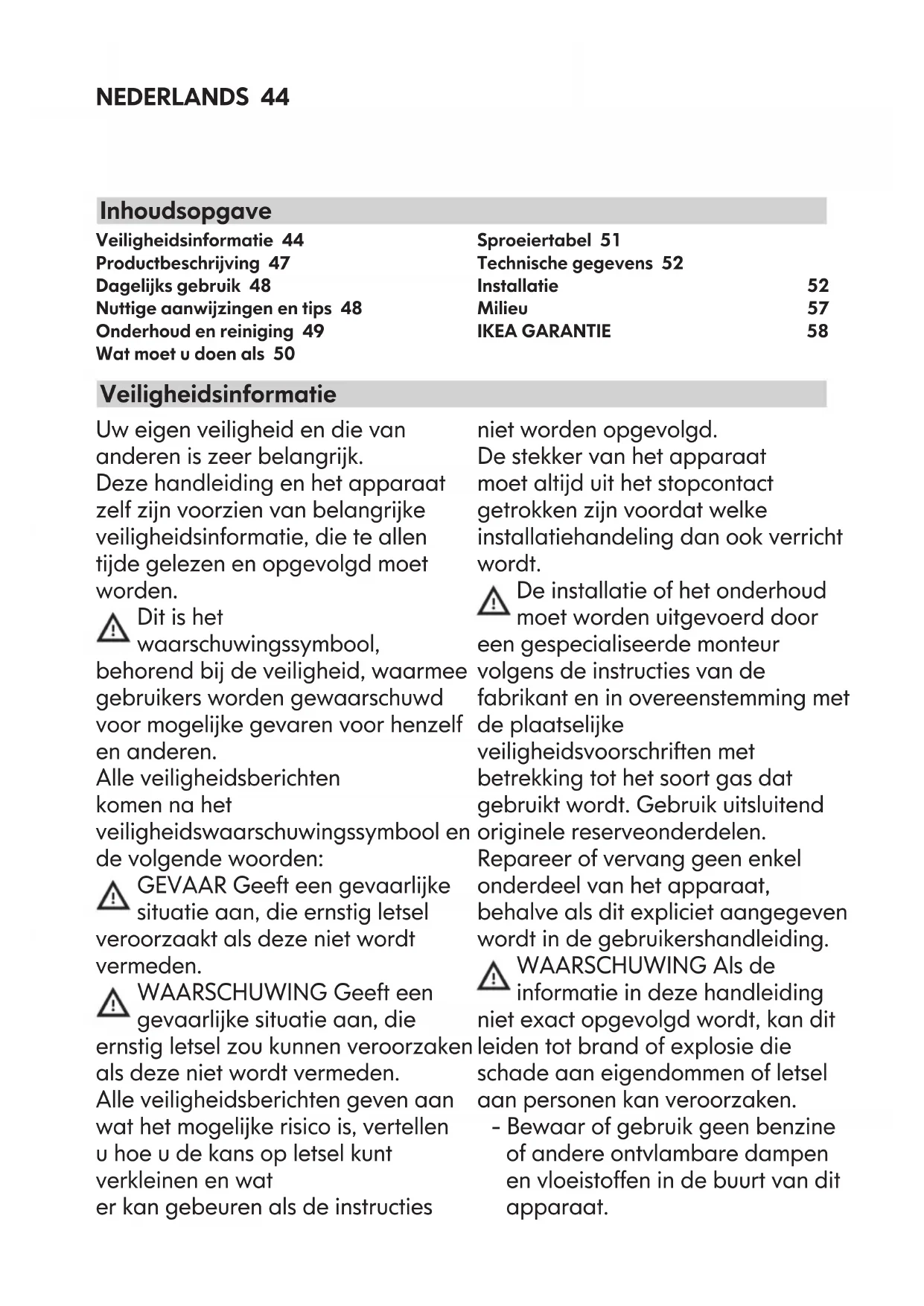 D’ACHAT ! La preuve de votre achat est nécessaire pour l’application de la garantie. Le nom et le numéro d’article (code à 8 chiffres) IKEA de chaque appareil acheté gurent également sur la preuve d’achat. Besoin d’une assistance supplémentaire ? Pour toute autre questions en dehors du service après-vente de vos appareils, contactez le call center de votre magasin IKEA. Nous vous recommandons de lire attentivement toute la documentation fournie avec l’appareil avant de nous contacter. Consultez la dernière page de ce manuel pour la liste complète des services Après-vente agréés IKEA avec leur numéro de téléphone respectifs.NEDERLANDS 44 Uw eigen veiligheid en die van anderen is zeer belangrijk. Deze handleiding en het apparaat zelf zijn voorzien van belangrijke veiligheidsinformatie, die te allen tijde gelezen en opgevolgd moet worden. Dit is het waarschuwingssymbool, behorend bij de veiligheid, waarmee gebruikers worden gewaarschuwd voor mogelijke gevaren voor henzelf en anderen. Alle veiligheidsberichten komen na het veiligheidswaarschuwingssymbool en de volgende woorden: GEVAAR Geeft een gevaarlijke situatie aan, die ernstig letsel veroorzaakt als deze niet wordt vermeden. WAARSCHUWING Geeft een gevaarlijke situatie aan, die ernstig letsel zou kunnen veroorzaken als deze niet wordt vermeden. Alle veiligheidsberichten geven aan wat het mogelijke risico is, vertellen u hoe u de kans op letsel kunt verkleinen en wat er kan gebeuren als de instructies niet worden opgevolgd. De stekker van het apparaat moet altijd uit het stopcontact getrokken zijn voordat welke installatiehandeling dan ook verricht wordt. De installatie of het onderhoud moet worden uitgevoerd door een gespecialiseerde monteur volgens de instructies van de fabrikant en in overeenstemming met de plaatselijke veiligheidsvoorschriften met betrekking tot het soort gas dat gebruikt wordt. Gebruik uitsluitend originele reserveonderdelen. Repareer of vervang geen enkel onderdeel van het apparaat, behalve als dit expliciet aangegeven wordt in de gebruikershandleiding. WAARSCHUWING Als de informatie in deze handleiding niet exact opgevolgd wordt, kan dit leiden tot brand of explosie die schade aan eigendommen of letsel aan personen kan veroorzaken. - Bewaar of gebruik geen benzine of andere ontvlambare dampen en vloeistoffen in de buurt van dit apparaat. Veiligheidsinformatie 44 Productbeschrijving 47 Dagelijks gebruik 48 Nuttige aanwijzingen en tips 48 Onderhoud en reiniging 49 Wat moet u doen als 50 Sproeiertabel 51 Technische gegevens 52 Installatie 52 Milieu 57 IKEA GARANTIE 58 Veiligheidsinformatie InhoudsopgaveNEDERLANDS 45 Wat moet u doen als u gas ruikt: - Probeer geen enkel apparaat in te schakelen. - Raak geen enkele elektrische schakelaar aan. - Gebruik geen enkele telefoon in uw woning. - Bel onmiddellijk uw gasleverancier met de telefoon van uw buren. Volg de instructies van uw gasleverancier. - Als u uw gasleverancier niet kunt bereiken, bel dan de brandweer. - Installatie en service moeten worden uitgevoerd door een gekwaliceerde installateur, servicecentrum of de gasleverancier. - Gebruik het apparaat alleen in goed geventileerde ruimtes. - De elektrische aansluiting en de gasaansluiting moeten voldoen aan de plaatselijke voorschriften. - Wanneer de kookplaat geïnstalleerd is, moet er een meerpolige contactschakelaar worden aangebracht met een opening tussen de contacten van minimaal 3 mm, die voor volledige afkoppeling zorgt. - De aarding van het apparaat is wettelijk verplicht. - Het netsnoer moet lang genoeg zijn om het apparaat, nadat het in zijn behuizing is geplaatst, aan te sluiten op het stopcontact - Gebruik alleen exibele of starre metalen leidingen voor de gasaansluiting. - Indien vervanging van het netsnoer noodzakelijk is, mag dit uitsluitend worden vervangen door een netsnoer dat dezelfde eigenschappen heeft als het oorspronkelijke snoer van de fabrikant (type H05V2V2-F 90°C of H05RR-F). Deze ingreep moet worden uitgevoerd door een gekwaliceerd technicus. - De fabrikant kan niet aansprakelijk worden gesteld voor letsel aan mensen of dieren, of voor materiële schade die ontstaat doordat niet aan deze eisen is voldaan. - Gebruik geen meervoudige adapters of verlengkabels. - Trek niet aan het netsnoer van het apparaat om het los te koppelen van de netvoeding. - Na de installatie mogen de elektrische onderdelen niet meer toegankelijk zijn voor de gebruiker. - Raak het apparaat niet aan met vochtige lichaamsdelen en gebruik het niet op als u op blote voeten loopt. - Deze kookplaat (klasse 3) is uitsluitend bedoeld voor huishoudelijk gebruik, voor het bereiden van voedsel. Gebruik dit apparaat nooit als verwarming om de ruimte te verwarmen. Dit kan leiden tot koolmonoxidevergiftiging enNEDERLANDS 46 oververhitting van de kookplaat. - De fabrikant kan niet aansprakelijk gesteld worden voor schade die het gevolg is van oneigenlijk gebruik of een onjuiste instelling van de bedieningsknoppen. - Het apparaat en de toegankelijke onderdelen ervan worden heet tijdens gebruik. Zorg ervoor dat u de verwarmingselementen niet aanraakt. Kinderen jonger dan 8 jaar moeten uit de buurt worden gehouden, tenzij ze voortdurend onder toezicht staan. Dit apparaat mag gebruikt worden door kinderen ouder dan 8 jaar en personen met beperkte lichamelijke, zintuiglijke of verstandelijke vermogens of gebrek aan ervaring en kennis als zij onder toezicht staan of aanwijzingen hebben gekregen met betrekking tot het op veilige wijze gebruiken van het apparaat en de bijbehorende gevaren begrijpen. Zij mogen niet met het apparaat spelen. Reinigings- en onderhoudswerkzaamheden mogen niet door kinderen zonder toezicht worden uitgevoerd. - Als een apparaat op gas wordt gebruikt, wordt in de ruimte warmte en vochtige lucht geproduceerd. Verzeker u ervan dat er in de ruimte voldoende ventilatie aanwezig is of laat er een afzuigkap met een afvoerpijp installeren. - Huisdieren moeten uit de buurt van het apparaat geho