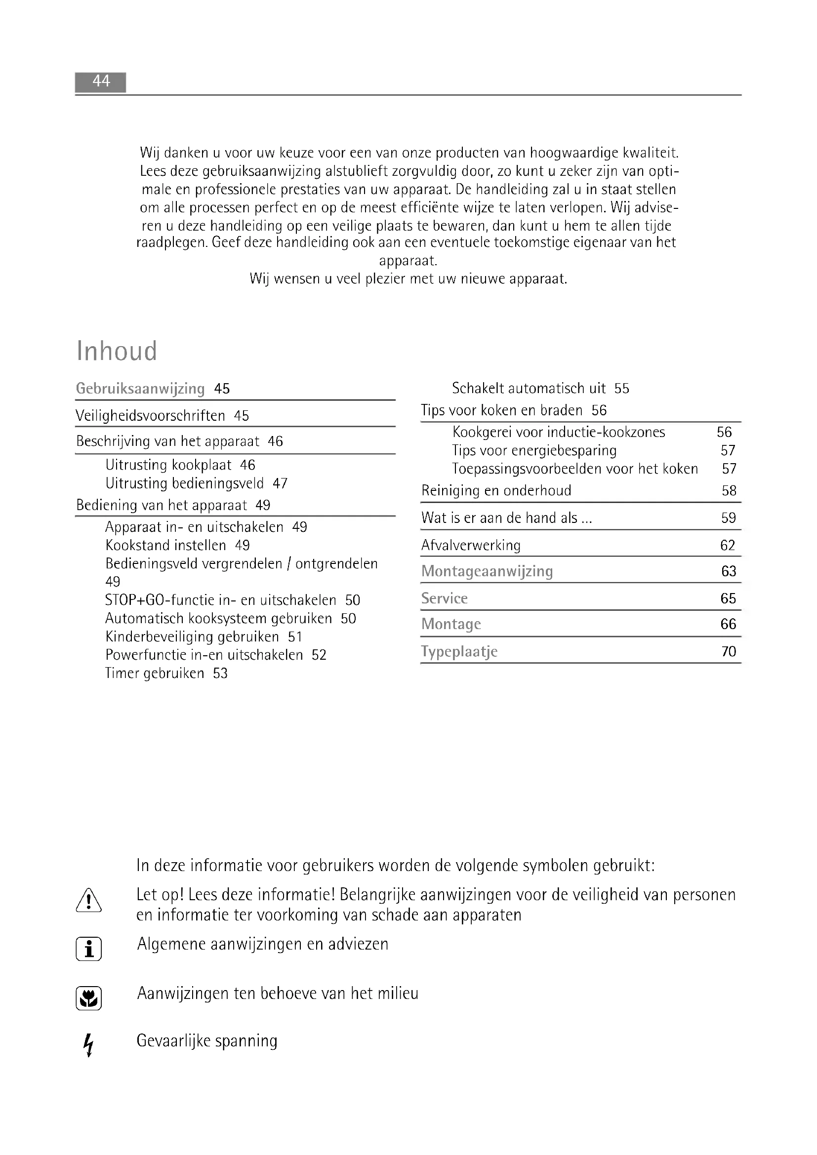 STOP+GO-functie in- en uitschakelen 50 Automatisch kooksysteem gebruiken 50 Kinderbeveiliging gebruiken 51 Powerfunctie in-en uitschakelen 52 Timer gebruiken 53 Schakelt automatisch uit 55 Tips voor koken en braden 56 Kookgerei voor inductie-kookzones 56 Tips voor energiebesparing 57 Toepassingsvoorbeelden voor het koken 57 Reiniging en onderhoud 58 Wat is er aan de hand als … 59 Afvalverwerking 62 Montageaanwijzing 63 Service 65 Montage 66 Typeplaatje 70 Wij danken u voor uw keuze voor een van onze producten van hoogwaardige kwaliteit. Lees deze gebruiksaanwijzing alstublieft zorgvuldig door, zo kunt u zeker zijn van opti- male en professionele prestaties van uw apparaat. De handleiding zal u in staat stellen om alle processen perfect en op de meest efficiënte wijze te laten verlopen. Wij advise- ren u deze handleiding op een veilige plaats te bewaren, dan kunt u hem te allen tijde raadplegen. Geef deze handleiding ook aan een eventuele toekomstige eigenaar van het apparaat. Wij wensen u veel plezier met uw nieuwe apparaat. In deze informatie voor gebruikers worden de volgende symbolen gebruikt: