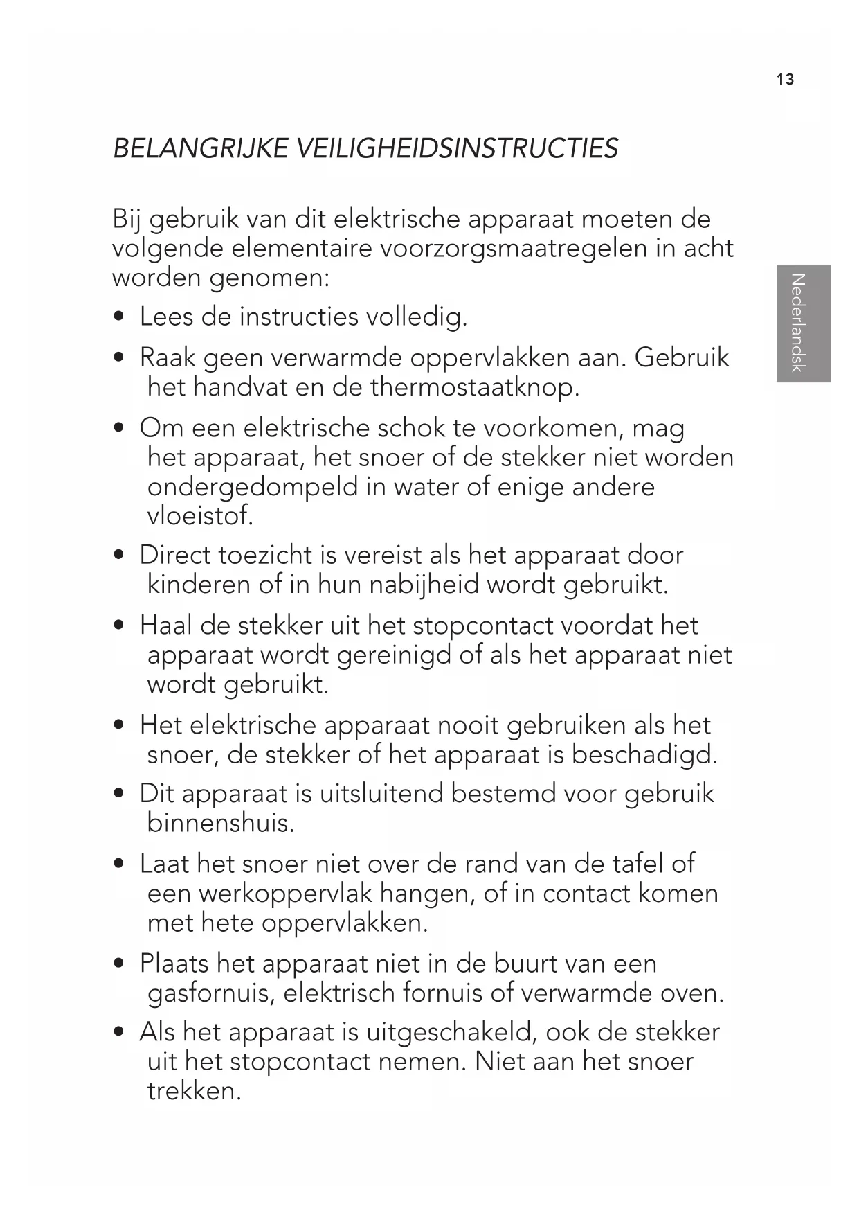 BELANGRIJKE VEILIGHEIDSINSTRUCTIES Bij gebruik van dit elektrische apparaat moeten de volgende elementaire voorzorgsmaatregelen in acht worden genomen: