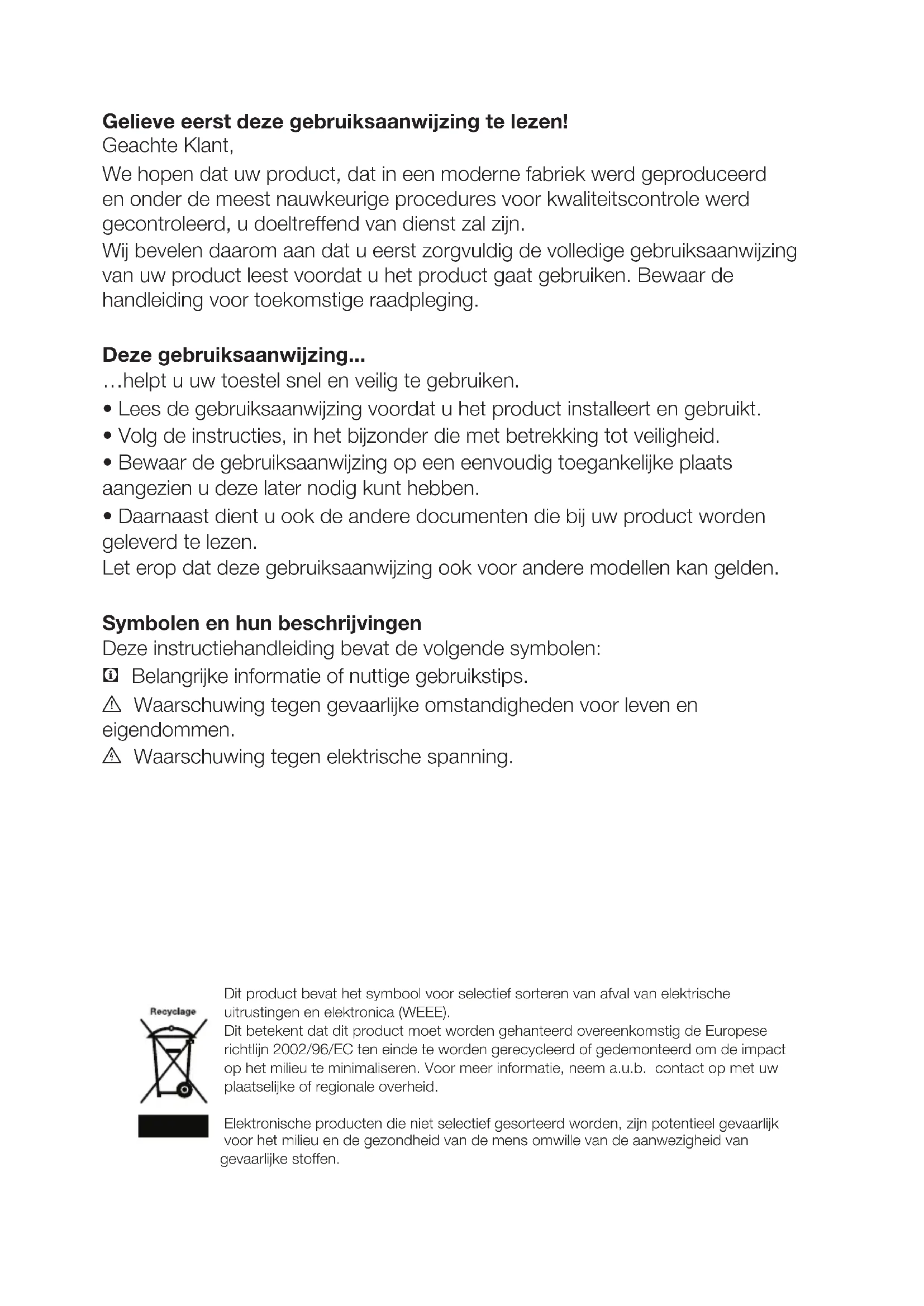 - Daarnaast dient u ook de andere documenten die bij uw product worden geleverd te lezen. Let erop dat deze gebruiksaanwijzing ook voor andere modellen kan gelden. Symbolen en hun beschrijvingen Deze instructiehandleiding bevat de volgende symbolen: C Belangrijke informatie of nuttige gebruikstips. A Waarschuwing tegen gevaarlijke omstandigheden voor leven en eigendommen. B Waarschuwing tegen elektrische spanning. Dit product bevat het symbool voor selectief sorteren van afval van elektrische uitrustingen en elektronica (WEEE). Dit betekent dat dit product moet worden gehanteerd overeenkomstig de Europese richtlijn 2002/96/EC ten einde te worden gerecycleerd of gedemonteerd om de impact op het milieu te minimaliseren. Voor meer informatie, neem a.u.b. contact op met uw plaatselijke of regionale overheid. Elektronische producten die niet selectief gesorteerd worden, zijn potentieel gevaarlijk voor het milieu en de gezondheid van de mens omwille van de aanwezigheid van gevaarlijke stoffen.FL