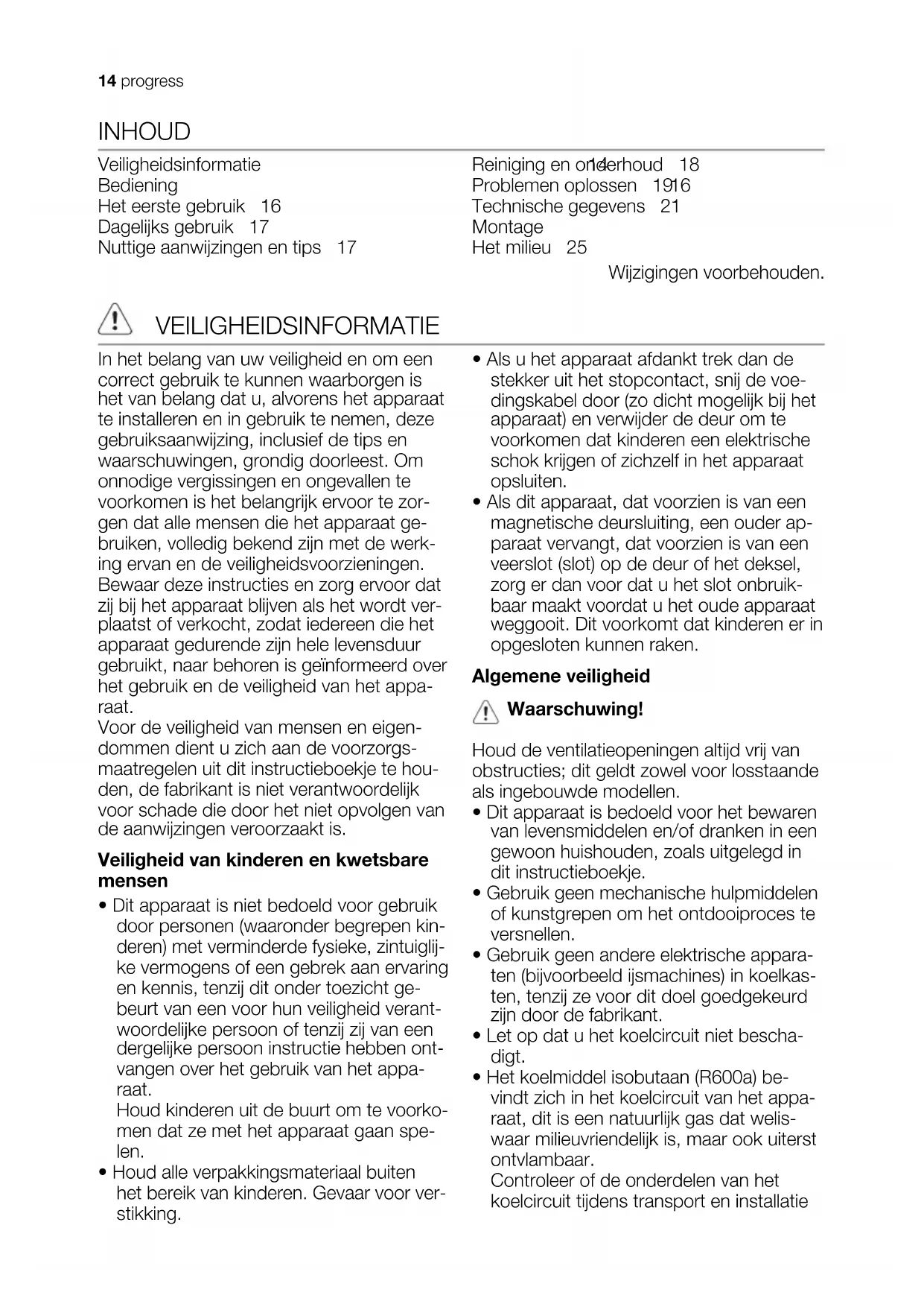 Das Symbol auf dem Produkt oder seiner Verpackung weist darauf hin, dass dieses Produkt nicht als normaler Haushaltsabfall zu behandeln ist, sondern an einem Sammelpunkt für das Recycling von elektrischen und elektronischen Geräten abgegeben werden muss. Durch Ihren Beitrag zum korrekten Entsorgen dieses Produkts schützen Sie die Umwelt und die Gesundheit Ihrer Mitmenschen. Umwelt und Gesundheit werden durch falsches Entsorgen gefährdet. Weitere Informationen über das Recycling dieses Produkts erhalten Sie von Ihrer Gemeinde, Ihrer Müllabfuhr oder dem Geschäft, in dem Sie das Produkt gekauft haben. progress 13INHOUD Veiligheidsinformatie 14 Bediening 16 Het eerste gebruik 16 Dagelijks gebruik 17 Nuttige aanwijzingen en tips 17 Reiniging en onderhoud 18 Problemen oplossen 19 Technische gegevens 21 Montage 21 Het milieu 25 Wijzigingen voorbehouden. VEILIGHEIDSINFORMATIE In het belang van uw veiligheid en om een correct gebruik te kunnen waarborgen is het van belang dat u, alvorens het apparaat te installeren en in gebruik te nemen, deze gebruiksaanwijzing, inclusief de tips en waarschuwingen, grondig doorleest. Om onnodige vergissingen en ongevallen te voorkomen is het belangrijk ervoor te zor- gen dat alle mensen die het apparaat ge- bruiken, volledig bekend zijn met de werk- ing ervan en de veiligheidsvoorzieningen. Bewaar deze instructies en zorg ervoor dat zij bij het apparaat blijven als het wordt ver- plaatst of verkocht, zodat iedereen die het apparaat gedurende zijn hele levensduur gebruikt, naar behoren is geïnformeerd over het gebruik en de veiligheid van het appa- raat. Voor de veiligheid van mensen en eigen- dommen dient u zich aan de voorzorgs- maatregelen uit dit instructieboekje te hou- den, de fabrikant is niet verantwoordelijk voor schade die door het niet opvolgen van de aanwijzingen veroorzaakt is. Veiligheid van kinderen en kwetsbare mensen